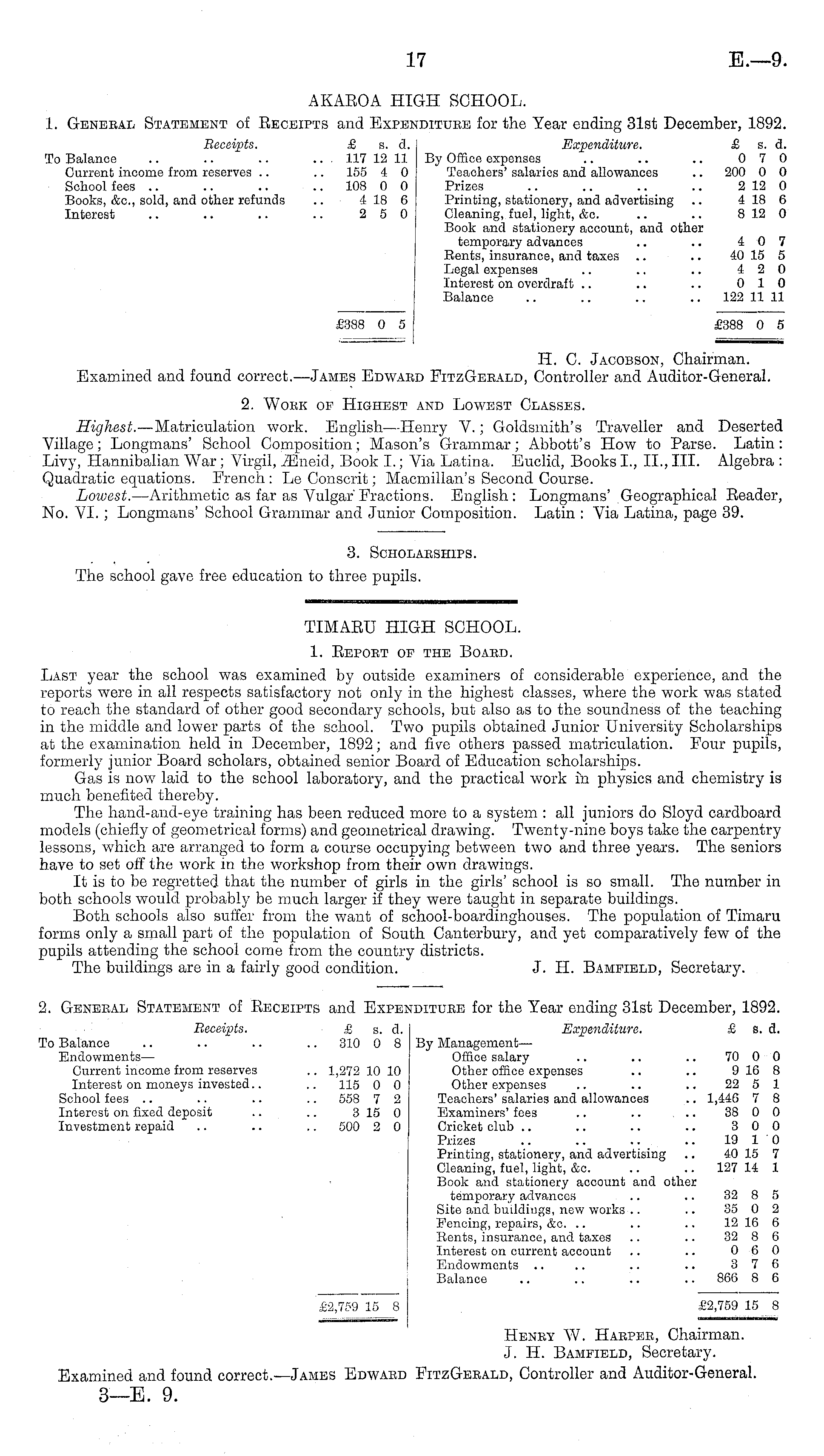 TIMABU HIGH SCHOOL. 1. Beport of the Board. Last year the school was examined by outside examiners of considerable experience, and the reports were in all respects satisfactory not only in the highest classes, where the work was stated to reach the standard of other good secondary schools, but also as to the soundness of the teaching in the middle and lower parts of the school. Two pupils obtained Junior University Scholarships at the examination held in December, 1892; and five others passed matriculation. Four pupils, formerly junior Board scholars, obtained senior Board of Education scholarships. Gas is now laid to the school laboratory, and the practical work in physics and chemistry is much benefited thereby. The hand-and-eye training has been reduced more to a system : all juniors do Sloyd cardboard models (chiefly of geometrical forms) and geometrical drawing. Twenty-nine boys take the carpentry lessons, which are arranged to form a course occupying between two and three years. The seniors have to set off the work in the workshop from their own drawings. It is to be regretted that the number of girls in the girls' school is so small. The number in both schools would probably be much larger if they were taught in separate buildings. Both schools also suffer from the want of school-boardinghouses. The population of Timaru forms only a small part of the population of South Canterbury, and yet comparatively few of the pupils attending the school come from the country districts. The buildings are in a fairly good condition. J. H. Bampield, Secretary. 2. General Statement of Beceipts and Expenditure for the Year ending 31st December, 1892. Receipts. £ s. d. Expenditure. £ s. d. To Balance .. .. .. .. 310 0 8 By Management— Endowments — Office salary .. .. .. 70 0 0 Current income from reserves .. 1,272 10 10 Other office expenses .. .. 9 16 8 Interest on moneys invested.. .. 115 0 0 Other expenses .. .. .. 22 5 1 School fees .. .. .. .. 558 7 2 Teachers' salaries and allowances .. 1,446 7 8 Interest on fixed deposit .. .. 315 0 Examiners' foes .. .. .. 38 0 0 Investment repaid .. .. .. 500 2 0 Cricket club .. .. .. .. 3 0 0 Prizes .. .. .. .. 19 1 0 Printing, stationery, and advertising .. 40 15 7 Cleaning, fuel, light, &c. .. .. 127 14 1 Book and stationery account and other temporary advances .. .. 32 8 5 Site and buildings, new works .. .. 35 0 2 Fencing, repairs, &c. .. .. .. 12 16 6 Rents, insurance, and taxes .. .. 32 8 6 Interest on current account .. .. 0 6 0 Endowments .. .. .. .. 3 7 6 Balance .. .. .. .. 866 8 6 £2,759 15 8 £2,759 15 8 Henry W. Harper, Chairman. J. 11. Bamfield, Secretary. Examined and found correct. —James Edward FitzGerald, Controller and Auditor-General. 3—E. 9.