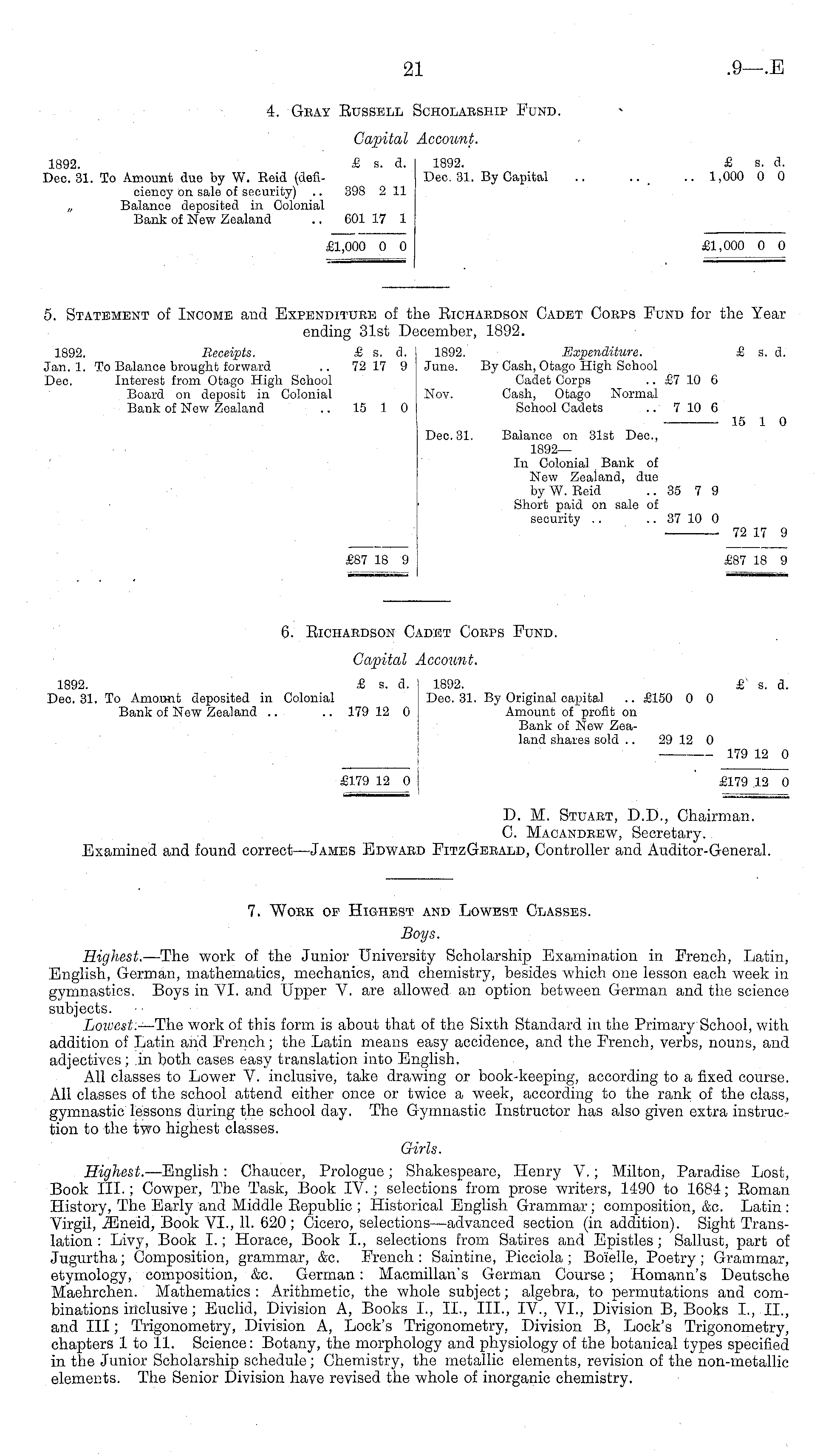 6. Bichardson Cadet Corps Fund. Capital Account. 1892. £ s. d. I 1892. £ s. d. Dec. 31. To Amount deposited in Colonial j Dec. 31. By Original capital .. £150 0 0 Bank of New Zealand .. .. 179 12 0 Amount of profit on Bank of New Zealand shares sold .. 29 12 0 179 12 0 £179 12 0 £179 12 0 D. M. Stuart, D.D., Chairman. C. Macandrew, Secretary.. Examined and found correct—James Edward FitzGerald, Controller and Auditor-General. 7. Work of Highest and Lowest Classes. Boys. Highest. —The work of the Junior University Scholarship Examination in French, Latin, English, German, mathematics, mechanics, and chemistry, besides which one lesson each week in gymnastics. Boys in VI. and Upper V. are allowed an option between German and the science subjects. Lowest. —The work of this form is about that of the Sixth Standard in the Primary School, with addition of Latin and French; the Latin means easy accidence, and the French, verbs, nouns, and adjectives ; in both cases easy translation into English. All classes to Lower V. inclusive, take drawing or book-keeping, according to a fixed course. All classes of the school attend either once or twice a week, according to the rank of the class, gymnastic lessons during the school day. The Gymnastic Instructor has also given extra instruction to the two highest classes. Girls. Highest. —English.: Chaucer, Prologue; Shakespeare, Henry V.; Milton, Paradise Lost, Book III.; Cowper, The Task, Book IV. ; selections from prose writers, 1490 to 1684; Boman History, The Early and Middle Bepublic ; Historical English Grammar; composition, &c. Latin: Virgil, iEneid, Book VI., 11. 620 ; Cicero, selections—advanced section (in addition). Sight Translation : Livy, Book I.; Horace, Book 1., selections from Satires and Epistles; Sallust, part of Jugurtha; Composition, grammar, &c. French : Saintine, Picciola; Boielle, Poetry ; Grammar, etymology, composition, &c. German : Macmillan's German Course; Homann's Deutsche Maehrchen. Mathematics : Arithmetic, the whole subject; algebra, to permutations and combinations inclusive; Euclid, Division A, Books 1., 11., 111., IV., VI., Division B, Books 1., 11., and III; Trigonometry, Division A, Lock's Trigonometry, Division B, Lock's Trigonometry, chapters Ito 11. Science: Botany, the morphology and physiology of the botanical types specified in the Junior Scholarship schedule ; Chemistry, the metallic elements, revision of the non-metallic elements. The Senior Division have revised the whole of inorganic chemistry.