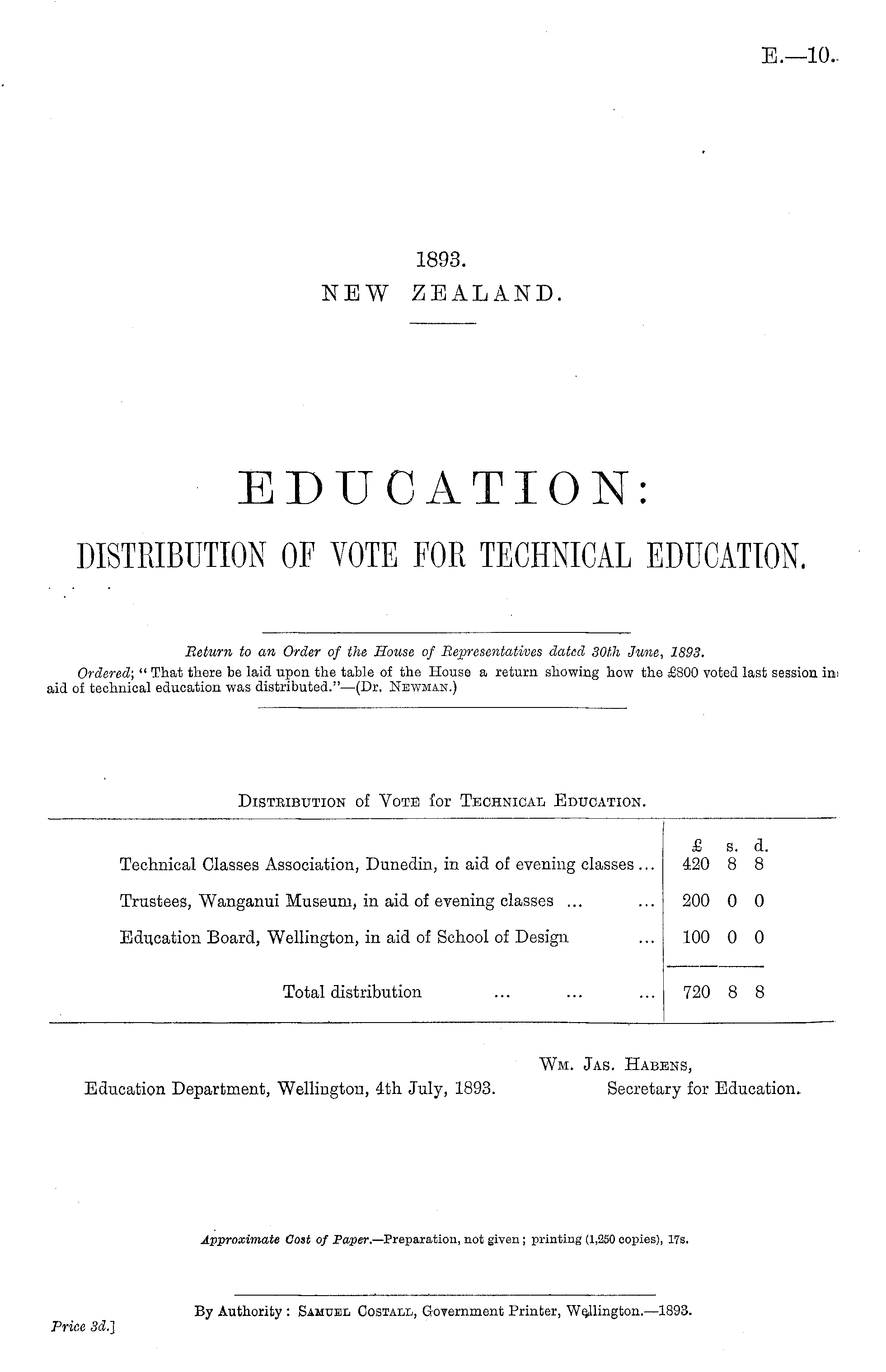Wm. Jas. Habens, Education Department, Wellington, 4th July, 1893. Secretary for Education.