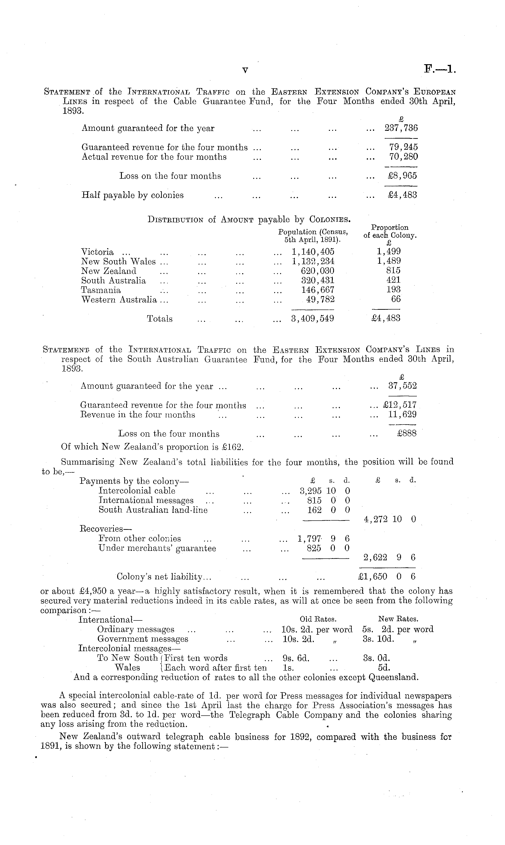 Statement of the International Traffic on the Eastern Extension Company's European Lines in respect of the Cable Guarantee Fund, for the Four Months ended 30th April, 1893. £ Amount guaranteed for the year ... ... ... ... 237,736 Guaranteed revenue for the four months ... ... ... ... 79,245 Actual revenue for the four months ... ... ... ... 70,280 Loss on the four months ... ... ... ... £8,965 Half payable by colonies ... ... ... ... ... £4,483 Distribution of Amount payable by Colonies. Population (Census, , e a C h°CoTonv sth April, 1891). 0I eacn £^ olon yVictoria ... ... ... ... ... 1,140,405 1,499 New South Wales ... ... ... ... 1,132,234 1,489 New Zealand ... ... ... ... 620,030 815 South Australia ... ... ... ... 320,431 421 Tasmania ... ... ... ... 146,667 193 Western Australia... ... ... ... 49,782 66 Totals ... ... ... 3,409,549 £4,483 Statement- of the International Traffic on the Eastern Extension Company's Lines in respect of the South Australian Guarantee Fund, for the Four Months ended 30th April, 1893. £ Amount guaranteed for the year ... ... ... ... ... 37,552 Guaranteed revenue for the four months ... ... ... ... £12,517 Eevenue in the four months ... ... ... ... ... 11,629 Loss on the four months ... ... ... ... £888 Of which New Zealand's proportion is £162. Summarising New Zealand's total liabilities for the four months, the position will be found to be, — Payments by the colony — £ s. d. £ s. d. Intercolonial cable ... ... ... 3,295 10 0 International messages ... ... . . 815 0 0 South Australian land-line ... ... 162 0 0 4,272 10 0 Eecoveries—■ From other colonies ... ... ... 1,797 9 6 Under merchants' guarantee ... ... 825 0 0 2,622 9 6 Colony's net liability... ... ... ... £1,650 0 6 or about £4,950 a year—a highly satisfactory result, when it is remembered that the colony has secured very material reductions indeed in its cable rates, as will at once be seen from the following comparison:— International— Old Rates. New Rates. Ordinary messages ... ... ... 10s. 2d. per word ss. 2d. per word Government messages ... ... 10s. 2d. „ 3s. lOd. „ Intercolonial messages— To New South| First ten words ... 9s. 6d. ... 3s. Od. Wales j Each word after first ten Is. ... sd. And a corresponding reduction of rates to all the other colonies except Queensland. A special intercolonial cable-rate of Id. per word for Press messages for individual newspapers was also secured; and since the Ist April last the charge for Press Association's messages has been reduced from 3d. to Id. per word—the Telegraph Cable Company and the colonies sharing any loss arising from the reduction. New Zealand's outward telegraph cable business for 1892, compared with the business for 1891, is shown by the following statement: —