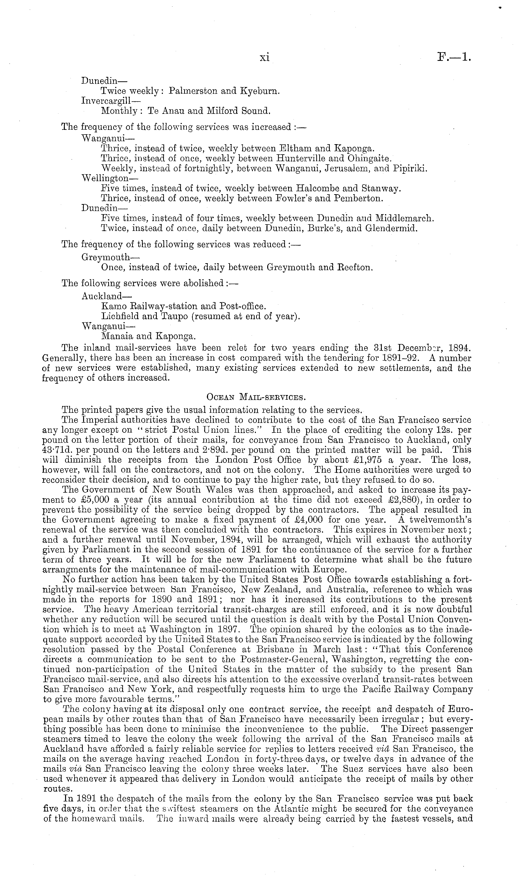 Dunedin— Twice weekly : Palmerston and Kyeburn. Invercargill— Monthly : Te Anau and Milford Sound. The frequency of the following services was increased : — Wanganui— Thrice, instead of twice, weekly between Eltham and Kaponga. Thrice, instead of once, weekly between Hunterville and Ohingaite. Weekly, instead of fortnightly, between Wanganui, Jerusalem, and Pipiriki. Wellington— Five times, instead of twice, weekly between Halcombe and Stanway. Thrice, instead of once, weekly between Fowler's and Pemberton. Dunedin— Five times, instead of four times, weekly between Dunedin aud Middlemarch. Twice, instead of once, daily between Dunedin, Burkes, and Glendermicl. The frequency of the following services was reduced : — Greymouth— Once, instead of twice, daily between Greymouth and Eeefton. The following services were abolished : — Auckland— Kamo Eailway-station and Post-office. Lichfield and Taupo (resumed at end of year). Wanganui— Manaia and Kaponga. The inland mail-services have been relet for two years ending the 31st December, 1894. Generally, there has been an increase in cost compared with the tendering for 1891-92. A number of new services were established, many existing services extended to new settlements, and the frequency of others increased. Ocean Mail-services. The printed papers give the usual information relating to the services. The Imperial authorities have declined to contribute to the cost of the San Francisco service any longer except on "strict Postal Union lines." In the place of crediting the colony 12s. per pound on the letter portion of their mails, for conveyance from San Francisco to Auckland, only 43-71 d. per pound on the letters and 2-89 d. per pound on the printed matter will be paid. This will diminish the receipts from the London Post Office by about £1,975 a year. The loss, however, will fall on the contractors, and not on the colony. The Home authorities were urged to reconsider their decision, and to continue to pay the higher rate, but they refused, to do so. The Government of New South Wales was then approached, and asked to increase its payment to £5,000 a year (its annual contribution at the time did not exceed £2,880), in order to prevent the possibility of the service being dropped by the contractors. The appeal resulted in the Government agreeing to make a fixed payment of £4,000 for one year. A twelvemonth's renewal of the service was then concluded with the contractors. This expires in November next; and a further renewal until November, 1894, will be arranged, which will exhaust the authority given by Parliament in the second session of 1891 for the continuance of the service for a further term of three years. It will be for the new Parliament to determine what shall be the future arrangments for the maintenance of mail-communication with Europe. No further action has been taken by the United States Post Office towards establishing a fortnightly mail-service between San Francisco, New Zealand, and Australia, reference to which was made in the reports for 1890 and 1891; nor has it increased its contributions to the present service. The heavy American territorial transit-charges are still enforced, and it is now doubtful whether any reduction will be secured until the question is dealt with by the Postal Union Convention which is to meet at Washington in 1897. The opinion shared by the colonies as to the inadequate support accorded by the United States to the San Francisco service is indicated by the following resolution passed by the Postal Conference at Brisbane in March last: "That this Conference directs a communication to be sent to the Postmaster-General, Washington, regretting the continued non-participation of the United States in the matter of the subsidy to the present San Francisco mail-service, and also directs his attention to the excessive overland transit-rates between San Francisco and New York, and respectfully requests him to urge the Pacific Eailway Company to give more favourable terms." The colony having at its disposal only one contract service, the receipt and despatch of European mails by other routes than that of San Francisco have necessarily been irregular; but everything possible has been done to minimise the inconvenience to the public. The Direct passenger steamers timed to leave the colony the week following the arrival of the San Francisco mails at Auckland have afforded a fairly reliable service for replies to letters received vid San Francisco, the mails on the average having reached London in forty-three- days, or twelve days in advance of the mails vid San Francisco leaving the colony three weeks later. The Suez services have also been used whenever it appeared that delivery in London would anticipate the receipt of mails by other routes. In 1891 the despatch of the mails from the colony by the San Francisco service was put back five days, in order that the swiftest steamers on the Atlantic might be secured for the conveyance of the homeward mails. The inward mails were already being carried by the fastest vessels, and