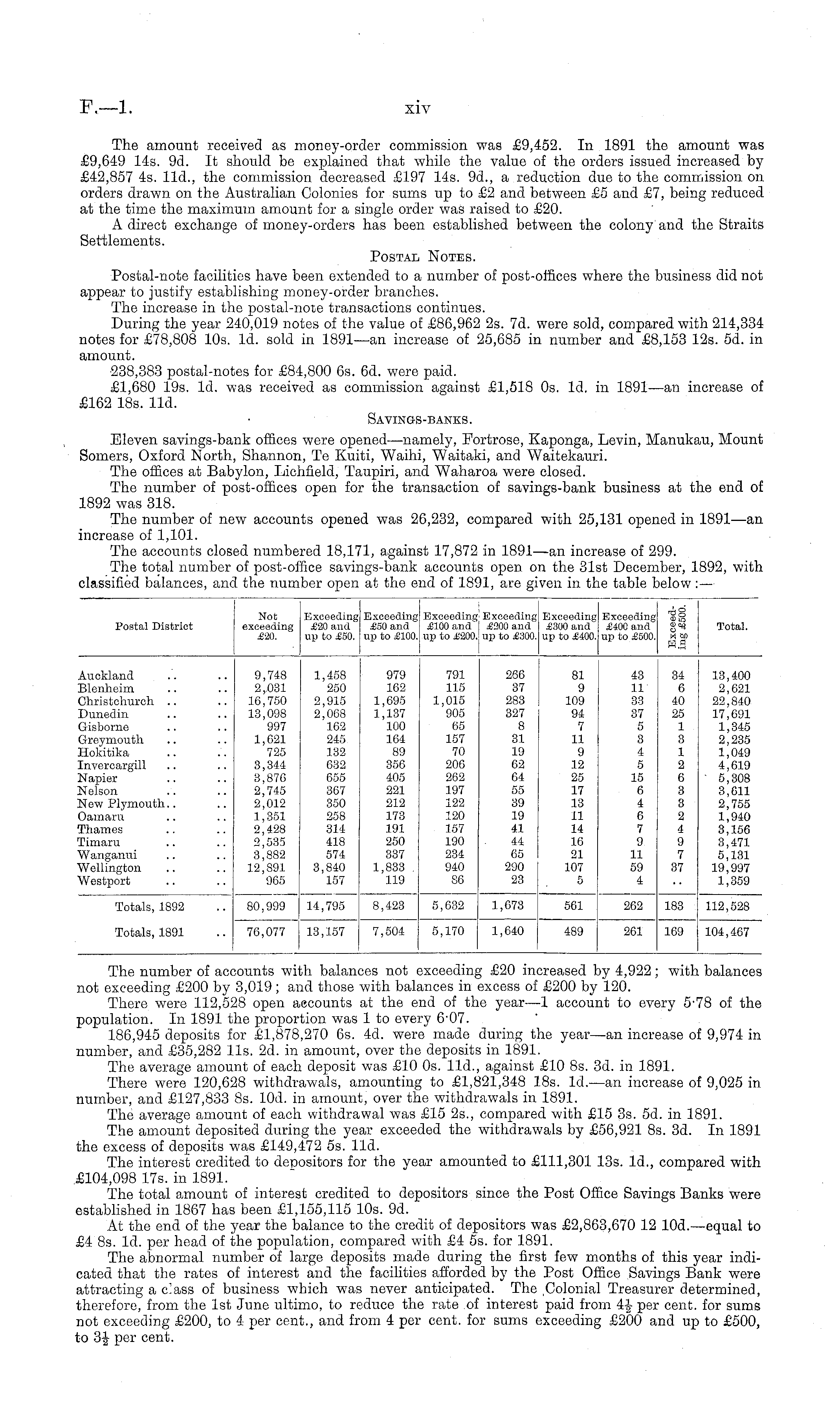 Postal District Not Exceeding exceeding £20 and £20. up to £50. Exceeding £S0 and up to £100. Exceeding £100 and' I up to £wo: Exceeding £200 and up to £300. Exceeding £300 and up to £400. Exceeding! £400 and up to £500. H.S Total. Auckland Blenheim Christchurch .. Duncdin Gtisborne Greymouth Hokitika Inveroargill Napier Nelson New Plymouth.. Oam aru Thames Timaru 9,748 2,031 16,750 13,098 997 1,021 725 3,344 3,876 2,745 2,012 1,351 2,428 2,535 3,882 12,891 965 1,458 250 2,915 2,008 162 245 132 632 655 367 350 258 314 418 574 3,840 157 979 162 1,695 1,137 100 164 89 356 405 221 212 173 191 250 337 1,833 119 791 115 1,015 905 05 157 70 206 262 197 122 120 157 190 234 940 86 2G6 37 283 327 8 31 19 62 64 55 39 19 41 44 65 290 23 81 9 109 94 7 11 9 12 25 17 13 11 14 16 21 107 5 43 11 33 37 5 3 4 5 15 6 4 6 7 9 11 59 4 34 6 40 25 1 3 1 2 6 3 3 2 4 9 7 37 13,400 2,621 22,840 17,691 1,345 2,235 1,049 4,619 5,308 3,611 2,755 1,940 3,156 3,471 5,131 19,997 1,359 Wangamii Wellington Westport 14,795 Totals, 1892 80,999 8,423 5,632 1,673 561 262 183 112,528 Totals, 1891 76,077 13,157 7,504 5,170 1,640 489 261 169 104,467