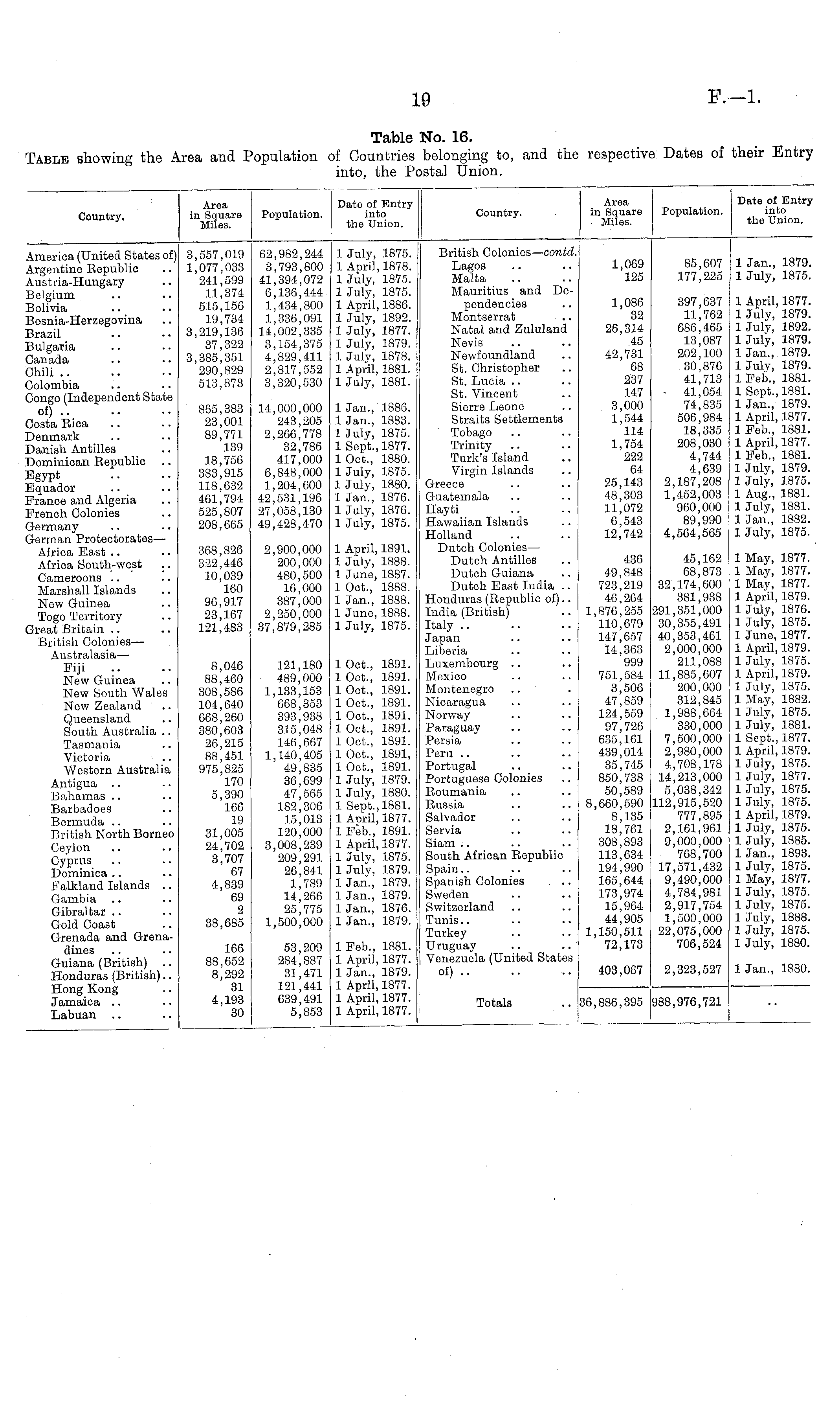 Table No. 16. Table showing the Area and Population of Countries belonging to, and the respective Dates of their Entry into, the Postal Union.