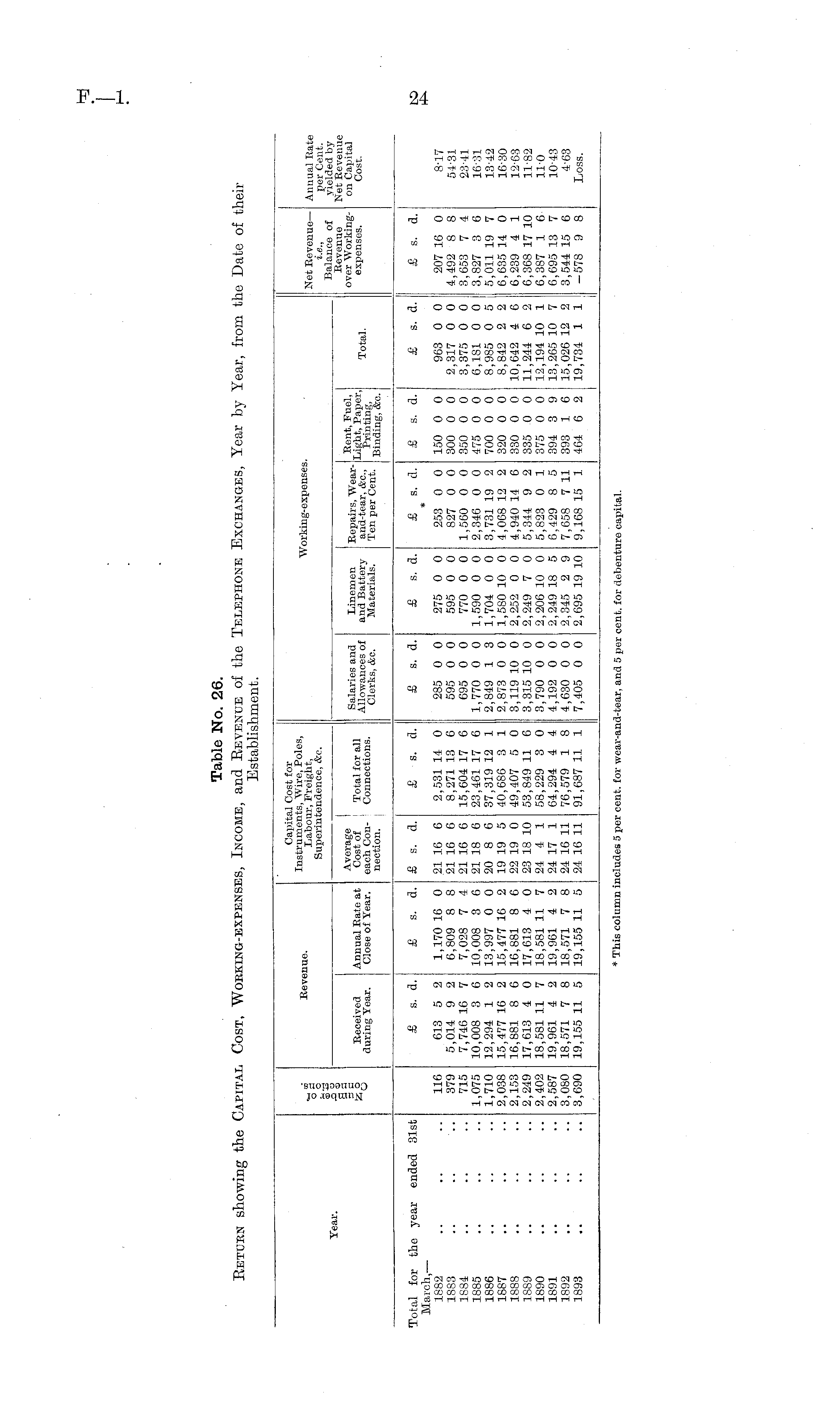 Table No. 26. Return showing the Capital Cost, Working-expenses, Income, and Revenue of the Telephone Exchanges, Year by Year, from the Date of their Establishment.