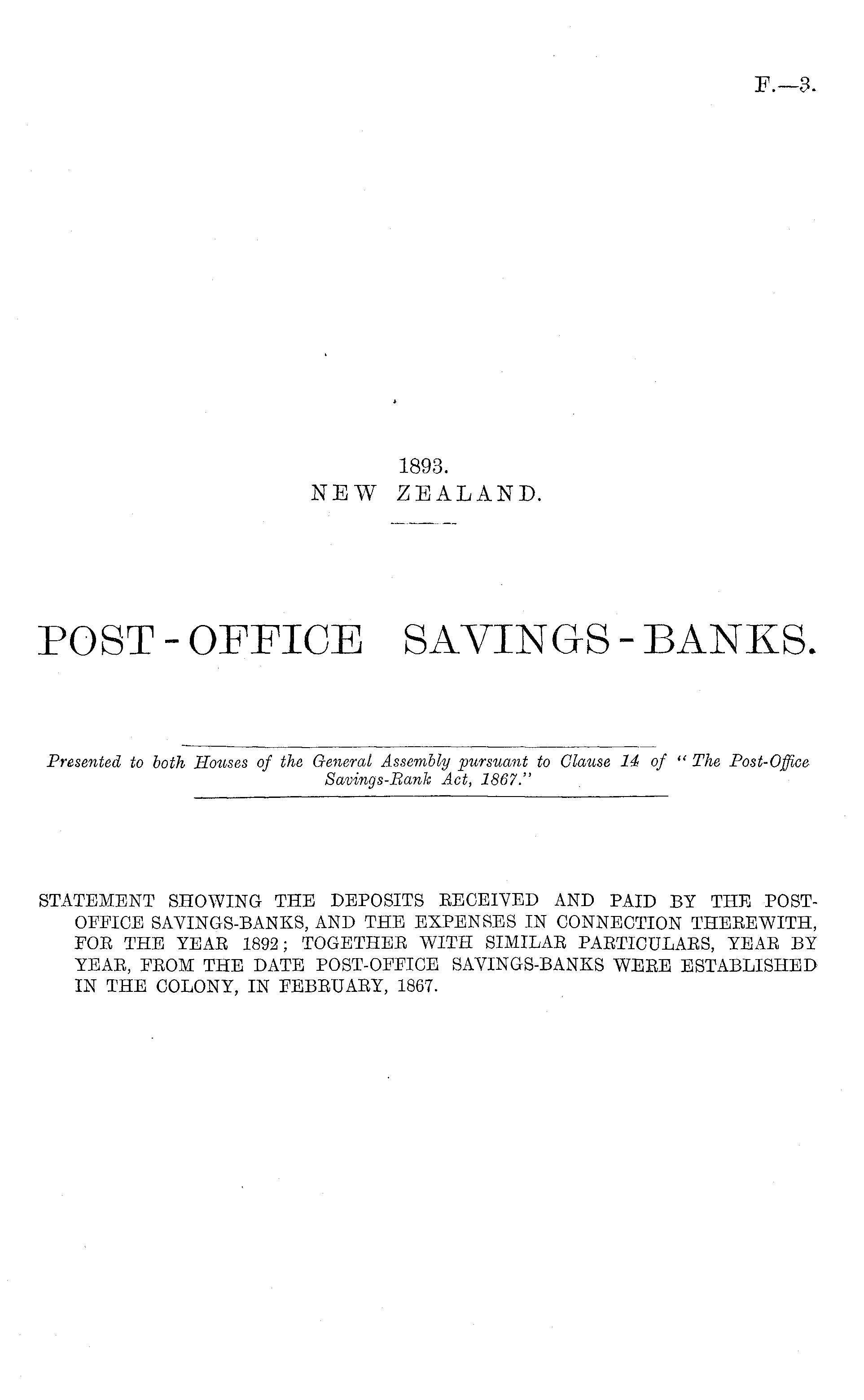 STATEMENT SHOWING THE DEPOSITS EECEIYED AND PAID BY THE POSTOFFICE SAVINGS-BANKS, AND THE EXPENSES IN CONNECTION THEEEWITH, FOE THE YEAE 1892; TOGETHEE WITH SIMILAE PAETICULAES, YEAE BY YEAE, EEOM THE DATE POST-OFFICE SAVINGS-BANKS WEEE ESTABLISHED IN THE COLONY, IN FEBEUAEY, 1867.