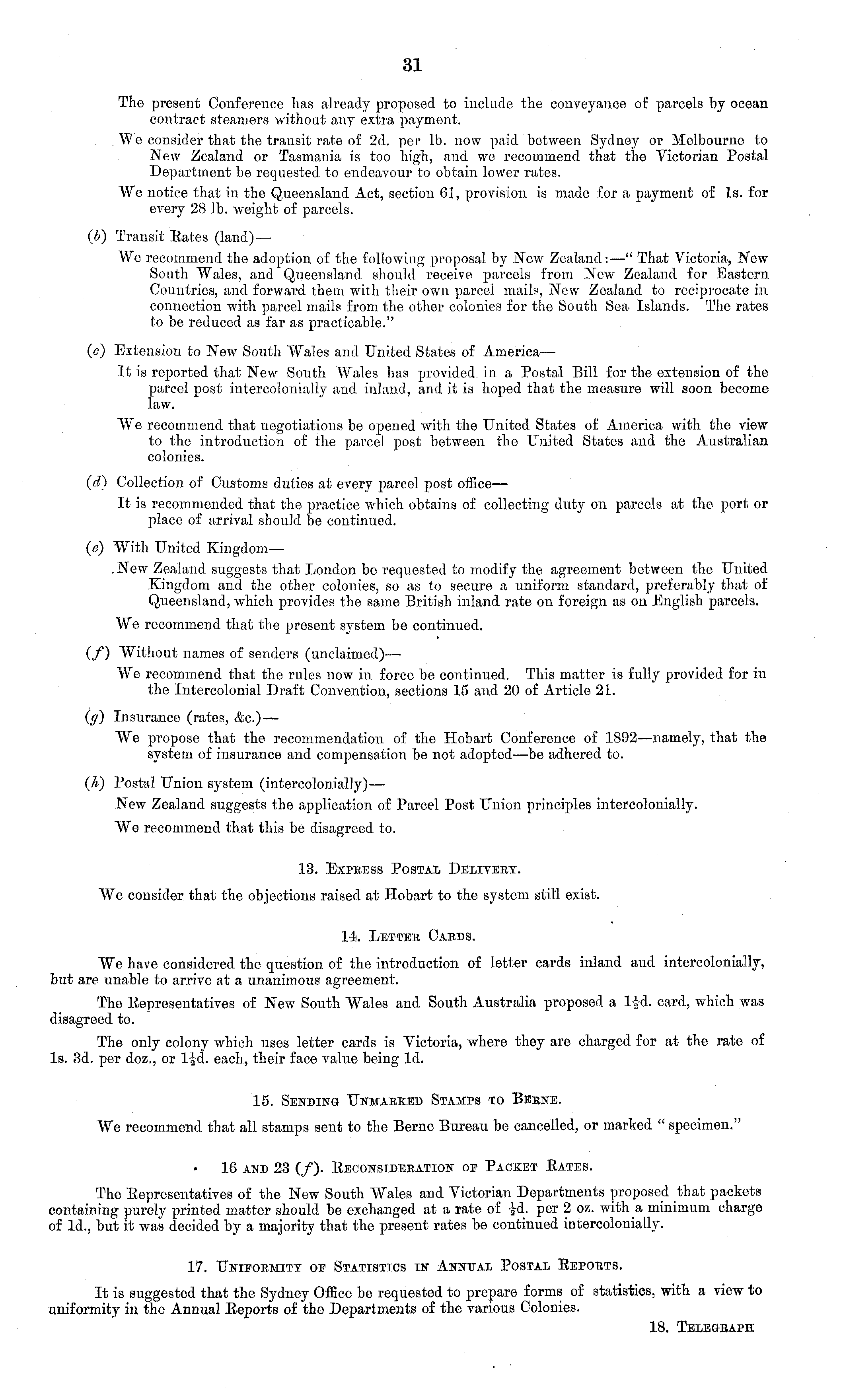 The present Conference has already proposed to include the conveyance of parcels by ocean contract steamers without any extra payment. .We consider that the transit rate of 2d. per lb. now paid between Sydney or Melbourne to New Zealand or Tasmania is too high, and we recommend that the Victorian Postal Department be requested to endeavour to obtain lower rates. We notice that in the Queensland Act, section 63, provision is made for a payment of Is. for every 28 lb. weight of parcels. (b) Transit Rates (land) — We recommend the adoption of the following proposal by New Zealand: —" That Victoria, New South Wales, and Queensland should receive parcels from New Zealand for Eastern Countries, and forward them with their own parcel mails, New Zealand to reciprocate in connection with parcel mails from the other colonies for the South Sea Islands. The rates to be reduced as far as practicable." (c) Extension to New South Wales and United States of America — It is reported that New South Wales has provided in a Postal Bill for the extension of the parcel post intercolonially and inland, and it is hoped that the measure will soon become law. We recommend that negotiations be opened with the United States of America with the view to the introduction of the parcel post between the United States and the Australian colonies. (d) Collection of Customs duties at every parcel post office — It is recommended that the practice which obtains of collecting duty on parcels at the port or place of arrival should be continued. (c) With United Kingdom — .New Zealand suggests that London bo requested to modify the agreement between tho United Kingdom and the other colonies, so as to secure a uniform standard, preferably that of Queensland, which provides the same British inland rate on foreign as on English parcels. We recommend that the present system be continued. (f) Without names of senders (unclaimed) — We recommend that the rules now in force be continued. This matter is fully provided for in the Intercolonial Draft Convention, sections 15 and 20 of Article 21. (g) Insurance (rates, &c.) — We propose that the recommendation of the Hobart Conference of 1892 —namely, that the system of insurance and compensation be not adopted —be adhered to. (h) Postal Union system (intercolonially)— New Zealand suggests the application of Parcel Post Union principles intercolonially. We recommend that this be disagreed to. 13. Express Postal Deliyery. We consider that the objections raised at Hobart to the system still exist. 14. Letter Cards. We have considered the question of the introduction of letter cards inland and intercolonially, but are. unable to arrive at a unanimous agreement. The Representatives of New South Wales and South Australia proposed a lid. card, which was disagreed to. The only colony wdiich uses letter cards is Victoria, where they are charged for at the rate of Is. 3d. per doz., or l|d. each, their face value being Id. 15. Sending Unmarked Stamps to Berne. We recommend that all stamps sent to the Berne Bureau bo cancelled, or marked " specimen." 16 and 23 (/). Reconsideration of Packet Rates. The Representatives of the New South Wales and Victorian Departments proposed that packets containing purely printed matter should be exchanged at a rate of |d. per 2 oz. with a minimum charge of Id., but it was decided by a majority that the present rates be continued intercolonially. 17. Uniformity of Statistics in Annual Postal Reports. It is suggested that the Sydney Office be requested to prepare forms of statistics, with a view to uniformity in the Annual Reports of the Departments of the various Colonies. 18. Telegraph
