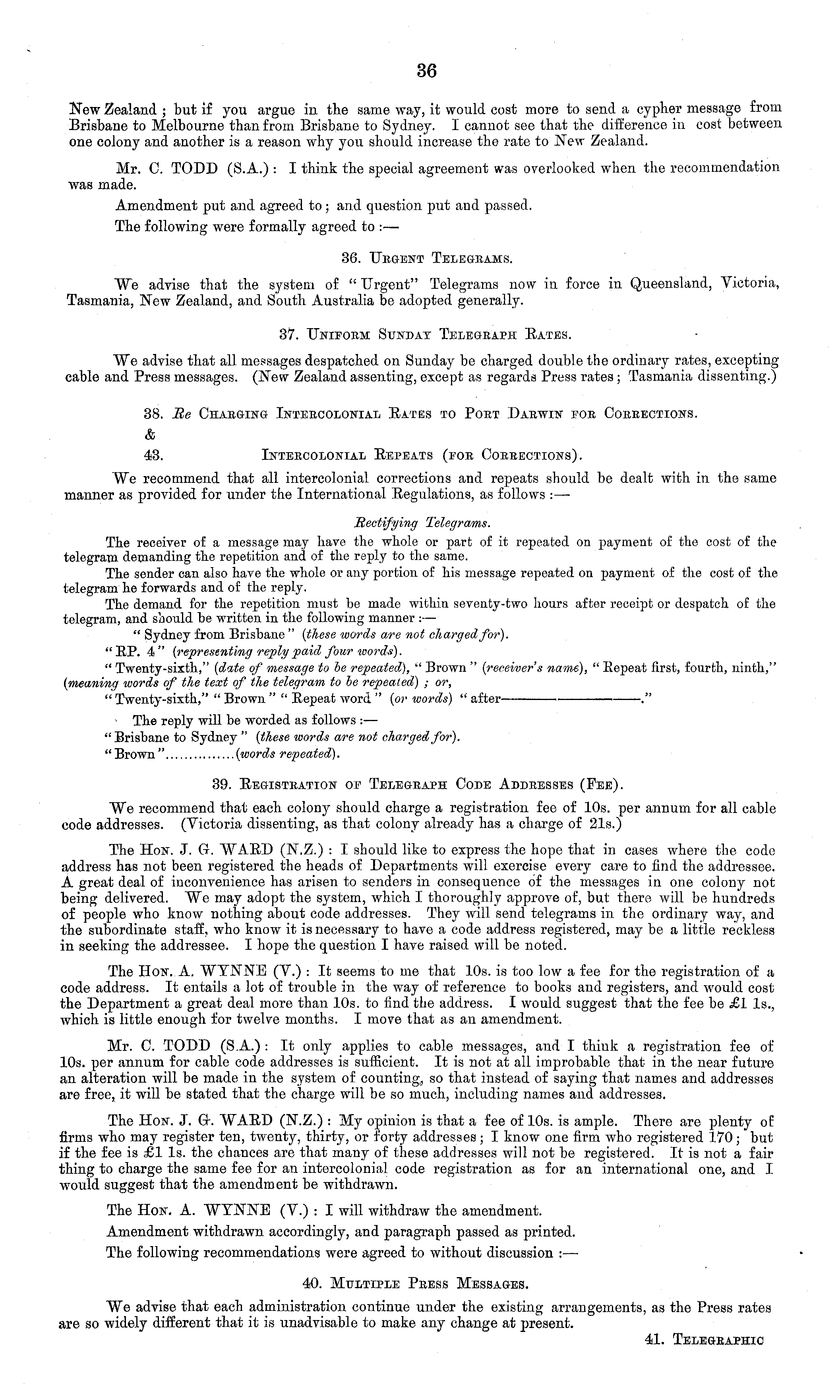 New Zealand ; but if you argue in the same way, it would cost more to send a cypher message from Brisbane to Melbourne than from Brisbane to Sydney. I cannot see that the difference in cost between one colony and another is a reason why you should increase the rate to New Zealand. Mr. C. TODD (S.A.) : I think the special agreement was overlooked when the recommendation was made. Amendment put and agreed to; and question put and passed. The following were formally agreed to :— 36. Urgent Telegrams. We advise that the system of '•' Urgent" Telegrams now in force in Queensland, Victoria, Tasmania, New Zealand, and South Australia be adopted generally. 37. Uniform Sunday Telegraph Rates. We advise that all messages despatched on Sunday be charged double the ordinary rates, excepting cable and Press messages. (New Zealand assenting, except as regards Press rates ; Tasmania dissenting.) 38. Re Charging Intercolonial Rates to Port Darwin for Corrections. & 43. Intercolonial Repeats (for Corrections). We recommend that all intercolonial corrections and repeats should be dealt with in the same manner as provided for under the International Regulations, as follows : — Rectifying Telegrams. The receiver of a message may have the whole or part of it repeated on payment of the cost of the telegram demanding the repetition and of the reply to the same. The sender can also have the whole or any portion of his message repeated on payment of the cost of the telegram he forwards and of the reply. The demand for the repetition must be made within seventy-two hours after receipt or despatch of the telegram, and should be written in the following manner : — " Sydney from Brisbane " (these words are not charged for). " RP. 4 " (representing reply paid four words). " Twenty-sixth," (date of message to be repeated), " Brown " (receiver's name), " Repeat first, fourth, ninth," (meaning words of the text of the telegram to be repeated) ; or, " Twenty-sixth," " Brown " " Repeat word " (or ivords) " after ." The reply will be worded as follows : — "Brisbane to Sydney " (these words are not charged for). " Brown " (words repeated). 39. Registration of Telegraph Code Addresses (Fee). We recommend that each colony should charge a registration fee of 10s. per annum for all cable code addresses. (Victoria dissenting, as that colony already has a charge of 215.) The Hon. J. G. W"ARD (N.Z.) : I should like to express the hope that in cases where the code address has not been registered the heads of Departments will exercise every care to find the addressee. A great deal of inconvenience has arisen to senders in consequence of the messages in one colony not being delivered. We may adopt the system, which I thoroughly approve of, but there will be hundreds of people who know nothing about code addresses. They will send telegrams in the ordinary way, and the subordinate staff, who know it is necessary to have a code address registered, may be a little reckless in seeking the addressee. I hope the question I have raised will be noted. The Hon. A. WYNNE (V.) : It seems to me that 10s. is too low a fee for the registration of a code address. It entails a lot of trouble in the way of reference to books and registers, and would cost the Department a great deal more than 10s. to find the address. I would suggest that the fee be £1 Is., which is little enough for twelve months. I move that as an amendment. Mr. C. TODD (S.A.) : It only applies to cable messages, and I think a registration fee of 10s. per annum for cable code addresses is sufficient. It is not at all improbable that in the near future an alteration will be made in the system of counting, so that instead of saying that names and addresses are free, it will be stated that the charge will be so much, including names and addresses. The Hon. J. G. WARD (N.Z.) :My opinion is that a fee of 10s. is ample. There are plenty of firms who may register ten, twenty, thirty, or forty addresses ; I know one firm who registered 170; but if the fee is £1 Is. the chances are that many of these addresses will not be registered. It is not a fair thing to charge the same fee for an intercolonial code registration as for an international one, and I would suggest that the amendment be withdrawn. The Hon. A. WYNNE (V.) : I will withdraw the amendment. Amendment withdrawn accordingly, and paragraph passed as printed. The following recommendations were agreed to without discussion : — 40. Multiple Press Messages. We advise that each administration continue under the existing arrangements, as the Press rates are so widely different that it is unadvisable to make any change at present. 41. Telegraphic