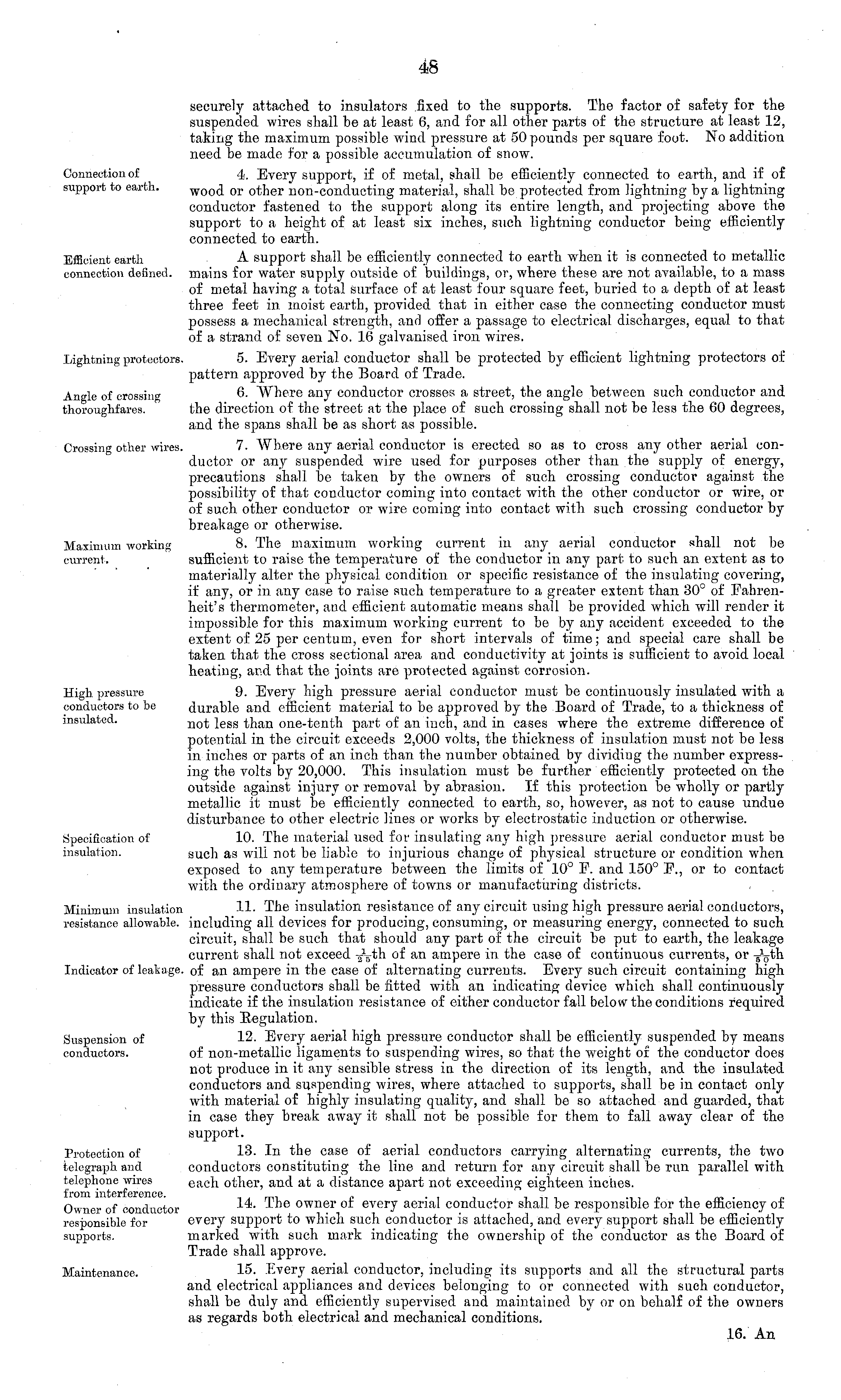 securely attached to insulators fixed to the supports. The factor of safety for the suspended wires shall be at least 6, and for all other parts of the structure at least 12, taking the maximum possible wind pressure at 50 pounds per square foot. No addition need be made for a possible accumulation of snow. 4. Every support, if of metal, shall be efficiently connected to earth, and if of wood or other non-conducting material, shall be protected from lightning by a lightning conductor fastened to the support along its entire length, and projecting above the support to a height of at least six inches, such lightning conductor being efficiently connected to earth. A support shall be efficiently connected to earth when it is connected to metallic mains for water supply outside of buildings, or, where these are not available, to a mass of metal having a total surface of at least four square feet, buried to a depth of at least three feet in moist earth, provided that in either case the connecting conductor must possess a mechanical strength, and offer a passage to electrical discharges, equal to that of a strand of seven No. 16 galvanised iron wires. 5. Every aerial conductor shall be protected by efficient lightning protectors of pattern approved by the Board of Trade. 6. Where any conductor crosses a street, the angle between such conductor and the direction of the street at the place of such crossing shall not be less the 60 degrees, and the spans shall be as short as possible. 7. Where any aerial conductor is erected so as to cross any other aerial conductor or any suspended wire used for purposes other than the supply of energy, precautions shall be taken by the owners of such crossing conductor against the possibility of that conductor coming into contact with the other conductor or wire, or of such other conductor or wire coming into contact with such crossing conductor by breakage or otherwise. 8. The maximum working current in any aerial conductor shall not be sufficient to raise the temperature of the conductor in any part to such an extent as to materially alter the physical condition or specific resistance of the insulating covering, if any, or in any case to raise such temperature to a greater extent than 30° of Fahrenheit's thermometer, and efficient automatic means shall be provided which will render it impossible for this maximum working current to be by any accident exceeded to the extent of 25 per centum, even for short intervals of time; and special care shall be taken that the cross sectional area and conductivity at joints is sufficient to avoid local heating, and that the joints are protected against corrosion. 9. Every high pressure aerial conductor must be continuously insulated with a durable and efficient material to be approved by the Board of Trade, to a thickness of not less than one-tenth part of an inch, and in cases where the extreme difference of potential in the circuit exceeds 2,000 volts, the thickness of insulation must not be less in inches or parts of an inch than the number obtained by dividing the number expressing the volts by 20,000. This insulation must be further efficiently protected on tho outside against injury or removal by abrasion. If this protection be wholly or partly metallic it must be efficiently connected to earth, so, however, as not to cause undue disturbance to other electric lines or works by electrostatic induction or otherwise. 10. The material used for insulating any high pressure aerial conductor must be such as will not be liable to injurious change of physical structure or condition when exposed to any temperature between the limits of 10° F. and 150° F., or to contact with the ordinary atmosphere of towns or manufacturing districts. 11. The insulation resistance of any circuit using high pressure aerial conductors, including all devices for producing, consuming, or measuring energy, connected to such circuit, shall be such that should any part of the circuit be put to earth, the leakage current shall not exceed of an ampere in the case of continuous currents, or -g-Vth of an ampere in the case of alternating currents. Every such circuit containing high pressure conductors shall be fitted with an indicating device which shall continuously indicate if the insulation resistance of either conductor fall below the conditions required by this Regulation. 12. Every aerial high pressure conductor shall be efficiently suspended by means of non-metallic ligaments to suspending wires, so that the weight of the conductor does not produce in it any sensible stress in the direction of its length, and the insulated conductors and suspending wires, where attached to supports, shall be in contact only with material of highly insulating quality, and shall be so attached and guarded, that in case they break away it shall not be possible for them to fall away clear of the support. 13. In the case of aerial conductors carrying alternating currents, the two conductors constituting the line and return for any circuit shall be run parallel with each other, and at a distance apart not exceeding eighteen inches. 14. The owner of every aerial conductor shall be responsible for the efficiency of every support to which such conductor is attached, and every support shall be efficiently marked with such mark indicating the ownership of the conductor as the Board of Trade shall approve. 15. Every aerial conductor, including its supports and all the structural parts and electrical appliances and devices belonging to or connected with such conductor, shall be duly and efficiently supervised and maintained by or on behalf of the owners as regards both electrical and mechanical conditions. 16. An