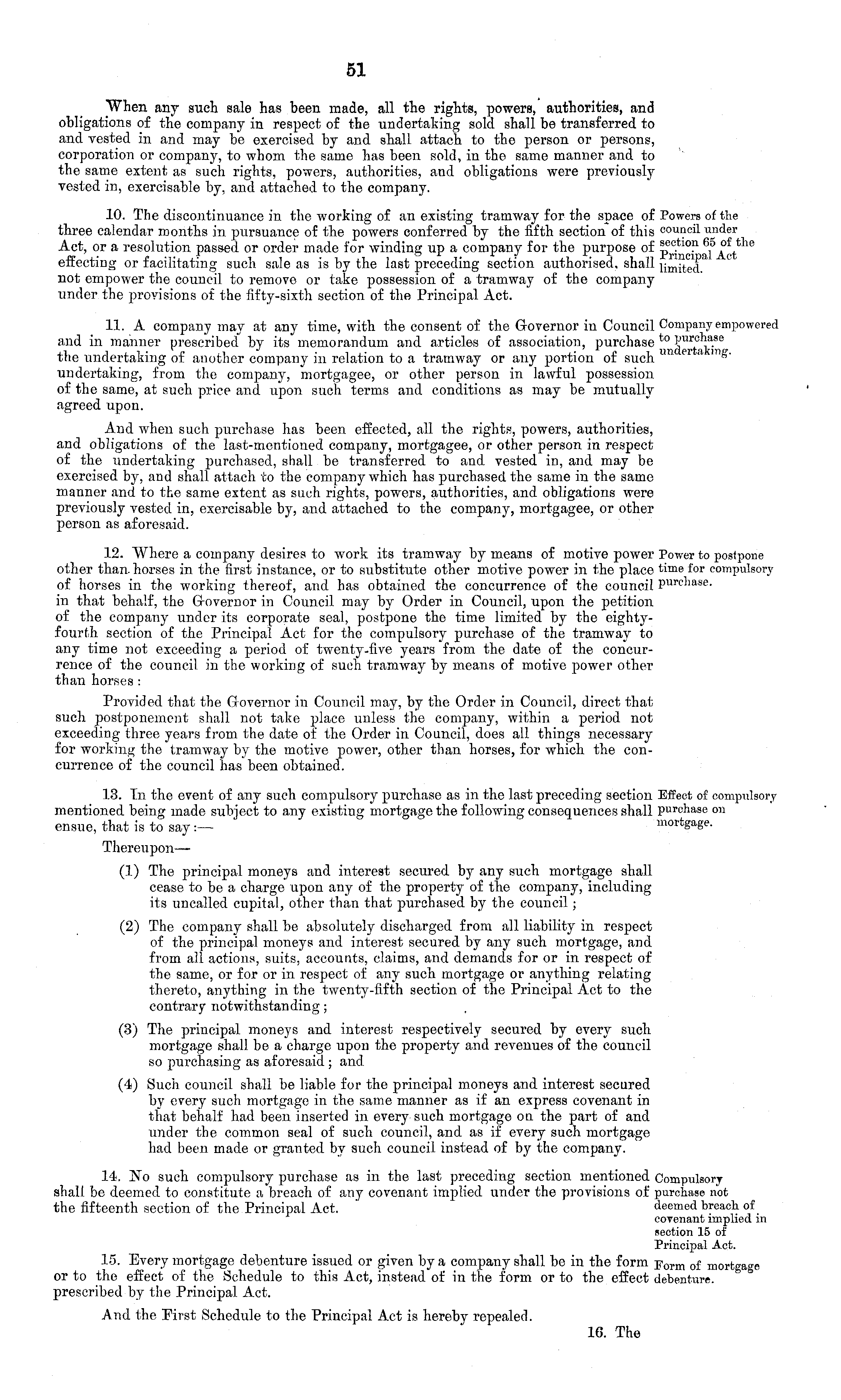 When any such sale has been made, all the rights, powers, authorities, and obligations of the company in respect of the undertaking sold shall be transferred to and vested in and may be exercised by and shall attach to the person or persons, corporation or company, to whom the same has been sold, in the same manner and to the same extent as such rights, powers, authorities, and obligations were previously vested in, exercisable by, and attached to the company. 10. The discontinuance in the working of an existing tramway for the space of three calendar months in pursuance of the powers conferred by the fifth section of this Act, or a resolution passed, or order made for winding up a company for the purpose of effecting or facilitating such sale as is by the last preceding section authorised, shall not empower the council to remove or take possession of a tramway of the company under the provisions of the fifty-sixth section of the Principal Act. 11. A company may at any time, with the consent of the Governor in Council and in manner prescribed by its memorandum and articles of association, purchase the undertaking of another company in relation to a tramway or any portion of such undertaking, from tho company, mortgagee, or other person in lawful possession of the same, at such price and upon such terms and conditions as may be mutually agreed upon. And when such purchase has been effected, all the rights, powers, authorities, and obligations of the last-mentioned company, mortgagee, or other person in respect of the undertaking purchased, shall be transferred to and vested in, and may be exercised by, and shall attach to the company which has purchased the same in the same manner and to the same extent as such rights, powers, authorities, and obligations were previously vested in, exercisable by, and attached to the company, mortgagee, or other person as aforesaid. 12. Where a company desires to work its tramway by means of motive power other than, horses in the first instance, or to substitute other motive power in the place of horses in the working thereof, and has obtained the concurrence of the council in that behalf, the Governor in Council may by Order in Council, upon the petition of the company under its corporate seal, postpone the time limited by the eightyfourth section of the Principal Act for the compulsory purchase of the tramway to any time not exceeding a period of twenty-five years from the date of the concurrence of the council in the working of such tramway by means of motive power other than horses : Provided that the Governor in Council may, by the Order in Council, direct that such postponement shall not take place unless the company, within a period not exceeding three years from the date of the Order in Council, does all things necessary for working the tramway by the motive power, other than horses, for which the concurrence of the council has been obtained. 13. In the event of any such compulsory purchase as in the last preceding section mentioned being made subject to any existing mortgage the following consequences shall ensue, that is to say:— Thereupon— (1) The principal moneys and interest secured by any such mortgage shall cease to be a charge upon any of the property of the company, including its uncalled cupital, other than that purchased by the council; (2) The company shall be absolutely discharged from all liability in respect of the principal moneys and interest secured by any such mortgage, and from all actions, suits, accounts, claims, and demands for or in respect of the same, or for or in respect of any such mortgage or anything relating thereto, anything in the twenty-fifth section of the Principal Act to the contrary notwithstanding; (3) The principal moneys and interest respectively secured by every such mortgage shall be a charge upon the property and revenues of the council so purchasing as aforesaid ; and (4) Such council shall be liable for the principal moneys and interest secured by every such mortgage in the same manner as if an express covenant in that behalf had been inserted in every such mortgage on the part of and under the common seal of such council, and as if every such mortgage had been made or granted by such council instead of by the company. 14. No such compulsory purchase as in the last preceding section mentioned i shall be deemed to constitute a breach of any covenant implied under the provisions of ] the fifteenth section of the Principal Act. ' i 15. Every mortgage debenture issued or given by a company shall be in the form ; or to tho effect of the Schedule to this Act, instead of in the form or to the effect < prescribed by the Principal. Act. And the First Schedule to the Principal Act is hereby repealed. 16. The