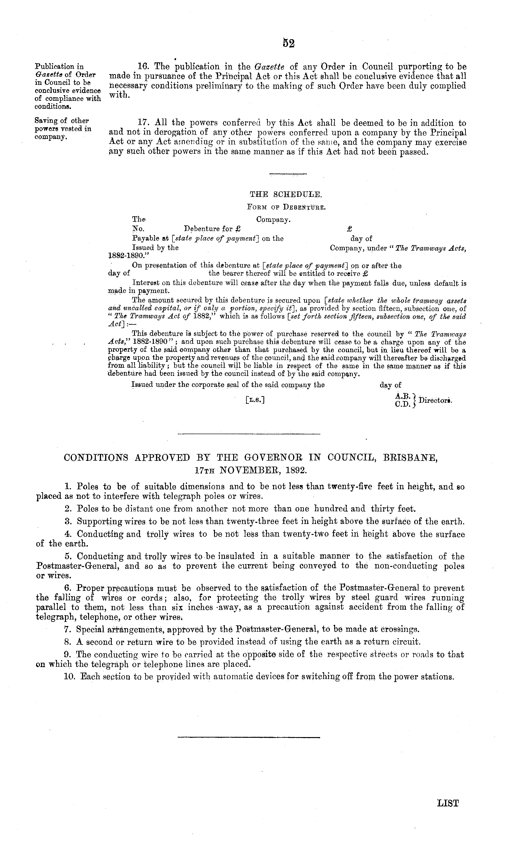 CONDITIONS APPROVED BY THE GOVERNOR IN COUNCIL, BRISBANE, 17te NOVEMBER, 1892. 1. Poles to be of suitable dimensions and to be not less than twenty-five feet in height, and so placed as not to interfere with telegraph poles or wires. 2. Poles to be distant one from another not more than one hundred and thirty feet. 3. Supporting wires to be not less than twenty-three feet in height above the surface of the earth. 4. Conducting and trolly wires to be not less than twenty-two feet in height above the surface of the earth. 5. Conducting and trolly wires to be insulated in a suitable manner to the satisfaction of the Postmaster-General, and so as to prevent the current being conveyed to the non-conducting poles or wires. 6. Proper precautions must be observed to the satisfaction of the Postmaster-General to prevent the falling of wires or cords; also, for protecting the trolly wires by steel guard wires running parallel to them, not less than six inches away, as a precaution against accident from the falling of telegraph, telephone, or other wires. 7. Special arrangements, approved by the Postmaster-General, to be made at crossings. 8. A second or return wire to be provided instead of using the earth as a return circuit. 9. The conducting wire to bo carried at the opposite side of the respective streets or roads to that on which the telegraph or telephone lines are placed. 10. Each section to be provided with automatic devices for switching off from the power stations.