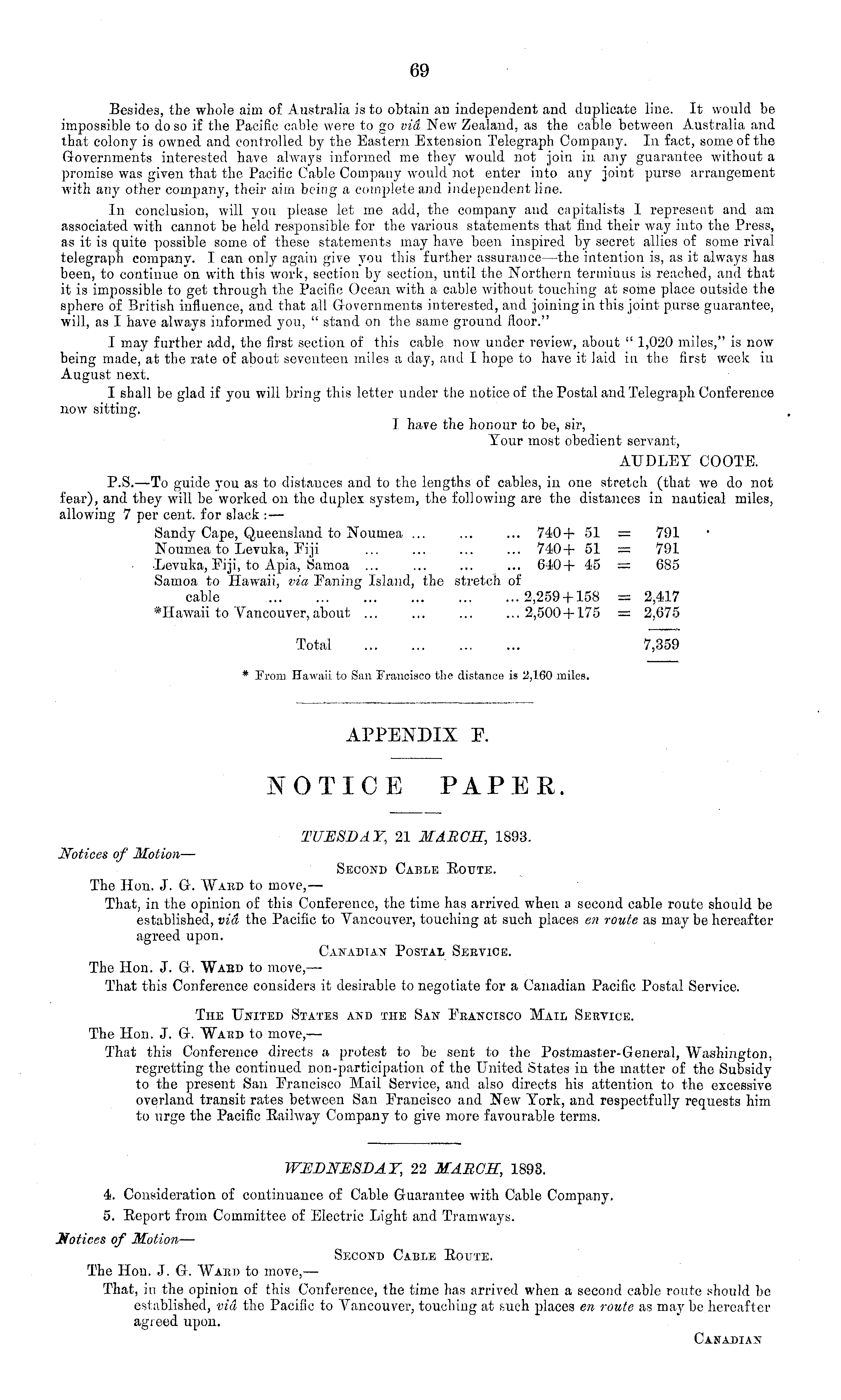 TUESDAY, 21 MARCH, 1893. Notices of Motion — Second Cable Eoute. The Hon. J. G. Ward to move, — That, in the opinion of this Conference, the time has arrived when a second cable route should be established, via the Pacific to Vancouver, touching at such places en route as may be hereafter agreed upon. Canadian Postal Service. The Hon. J. G. Ward to move, — That this Conference considers it desirable to negotiate for a Canadian Pacific Postal Service. The United States and the San Francisco Mail Service. The Hon. J. G. Ward to move, — That this Conference directs a protest to be sent to the Postmaster-General, Washington, regretting the continued non-participation of the United States in the matter of the Subsidy to the present San Francisco Mail Service, and also directs his attention to the excessive overland transit rates between San Francisco and New York, and respectfully requests him to urge the Pacific Eailway Company to give more favourable terms.