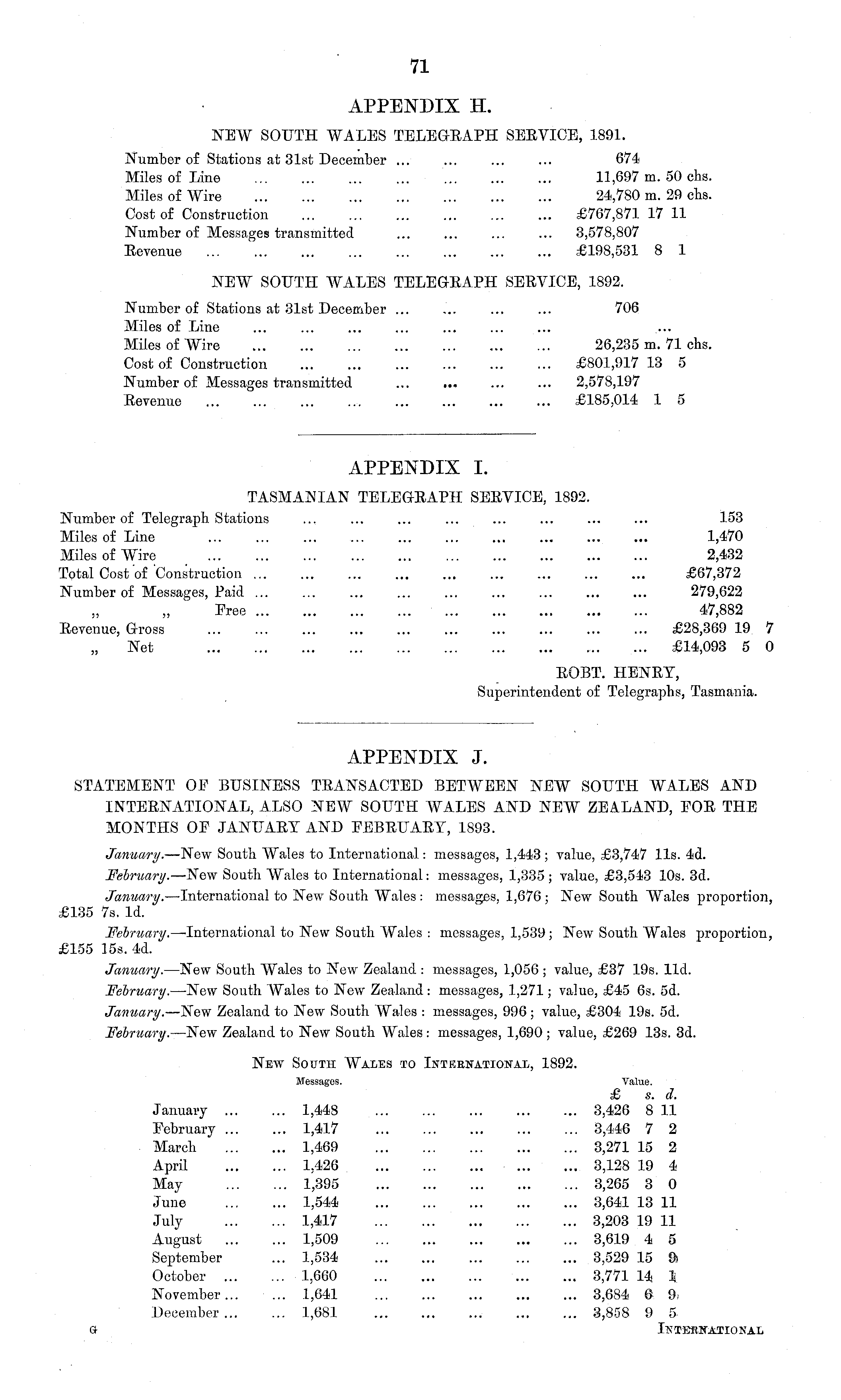 APPENDIX J. STATEMENT OF BUSINESS TRANSACTED BETWEEN NEW SOUTH WALES AND INTEENATIONAL, ALSO NEW SOUTH WALES AND NEW ZEALAND, FOE THE MONTHS OF JANUAEY AND FEBRUARY, 1893. January. —New South Wales to International: messages, 1,443 ; value, £3,747 lis. 4d. February. —New South Wales to International: messages, 1,335 ; value, £3,543 10s. 3d. January. —International to New South Wales : messages, 1,676 ; New South Wales proportion, £135 7s. Id. February. —International to New South Wales : messages, 1,539; New South Wales proportion, £155 15s. 4d. January. —New South Wales to New Zealand : messages, 1,056 ; value, £37 19s. lid. February. —New South Wales to New Zealand : messages, 1,271; value, £45 6s. sd. January. —New Zealand to New South Wales : messages, 996; value, £304 19s. sd. February. —New Zealand to New South Wales : messages, 1,690 ; value, £269 13s. 3d. New South Wales to International, 1892. Messages. Value. £ s. d. January 1,448 3,426 8 11 February 1,417 3,446 7 2 March 1,469 3,271 15 2 April 1,426 3,128 19 4 May 1,395 3,265 3 0 June 1,544 3,641 13 11 July 1,417 3,203 19 11 August 1,509 3,619 4 5 September ... 1,534 3,529 15 9s October 1,660 3,771 14. 1 November... ... .1,641 3,684 6 9December 1,681 3,858 9 5 a International