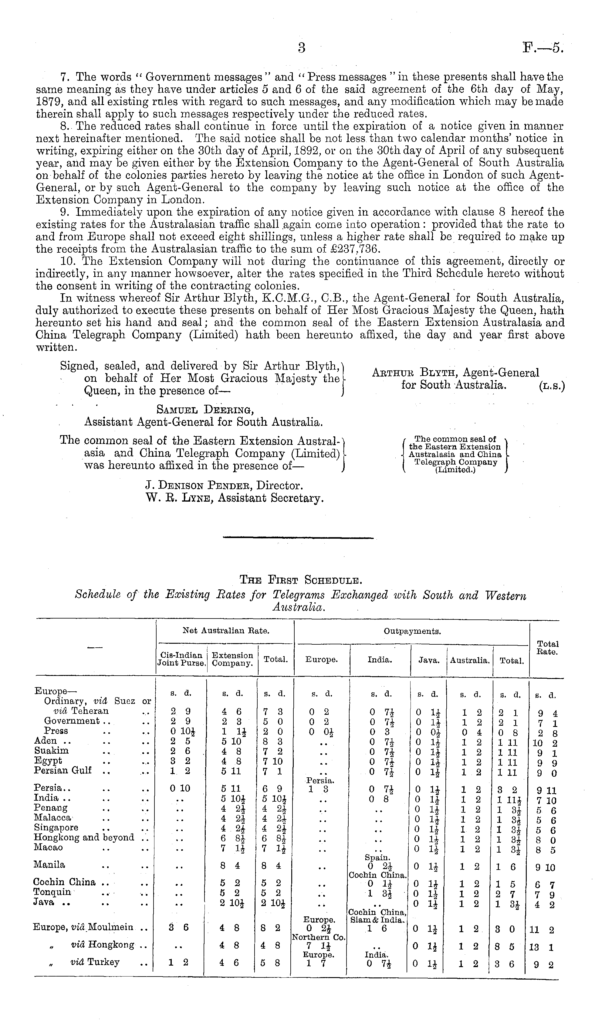 7. The words " Government messages " and " Press messages " in these presents shall have the same meaning as they have under articles 5 and 6 of the said agreement of the 6th day of May, 1879, and all existing rules with regard to such messages, and any modification which may be made therein shall apply to such messages respectively under the reduced rates. 8. The reduced rates shall continue in force until the expiration of a notice given in. manner next hereinafter mentioned. The said notice shall be not less than two calendar months' notice in writing, expiring either on the 30th day of April, 1892, or on the 30th day of April of any subsequent year, and may be given either by the Extension Company to the Agent-General of South Australia on behalf of the colonies parties hereto by leaving the notice at the office in London of such AgentGeneral, or by such Agent-General to the company by leaving such notice at the office of the Extension Company in London. 9. Immediately upon the expiration of any notice given in accordance with clause 8 hereof the existing rates for the Australasian traffic shall .again come into operation: provided that the rate to and from Europe shall not exceed eight shillings, unless a higher rate shall be required to make up the receipts from the Australasian traffic to the sum of £237,736. 10. The Extension Company will not during the continuance of this agreement, directly or indirectly, in any manner howsoever, alter the rates specified in the Third Schedule hereto without the consent in writing of the contracting colonies. In witness whereof Sir Arthur Blyth, K.C.M.G., C.8., the Agent-General for South Australia, duly authorized to execute these presents on behalf of Her Most Gracious Majesty the Queen, hath hereunto set his hand and seal; and the common seal of the Eastern Extension Australasia and China Telegraph Company (Limited) hath been hereunto affixed, the day and year first above written. Signed, sealed, and delivered by Sir Arthur Blyth, ) . -o . , , on behalf of Her Most Gracious Majesty the AbTH ? E Blyth A gen -General Queen, in the presence of- f for South Australia. (1.5.) Samuel Deering, Assistant Agent-General for South Australia. The common seal of the Eastern Extension Austral-) t t^^tOT^fcSSSif&i asia and China Telegraph Company (Limited) [ \ Australasia ana china . was hereunto affixed in the presence of— j ( TA6 %^s£§** ay J. Denison Bender, Director. W. B. Lyne, Assistant Secretary.