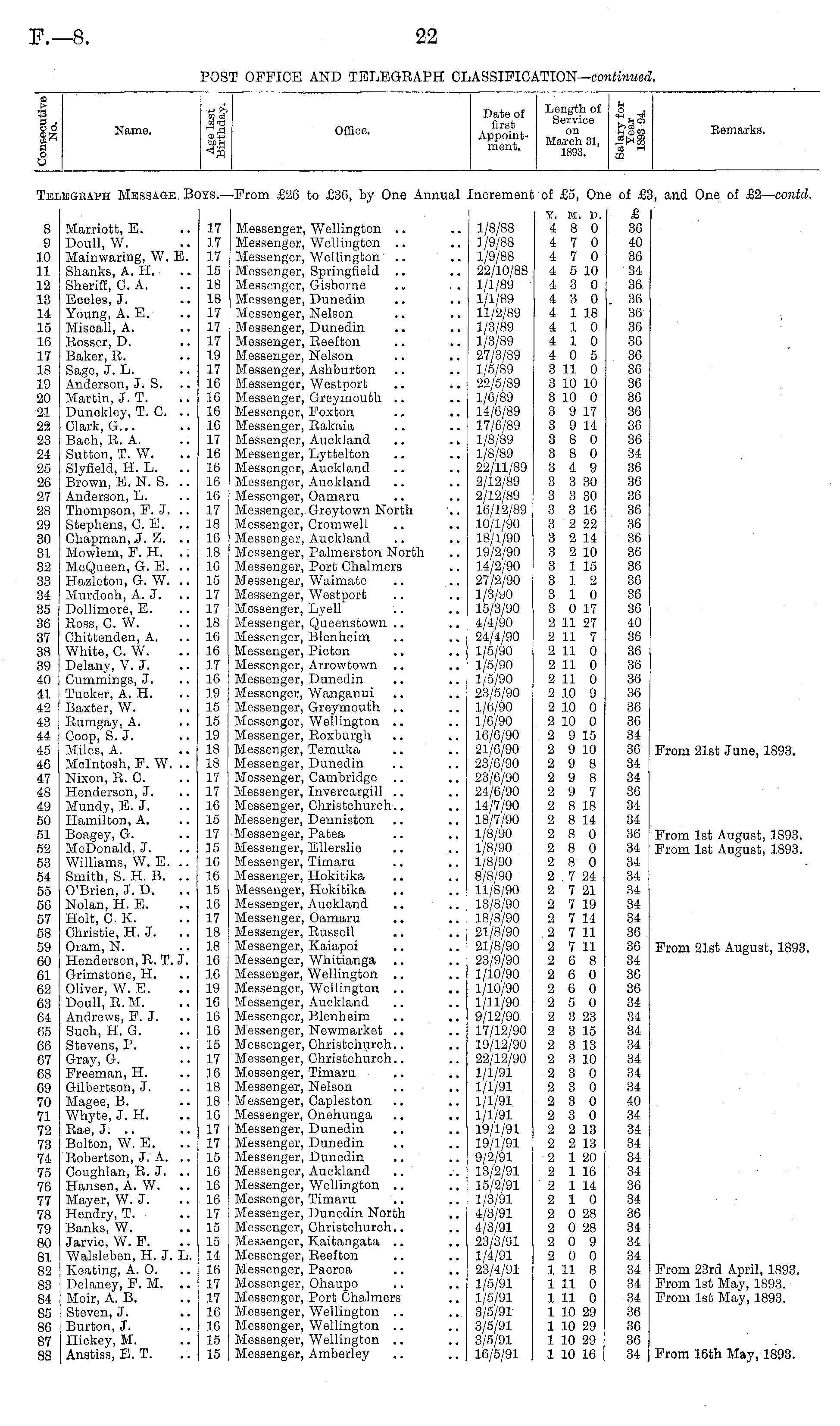 % go *Z w O O Name, Office. Dnto of first Appointment. Length of Service on March 31, 1803. Remarks. Te: ,egraph Message, Bi IYS.•From £20 to £36, by One Annual increment of £5, Oni of & i, and Ono of £2 — contd. 8 9 10 11 12 13 14 15 16 17 18 19 20 21 22 23 24 25 26 27 28 29 30 31 82 33 34 35 36 37 38 39 40 11 42 43 44 45 46 47 48 49 50 61 52 53 54 55 56 57 58 59 00 61 62 63 64 65 66 67 68 69 70 71 72 73 74 75 76 77 78 79 80 81 82 83 84 85 86 87 88 Marriott, E. Doull, W. Mainwaring, W. E. Shanks, A. H. Sheriff, C. A. Eccles, J. Young, A. E. Miscall, A. Rosser, D. Baker, R. Sage, J. L. Anderson, J. S. Martin, J. T. Dunekley, T. C. .. Clark, G... Bach, R. A. Sutton, T. W. Slyfield, H. L. Brown, E. N. S. Anderson, L. Thompson, F. J. Stephens, C. E. Chapman, J. Z. .. Mowlem, F. H. McQueen, G. E. .. Hazleton, G. W. .. Murdoch, A. J. Dollimore, E. Ross, C. W. Chittenden, A. White, C. W. Delany, V. J. Cummings, J. Tucker, A. H. Baxter, W. Rumgay, A. Coop, S. J. Miles, A. Mclntosh, F. W. .. Nixon, R. C. Henderson, J. Mundy, E.J. Hamilton, A. Boagey, G. McDonald, J. Williams, W. E. .. Smith, S. H. B. O'Brien, J. D. Nolan, H. E. Holt, C.K. Christie, H. J. Oram, N. Henderson, R. T. J. Grimstone, H. Oliver, W. E. Doull, R. M. Andrews, F. J. Such, H. G. Stevens, P. Gray, G. Freeman, H. Gilbertson, J. Magee, B. Whyte, J. H. Rae, J. .. Bolton, W. E. Robertson, J. A. .. Coughlan, R. J. Hanson, A. W. Mayer, W. J. Hendry, T. Banks, W. Jarvie, W. F. Walsleben, H. J. L. Keating, A. O. Delanoy, F. M. .. Moir, A. B. Steven, J. Burton, J. Hickey, M. Anstiss, E. T. 17 17 17 15 18 18 17 17 17 19 17 16 16 16 16 17 16 16 16 16 17 18 10 18 10 15 17 17 18 16 10 17 10 19 15 15 19 18 18 17 17 16 15 17 15 16 16 15 16 17 18 18 16 1C 19 16 16 16 15 17 16 18 18 16 17 17 15 16 16 16 17 15 15 14 16 17 17 16 10 15 15 Messenger, Wellington Messenger, Wellington .. Messenger, Wellington Messenger, Springfield Messenger, Gisborno Messenger, Dunedin Messenger, Nelson Messenger, Dunedin Messenger, Reefton Messenger, Nelson Messenger, Ashburton Messenger, Westport Messenger, Greymouth Messenger, Foxton Messenger, Rakaia Messenger, Auckland .. .. Messenger, Lyttolton Messenger, Auckland Messenger, Auckland Messenger, Oamaru Messenger, Greytown North Messenger, Cromwell Messenger, Auckland Messenger, Palmerston North Messenger, Port Chalmers Messenger, Waimato Messenger, Wostport Messenger, Lyell Messenger, Qucenstovvn Messenger, Blenheim Messenger, Pieton Messenger, Arrowtown Messenger, Dunedin Messenger, Wanganui Messenger, Greymouth Messenger, Wellington .. Messenger, Roxburgh Messenger, Temuka Messenger, Dunedin Messenger, Cambridge Messenger, Invercargill Messenger, Christchurch.. Messenger, Denniston Messenger, Patea Messenger, Ellerslio Messenger, Timaru Messenger, Hokitika Messenger, Hokitika Messenger, Auckland Messenger, Oamaru Messenger, Russell Messenger, Kaiapoi Messenger, Whitianga Messenger, Wellington Messenger, Wellington Messenger, Auckland Messenger, Blenheim Messenger, Newmarket Messenger, Ohristchurch.. Messenger, Christchurch Messenger, Timaru Messenger, Nelson Messenger, Capleston Messenger, Onehunga Messenger, Dunedin Messenger, Dunedin Messenger, Dunedin Messenger, Auckland Messenger, Wellington Messenger, Timaru Messenger, Dunedin North Messenger, Christchurch.. Messenger, Kaitangata Messenger, Reefton Messenger, Paeroa Messenger, Ohaupo Mossengor, Port Chalmers Messenger, Wellington Messenger, Wellington Messenger, Wellington Messenger, Amberley 1/8/88 1/9/88 1/9/88 22/10/88 1/1/89 1/1/89 11/2/89 1/3/89 1/3/89 27/3/89 1/5/89 22/5/89 1/6/89 14/6/89 17/6/89 1/8/89 1/8/89 22/11/89 2/12/89 2/12/89 16/12/89 10/1/90 18/1/90 19/2/90 14/2/90 27/2/90 1/8/90 15/3/90 4/4/90 24/4/90 1/5/90 1/5/90 1/5/90 23/5/90 1/6/90 1/0/90 10/6/90 21/6/90 23/6/90 23/6/90 24/6/90 14/7/90 18/7/90 1/8/90 1/8/90 1/8/90 8/8/90 11/8/90 13/8/90 18/8/90 21/8/90 21/8/90 23/9/90 1/10/90 1/10/90 1/11/90 9/12/90 17/12/90 19/12/90 22/12/90 1/1/91 1/1/91 1/1/91 1/1/91 19/1/91 19/1/91 9/2/91 13/2/91 15/2/91 1/3/91 4/3/91 4/3/91 23/3/91 1/4/91 23/4/91 1/5/91 1/5/91 3/5/91 3/5/91 3/5/91 16/5/91 y. m. d. 4 8 0 4 7 0 4 7 0 4 5 10 4 3 0 4 3 0 4 1 18 4 10 4 10 4 0 5 3 11 0 3 10 10 3 10 0 3 9 17 3 9 14 3 8 0 3 8 0 3 4 9 3 3 30 3 3 30 3 3 16 3 2 22 3 2 14 3 2 10 3 1 15 3 12 3 10 3 0 17 2 11 27 2 11 7 2 11 0 2 11 0 2 11 0 2 10 9 2 10 0 2 10 0 2 9 15 2 9 10 2 9 8 2 9 8 2 9 7 2 8 18 2 8 14 2 8 0 2 8 0 2 8 0 2 7 24 2 7 21 2 7 19 2 7 14 2 7 11 2 7 11 2 0 8 2 6 0 2 6 0 2 5 0 2 3 23 2 3 15 2 3 13 2 3 10 2 3 0 2 3 0 2 3 0 2 3 0 2 2 13 2 2 13 2 1 20 2 1 1C 2 1 14 2 10 2 0 28 2 0 28 2 0 9 2 0 0 1 11 8 1 11 0 1 11 0 1 10 29 1 10 29 1 10 29 1 10 10 £ 36 40 3G 34 36 36 36 36 36 36 36 36 36 36 36 36 34 36 36 36 36 36 36 36 36 36 36 36 40 36 36 36 36 36 30 36 34 36 34 34 36 34 34 30 34 34 34 34 34 34 30 36 34 36 36 34 34 34 34 34 34 34 40 34 34 34 34 34 36 34 36 34 34 34 34 34 34 36 36 36 34 From 21st June, 1893. From 1st August, 1893. From 1st August, 1893. From 21st August, 1893. From 23rd April, 1893. From 1st May, 1893. From 1st May, 1893. From 16th May, 1893.
