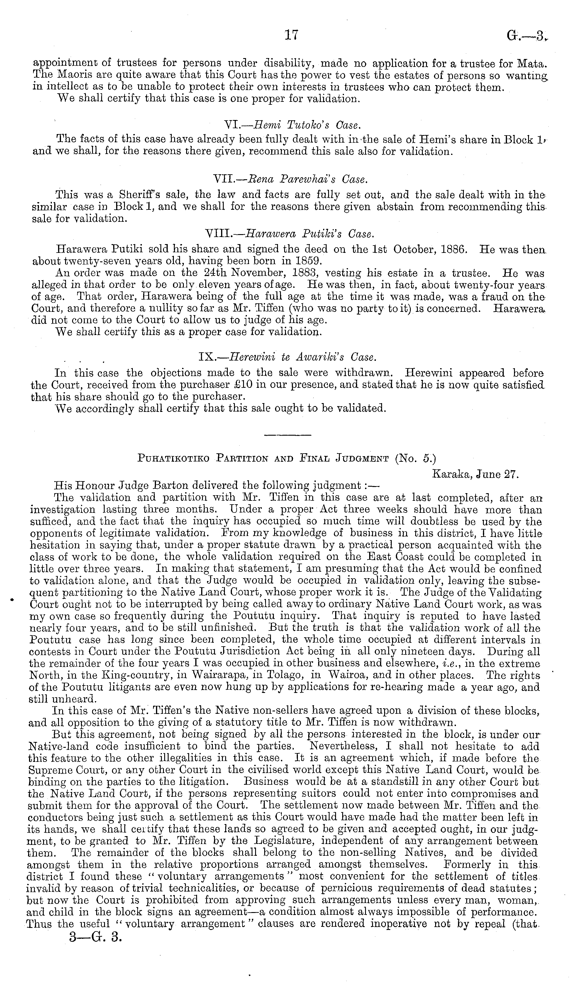 appointment of trustees for persons under disability, made no application for a trustee for Mata. The Maoris are quite aware that this Court has the power to vest the estates of persons so wanting. in intellect as to be unable to protect their own interests in trustees who can protect them. We shall certify that this case is one proper for validation. Vl.— Hemi Tutoho's Case. The facts of this case have already been fully dealt with in the sale of Hemi's share in Block l> , and we shall, for the reasons there given, recommend this sale also for validation. VII.- — Bena Pareiohai's Case. This was a Sheriff's sale, the law and facts are fully set out, and the sale dealt with in the similar case in Block 1, and we shall for the reasons there given abstain from recommending this sale for validation. VIII. — Harawem Putiki's Case. Harawera Putiki sold his share and signed the deed on the Ist October, 1886. He was then about twenty-seven years old, having been born in 1859. An order was made on the 24th November, 1883, vesting his estate in a trustee. He was alleged in that order to be only eleven years of age. He was then, in fact, about twenty-four years of age. That order, Harawera being of the full age at the time it was made, was a fraud on the Court, and therefore a nullity so far as Mr. Tiffen (who was no party to it) is concerned. Harawera. did not come to the Court to allow us to judge of his age. We shall certify this as a proper case for validation. IX. — Herewini te Awariki's Case. In this case the objections made to the sale were withdrawn. Herewini appeared before the Court, received from the purchaser £10 in our presence, and stated that he is now quite satisfied that his share should go to the purchaser. We accordingly shall certify that this sale ought to be validated.