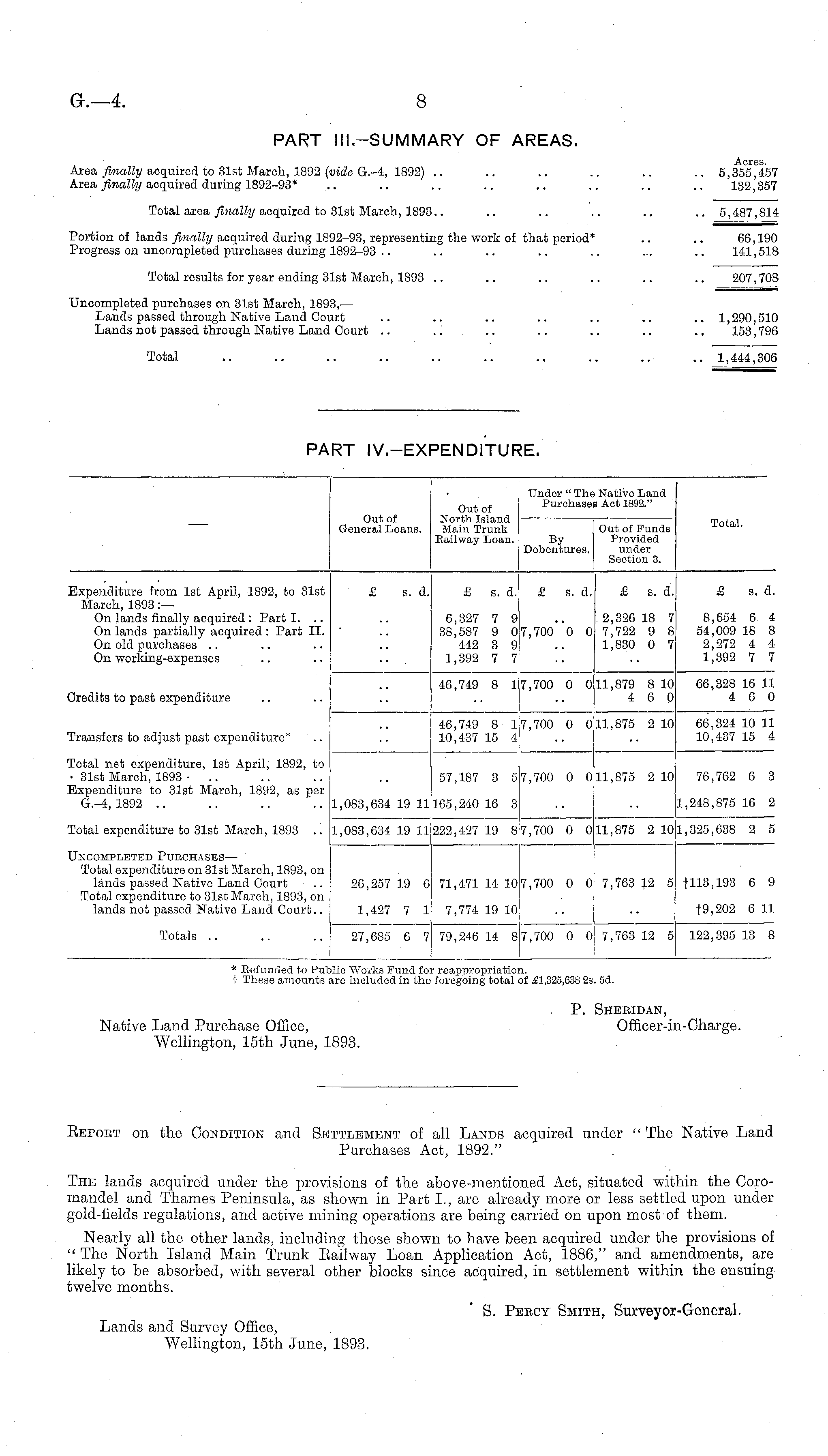 Ebpoet on the Condition and Settlement of all Lands acquired under " The Native Land Purchases Act, 1892." The lands acquired under the provisions of the above-mentioned Act, situated within the Coromandel and Thames Peninsula, as shown in Part 1., are already more or less settled upon under gold-fields regulations, and active mining operations are being carried on upon most of them. Nearly all the other lands, including those shown to have been acquired under the provisions of "The North Island Main Trunk Eailway Loan Application Act, 1886," and amendments, are likely to be absorbed, with several other blocks since acquired, in settlement within the ensuing twelve months. S. Percy' Smith, Surveyor-General. Lands and Survey Office, Wellington, 15th June, 1893.