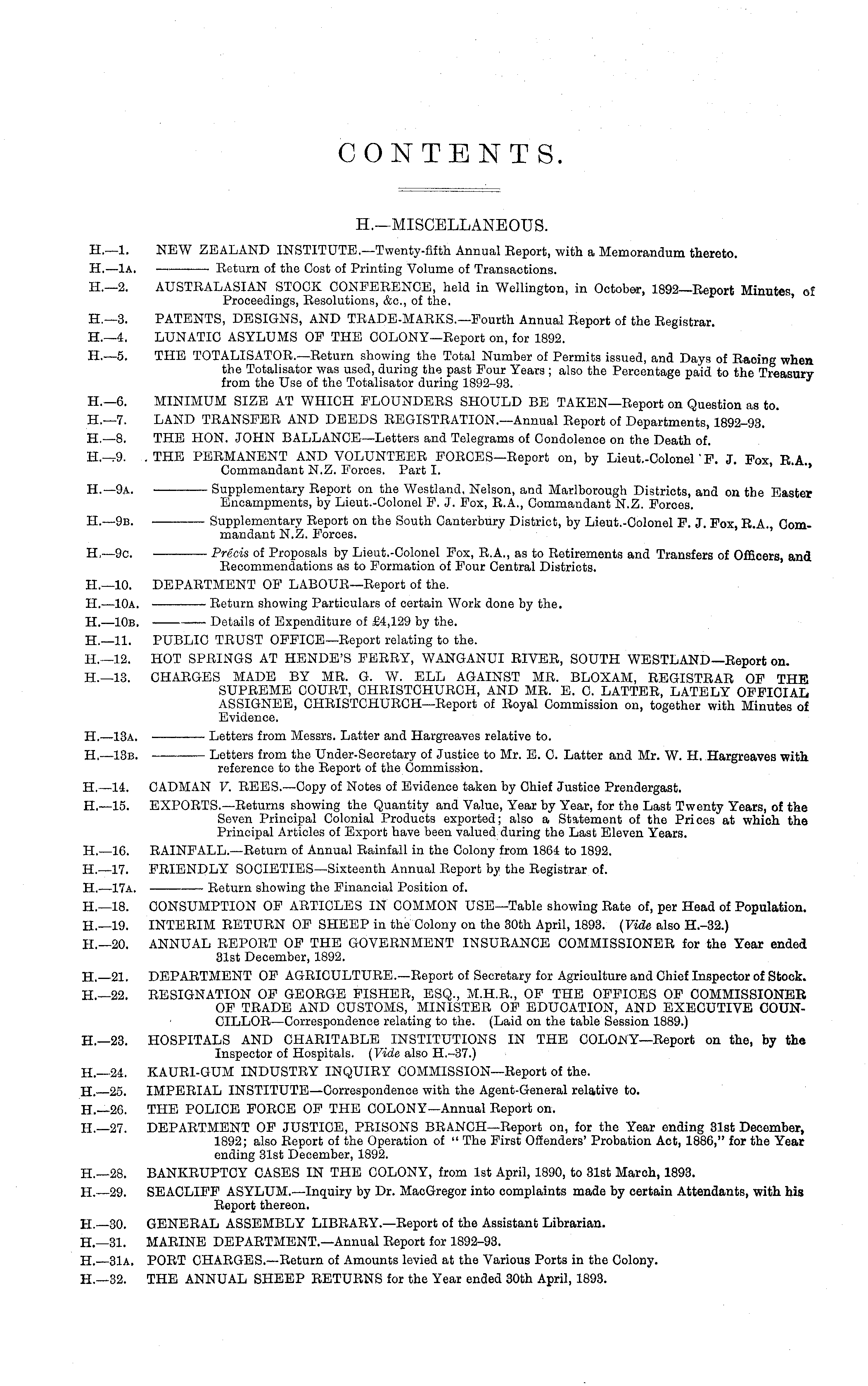 H.—MISCELLANEOUS. H.—l. NEW ZEALAND INSTITUTE.—Twenty-fifth Annual Report, with a Memorandum thereto. H.—la. ——■ —■ Return of the Cost of Printing Volume of Transactions. H.—2. AUSTRALASIAN STOCK CONFERENCE, held in Wellington, in October, 1892—Report Minutes of Proceedings, Resolutions, &c, of the. H.—3. PATENTS, DESIGNS, AND TRADE-MARKS.—Fourth Annual Report of the Registrar. H.—4. LUNATIC ASYLUMS OF THE COLONY—Report on, for 1892. H.—s. THE TOTALISATOR.—Return showing the Total Number of Permits issued, and Days of Raoing when the Totalisator was used, during the past Four Years ; also the Percentage paid to the Treasury from the Use of the Totalisator during 1892-93. H.-6. MINIMUM SIZE AT WHICH FLOUNDERS SHOULD BE TAKEN-Report on Question as to. H.—7. LAND TRANSFER AND DEEDS REGISTRATION.—AnnuaI Report of Departments, 1892-93. H—B. THE HON. JOHN BALLANCE—Letters and Telegrams of Condolence on the Death of. H.-.9. .THE PERMANENT AND VOLUNTEER FORCES—Report on, by Lieut.-Colonel 'F. J. Fox, R.A. Commandant N.Z. Forces. Part I. H.— 9A. Supplementary Report on the Westland, Nelson, and Marlborough Districts, and on the Easter Encampments, by Lieut.-Colonel F. J. Fox, R.A., Commandant N.Z. Forces. H.—9b. Supplementary Report on the South Canterbury District, by Lieut.-Colonel F. J. Fox, R.A. Commandant N.Z. Forces. H,—9c. Precis of Proposals by Lieut.-Colonel Fox, R.A., as to Retirements and Transfers of Officers, and Recommendations as to Formation of Four Central Districts. H.—lo. DEPARTMENT OF LABOUR—Report of the. H.—loa. Return showing Particulars of certain Work done by the. H.—lob. Details of Expenditure of £4,129 by the. H.—ll. PUBLIC TRUST OFFICE—Report relating to the. H.—l2. HOT SPRINGS AT HENDE'S FERRY, WANGANUI RIVER, SOUTH WESTLAND—Report on. H.—l3. CHARGES MADE BY MR. G. W. ELL AGAINST MR. BLOXAM, REGISTRAR OF THE SUPREME COURT, CHRISTCHURCH, AND MR. E. 0. LATTER, LATELY OFFICIAL ASSIGNEE, CHRISTCHURCH—Report of Royal Commission on, together with Minutes of Evidence. H.—l3a. Letters from Messrs. Latter and Hargreaves relative to. H. —13b. Letters from the Under-Secretary of Justice to Mr. E. C. Latter and Mr. W. H. Hargreaves with reference to the Report of the Commission. H.—l4. CADMAN V. REES.—Copy of Notes of Evidence taken by Chief Justice Prendergast. H.'—ls. EXPORTS.—Returns showing the Quantity and Value, Year by Year, for the Last Twenty Years, of the Seven Principal Colonial Products exported; also a Statement of the Prices at which the Principal Articles of Export have been valued during the Last Eleven Years. H.—l6. RAINFALL.—Return of Annual Rainfall in the Colony from 1864 to 1892. H.—l7. FRIENDLY SOClETlES—Sixteenth Annual Report by the Registrar of. H.—l7a. Return showing the Financial Position of. H.—lB. CONSUMPTION OF ARTICLES IN COMMON USE—Table showing Rate of, per Head of Population. H.—l9. INTERIM RETURN OF SHEEP in the Colony on the 30th April, 1893. (Vide also H.-32.) H.—2o. ANNUAL REPORT OF THE GOVERNMENT INSURANCE COMMISSIONER for the Year ended 31st December, 1892. H— 21. DEPARTMENT OF AGRICULTURE.—Report of Secretary for Agriculture and Chief Inspector of Stock. H.—22. RESIGNATION OF GEORGE FISHER, ESQ., M.H.R., OF THE OFFICES OF COMMISSIONER OF TRADE AND CUSTOMS, MINISTER OF EDUCATION, AND EXECUTIVE COUNClLLOR—Correspondence relating to the. (Laid on the table Session 1889.) H.—23. HOSPITALS AND CHARITABLE INSTITUTIONS IN THE COLONY—Report on the, by the Inspector of Hospitals. (Vide also H.-37.) H.—24. KAURI-GUM INDUSTRY INQUIRY COMMISSION—Report of the. H.—25. IMPERIAL INSTlTUTE—Correspondence with the Agent-General relative to. H.—26. THE POLICE FORCE OF THE COLONY—Annual Report on. H.—27. DEPARTMENT OF JUSTICE, PRISONS BRANCH—Report on, for the Year ending 31st December, 1892; also Report of the Operation of " The First Offenders' Probation Act, 1886," for the Year ending 31st December, 1892. H.—2B. BANKRUPTCY CASES IN THE COLONY, from Ist April, 1890, to 31st March, 1893. H.—29. SEAOLIFF ASYLUM. —Inquiry by Dr. MacGregor into complaints made by certain Attendants, with his Report thereon. H.—3o. GENERAL ASSEMBLY LIBRARY.—Report of the Assistant Librarian. H.—3l. MARINE DEPARTMENT—AnnuaI Report for 1892-93. H.—3lA. PORT CHARGES.—Return of Amounts levied at the Various Ports in the Colony. H.—32. THE ANNUAL SHEEP RETURNS for the Year ended 30th April, 1893.