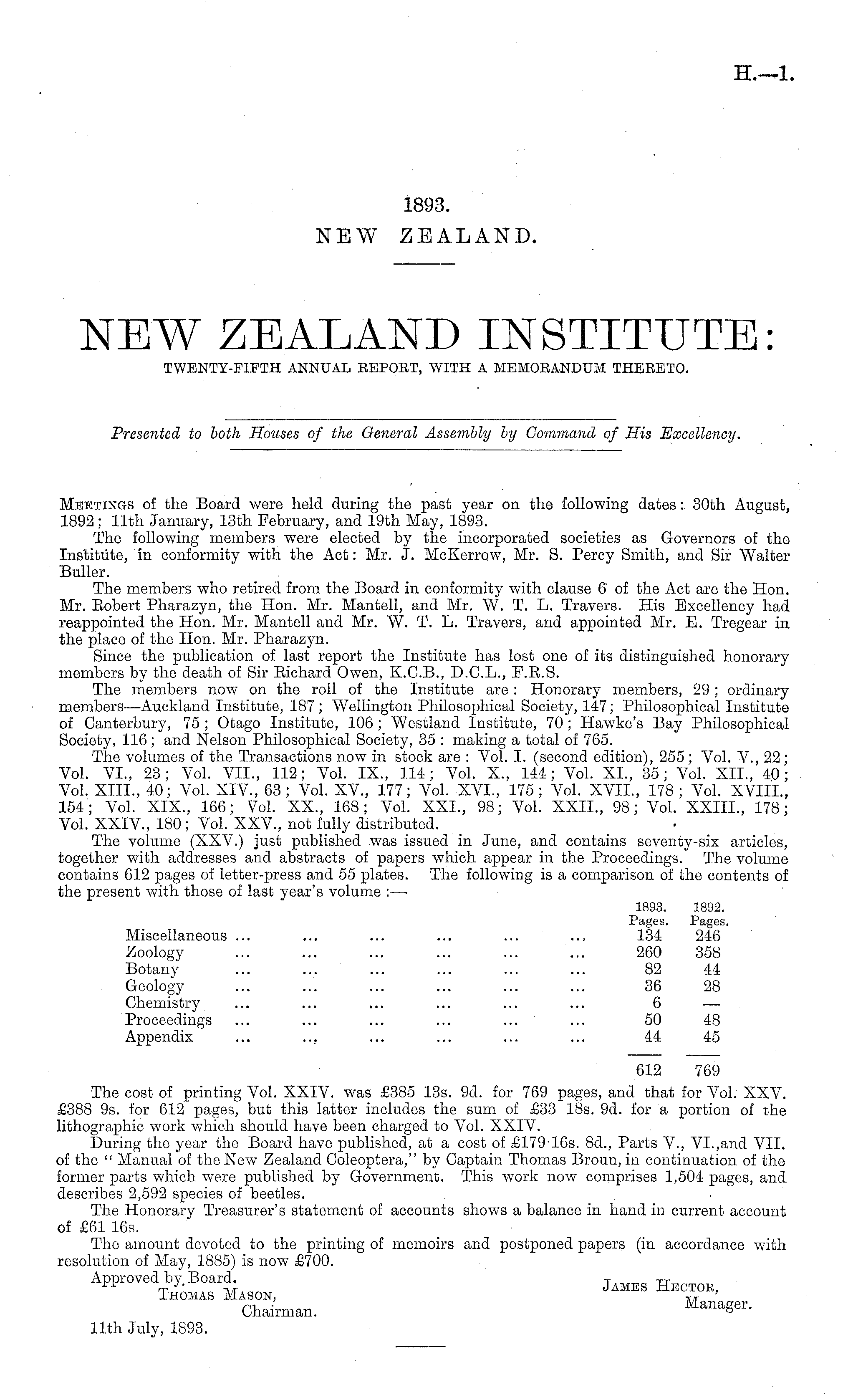 NEW ZEALAND INSTITUTE: TWENTY-FIFTH ANNUAL REPORT, WITH A MEMORANDUM THERETO.