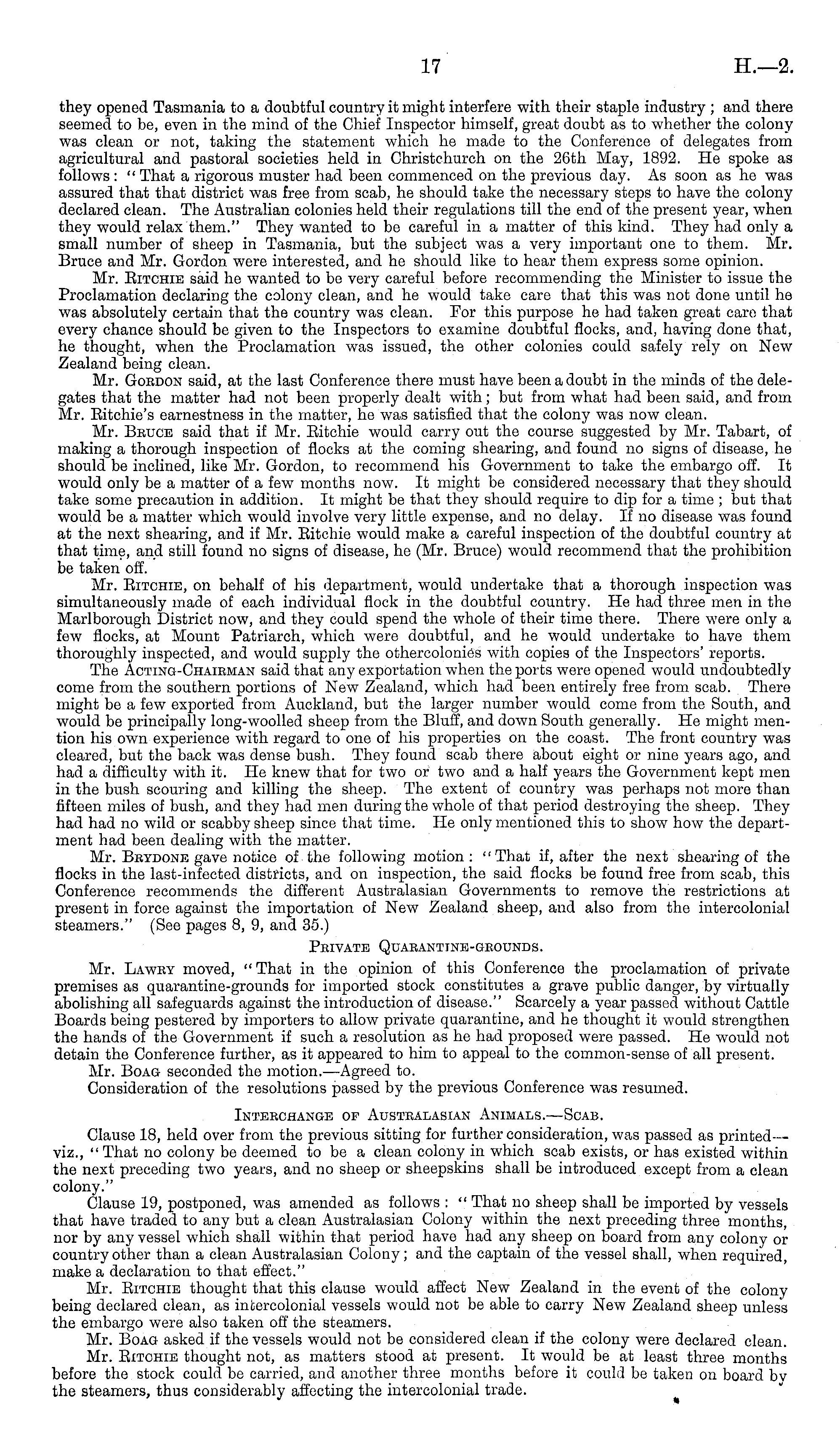 they opened Tasmania to a doubtful country it might interfere with their staple industry ; and there seemed to be, even in the mind of the Chief Inspector himself, great doubt as to whether the colony was clean or not, taking the statement which he made to the Conference of delegates from agricultural and pastoral societies held in Christchurch on the 26th May, 1892. He spoke as follows: " That a rigorous muster had been commenced on the previous day. As soon as he was assured that that district was free from scab, he should take the necessary steps to have the colony declared clean. The Australian colonies held their regulations till the end of the present year, when they would relax them." They wanted to be careful in a matter of this kind. They had only a small number of sheep in Tasmania, but the subject was a very important one to them. Mr. Bruce and Mr. Gordon were interested, and he should like to hear them express some opinion. Mr. Eitchie said he wanted to be very careful before recommending the Minister to issue the Proclamation declaring the colony clean, and he would take care that this was not done until he was absolutely certain that the country was clean. For this purpose he had taken great care that every chance should be given to the Inspectors to examine doubtful flocks, and, having done that, he thought, when the Proclamation was issued, the other colonies could safely rely on New Zealand being clean. Mr. Goedon said, at the last Conference there must have been a doubt in the minds of the delegates that the matter had not been properly dealt with; but from what had been said, and from Mr. Eitchie's earnestness in the matter, he was satisfied that the colony was now clean. Mr. Bbuce said that if Mr. Eitchie would carry out the course suggested by Mr. Tabart, of making a thorough inspection of flocks at the coming shearing, and found no signs of disease, he should be inclined, like Mr. Gordon, to recommend his Government to take the embargo off. It would only be a matter of a few months now. It might be considered necessary that they should take some precaution in addition. It might be that they should require to dip for a time ; but that would be a matter which would involve very little expense, and no delay. If no disease was found at the next shearing, and if Mr. Eitchie would make a careful inspection of the doubtful country at that time, and still found no signs of disease, he (Mr. Bruce) would recommend that the prohibition be taken off. Mr. Eitchie, on behalf of his department, would undertake that a thorough inspection was simultaneously made of each individual flock in the doubtful country. He had three men in the Marlborough District now, and they could spend the whole of their time there. There were only a few flocks, at Mount Patriarch, which were doubtful, and he would undertake to have them thoroughly inspected, and would supply the othercolonies with copies of the Inspectors' reports. The Acting-Chaieman said that any exportation when the ports were opened would undoubtedly come from the southern portions of New Zealand, which had been entirely free from scab. There might be a few exported from Auckland, but the larger number would come from the South, and would be principally long-woolled sheep from the Bluff, and down South generally. He might mention his own experience with regard to one of his properties on the coast. The front country was cleared, but the back was dense bush. They found scab there about eight or nine years ago, and had a difficulty with it. He knew that for two or two and a half years the Government kept men in the bush scouring and killing the sheep. The extent of country was perhaps not more than fifteen miles of bush, and they had men during the whole of that period destroying the sheep. They had had no wild or scabby sheep since that time. He only mentioned this to show how the department had been dealing with the matter. Mr. Bbydone gave notice of the following motion : " That if, after the next shearing of the flocks in the last-infected districts, and on inspection, the said flocks be found free from scab, this Conference recommends the different Australasian Governments to remove the restrictions at present in force against the importation of New Zealand sheep, and also from the intercolonial steamers." (See pages 8, 9, and 35.) Pbivate Quabantine-geounds. Mr. Lawey moved, "That in the opinion of this Conference the proclamation of private premises as quarantine-grounds for imported stock constitutes a grave public danger, by virtually abolishing all safeguards against the introduction of disease." Scarcely a year passed without Cattle Boards being pestered by importers to allow private quarantine, and he thought it would strengthen the hands of the Government if such a resolution as he had proposed were passed. He would not detain the Conference further, as it appeared to him to appeal to the common-sense of all present. Mr. Boag seconded the motion.—Agreed to. Consideration of the resolutions passed by the previous Conference was resumed. Inteechange op Austealasian Animals. —Scab. Clause 18, held over from the previous sitting for further consideration, was passed as printed— viz., "That no colony be deemed to be a clean colony in which scab exists, or has existed within the next preceding two years, and no sheep or sheepskins shall be introduced except from a clean colony." Clause 19, postponed, was amended as follows : " That no sheep shall be imported by vessels that have traded to any but a clean Australasian Colony within the next preceding three months, nor by any vessel which shall within that period have had any sheep on board from any colony or country other than a clean Australasian Colony; and the captain of the vessel shall, when required, make a declaration to that effect." Mr. Eitchie thought that this clause would affect New Zealand in the event of the colony being declared clean, as intercolonial vesse