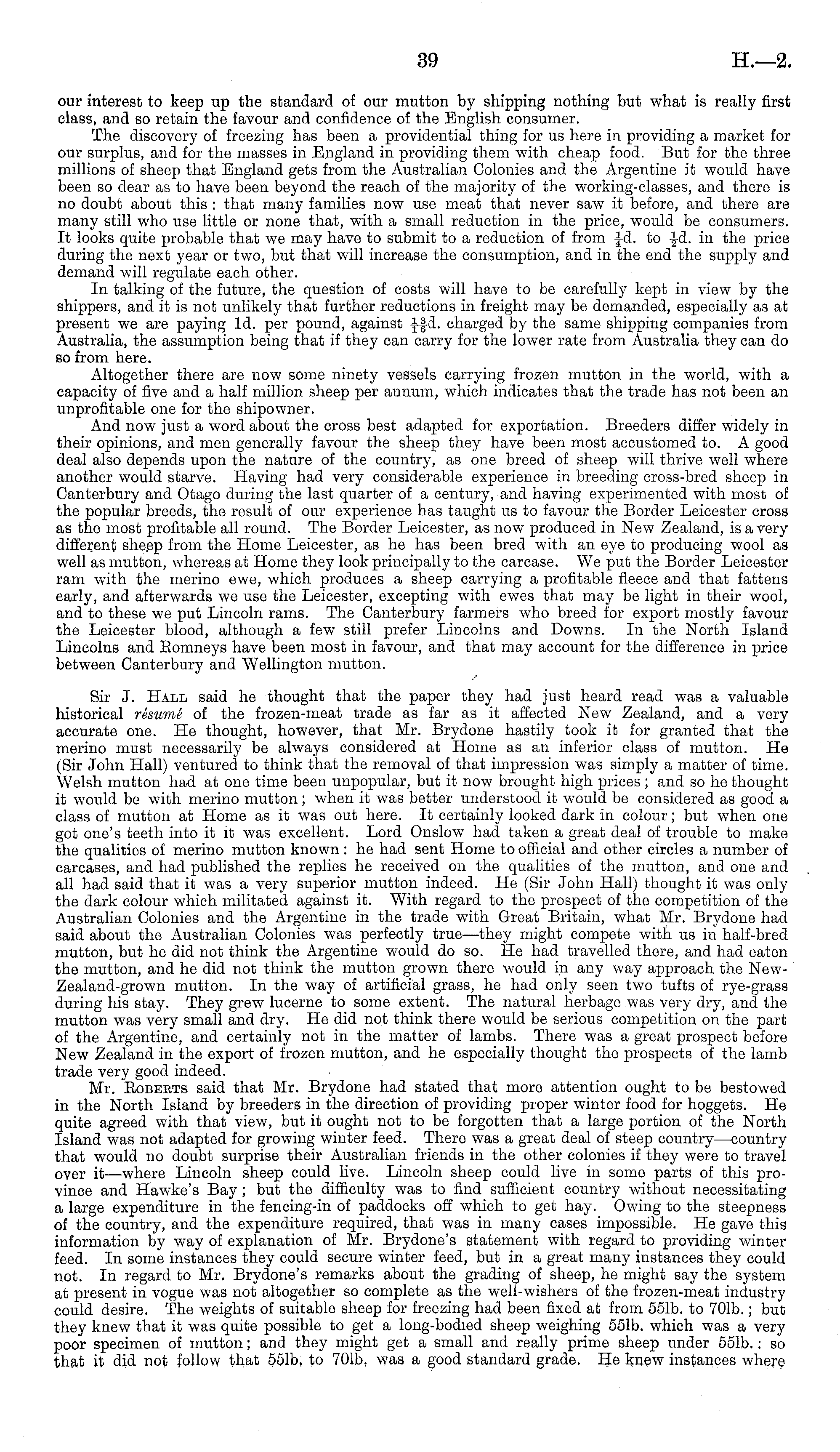 our interest to keep up the standard of our mutton by shipping nothing but what is really first class, and so retain the favour and confidence of the English consumer. The discovery of freezing has been a providential thing for us here in providing a market for our surplus, and for the masses in England in providing them with cheap food. But for the three millions of sheep that England gets from the Australian Colonies and the Argentine it would have been so dear as to have been beyond the reach of the majority of the working-classes, and there is no doubt about this : that many families now use meat that never saw it before, and there are many still who use little or none that, with a small reduction in the price, would be consumers. It looks quite probable that we may have to submit to a reduction of from Jd. to $d. in the price during the next year or two, but that will increase the consumption, and in the end the supply and demand will regulate each other. In talking of the future, the question of costs will have to be carefully kept in view by the shippers, and it is not unlikely that further reductions in freight may be demanded, especially as at present we are paying Id. per pound, against Afd. charged by the same shipping companies from Australia, the assumption being that if they can carry for the lower rate from Australia they can do so from here. Altogether there are now some ninety vessels carrying frozen mutton in the world, with a capacity of five and a half million sheep per annum, which indicates that the trade has not been an unprofitable one for the shipowner. And now just a word about the cross best adapted for exportation. Breeders differ widely in their opinions, and men generally favour the sheep they have been most accustomed to. A good deal also depends upon the nature of the country, as one breed of sheep will thrive well where another would starve. Having had very considerable experience in breeding cross-bred sheep in Canterbury and Otago during the last quarter of a century, and having experimented with most of the popular breeds, the result of our experience has taught us to favour the Border Leicester cross as the most profitable all round. The Border Leicester, as now produced in New Zealand, is a very different sheep from the Home Leicester, as he has been bred with an eye to producing wool as well as mutton, whereas at Home they look principally to the carcase. We put the Border Leicester ram with the merino ewe, which produces a sheep carrying a profitable fleece and that fattens early, and afterwards we use the Leicester, excepting with ewes that may be light in their wool, and to these we put Lincoln rams. The Canterbury farmers who breed for export mostly favour the Leicester blood, although a few still prefer Lincolns and Downs. In the North Island Lincolns and Eomneys have been most in favour, and that may account for the difference in price between Canterbury and Wellington mutton. Sir J. Hall said he thought that the paper they had just heard read was a valuable historical resume of the frozen-meat trade as far as it affected New Zealand, and a very accurate one. He thought, however, that Mr. Brydone hastily took it for granted that the merino must necessarily be always considered at Home as an inferior class of mutton. He (Sir John Hall) ventured to think that the removal of that impression was simply a matter of time. Welsh mutton had at one time been unpopular, but it now brought high prices ; and so he thought it would be with merino mutton; when it was better understood it would be considered as good a class of mutton at Home as it was out here. It certainly looked dark in colour; but when one got one's teeth into it it was excellent. Lord Onslow had taken a great deal of trouble to make the qualities of merino mutton known : he had sent Home to official and other circles a number of carcases, and had published the replies he received on the qualities of the mutton, and one and all had said that it was a very superior mutton indeed. He (Sir John Hall) thought it was only the dark colour which militated against it. With regard to the prospect of the competition of the Australian Colonies and the Argentine in the trade with Great Britain, what Mr. Brydone had said about the Australian Colonies was perfectly true—they might compete with us in half-bred mutton, but he did not think the Argentine would do so. He had travelled there, and had eaten the mutton, and he did not think the mutton grown there would in any way approach the New-Zealand-grown mutton. In the way of artificial grass, he had only seen two tufts of rye-grass during his stay. They grew lucerne to some extent. The natural herbage was very dry, and the mutton was very small and dry. He did not think there would be serious competition on the part of the Argentine, and certainly not in the matter of lambs. There was a great prospect before New Zealand in the export of frozen mutton, and he especially thought the prospects of the lamb trade very good indeed. Mr. Eobeets said that Mr. Brydone had stated that more attention ought to be bestowed in the North Island by breeders in the direction of providing proper winter food for hoggets. He quite agreed with that view, but it ought not to be forgotten that a large portion of the North Island was not adapted for growing winter feed. There was a great deal of steep country—country that would no doubt surprise their Australian friends in the other colonies if they were to travel over it—where Lincoln sheep could live. Lincoln sheep could live in some parts of this province and Hawke's Bay; but the difficulty was to find sufficient country without necessitating a large expenditure in the fencing-in of paddocks off which to get hay. Owing to the steepness of the country, and the expenditure required, that was in many cases impossible. He gave this information by way of explanation of Mr. Brydone's statement with regard to providing wint