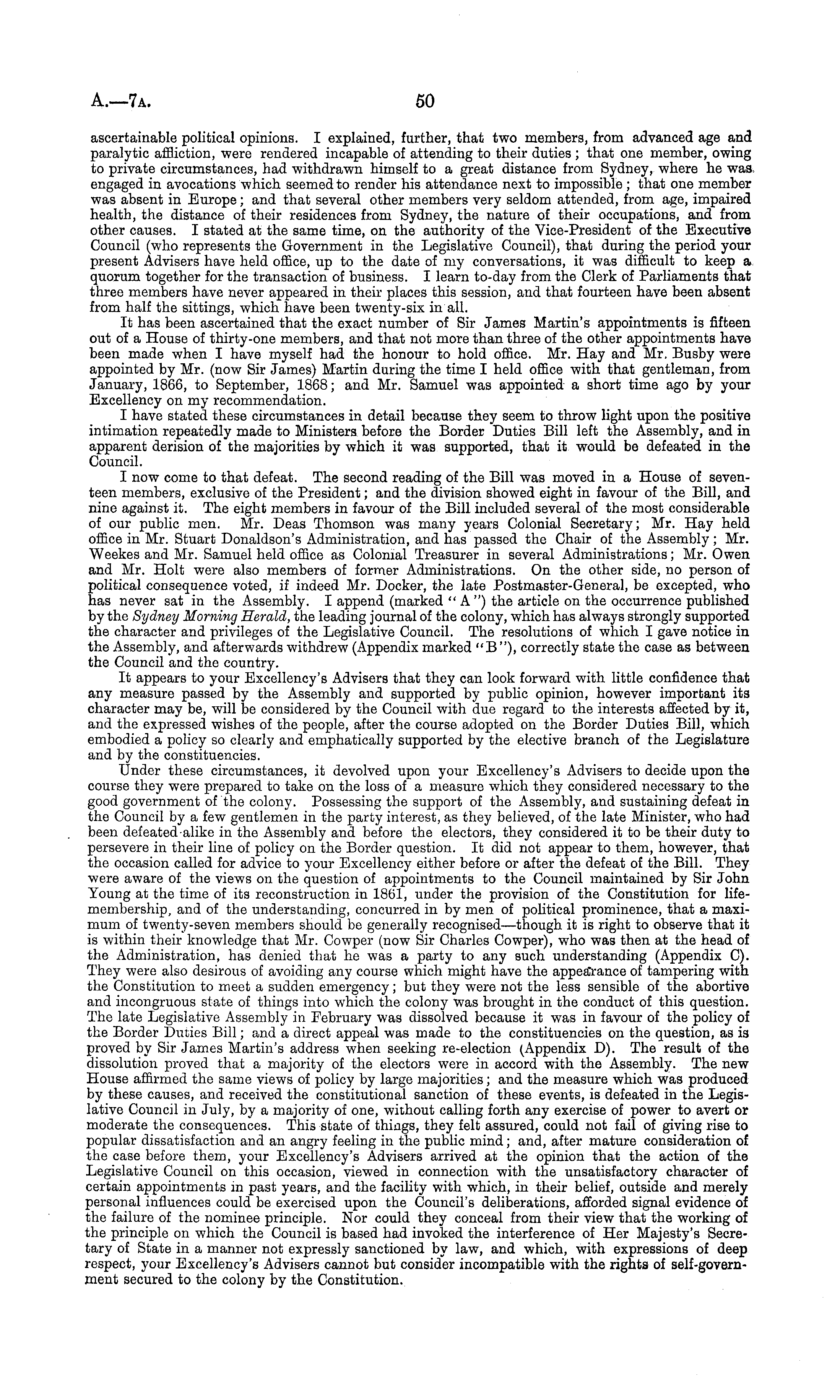 ascertainable political opinions. I explained, further, that two members, from advanced age and paralytic affliction, were rendered incapable of attending to their duties ; that one member, owing to private circumstances, had withdrawn himself to a great distance from Sydney, where he was engaged in avocations which seemed to render his attendance next to impossible ; that one member was absent in Europe; and that several other members very seldom attended, from age, impaired health, the distance of their residences from Sydney, the nature of their occupations, and from other causes. I stated at the same time, on the authority of the Vice-President of the Executive Council (who represents the Government in the Legislative Council), that during the period your present Advisers have held office, up to the date of my conversations, it was difficult to keep a quorum together for the transaction of business. I learn to-day from the Clerk of Parliaments that three members have never appeared in their places this session, and that fourteen have been absent from half the sittings, which have been twenty-six in all. It has been ascertained that the exact number of Sir James Martin's appointments is fifteen out of a House of thirty-one members, and that not more than three of the other appointments have been made when I have myself had the honour to hold office. Mr. Hay and Mr, Busby were appointed by Mr. (now Sir James) Martin during the time I held office with that gentleman, from January, 1866, to September, 1868; and Mr. Samuel was appointed a short time ago by your Excellency on my recommendation. I have stated these circumstances in detail because they seem to throw light upon the positive intimation repeatedly made to Ministers before the Border Duties Bill left the Assembly, and in apparent derision of the majorities by which it was supported, that it would be defeated in the Council. I now come to that defeat. The second reading of the Bill was moved in a House of seventeen members, exclusive of the President; and the division showed eight in favour of the Bill, and nine against it. The eight members in favour of the Bill included several of the most considerable of our public men. Mr. Deas Thomson was many years Colonial Secretary; Mr. Hay held office in Mr. Stuart Donaldson's Administration, and has passed the Chair of the Assembly ; Mr. Weekes and Mr. Samuel held office as Colonial Treasurer in several Administrations; Mr. Owen and Mr. Holt were also members of former Administrations. On the other side, no person of political consequence voted, if indeed Mr. Docker, the late Postmaster-General, be excepted, who has never sat in the Assembly. I append (marked "A ") the article on the occurrence published by the Sydney Morning Herald, the leading journal of the colony, which has always strongly supported the character and privileges of the Legislative Council. The resolutions of which I gave notice in the Assembly, and afterwards withdrew (Appendix marked "B"), correctly state the case as between the Council and the country. It appears to your Excellency's Advisers that they can look forward with little confidence that any measure passed by the Assembly and supported by public opinion, however important its character may be, will be considered by the Council with due regard to the interests affected by it, and the expressed wishes of the people, after the course adopted on the Border Duties Bill, which embodied a policy so clearly and emphatically supported by the elective branch of the Legislature and by the constituencies. Under these circumstances, it devolved upon your Excellency's Advisers to decide upon the course they were prepared to take on the loss of a measure which they considered necessary to the good government of the colony. Possessing the support of the Assembly, and sustaining defeat in the Council by a few gentlemen in the party interest, as they believed, of the late Minister, who had been defeated alike in the Assembly and before the electors, they considered it to be their duty to persevere in their line of policy on the Border question. It did not appear to them, however, that the occasion called for advice to your Excellency either before or after the defeat of the Bill. They were aware of the views on the question of appointments to the Council maintained by Sir John Young at the time of its reconstruction in 1861, under the provision of the Constitution for lifemembership, and of the understanding, concurred in by men of political prominence, that a maximum of twenty-seven members should be generally recognised—though it is right to observe that it is within their knowledge that Mr. Cowper (now Sir Charles Cowper), who was then at the head of the Administration, has denied that he was a party to any such understanding (Appendix C). They were also desirous of avoiding any course which might have the appearance of tampering with the Constitution to meet a sudden emergency; but they were not the less sensible of the abortive and incongruous state of things into which the colony was brought in the conduct of this question. The late Legislative Assembly in February was dissolved because it was in favour of the policy of the Border Duties Bill; and a direct appeal was made to the constituencies on the question, as is proved by Sir James Martin's address when seeking re-election (Appendix D). The result of the dissolution proved that a majority of the electors were in accord with the Assembly. The new House affirmed the same views of policy by large majorities; and the measure which was produced by these causes, and received the constitutional sanction of these events, is defeated in the Legislative Council in July, by a majority of one, without calling forth any exercise of power to avert or moderate the consequences. This state of things, they felt assured, could not fail of giving rise to popular dissatisfaction and an angry feeling in the public mind; and, after m