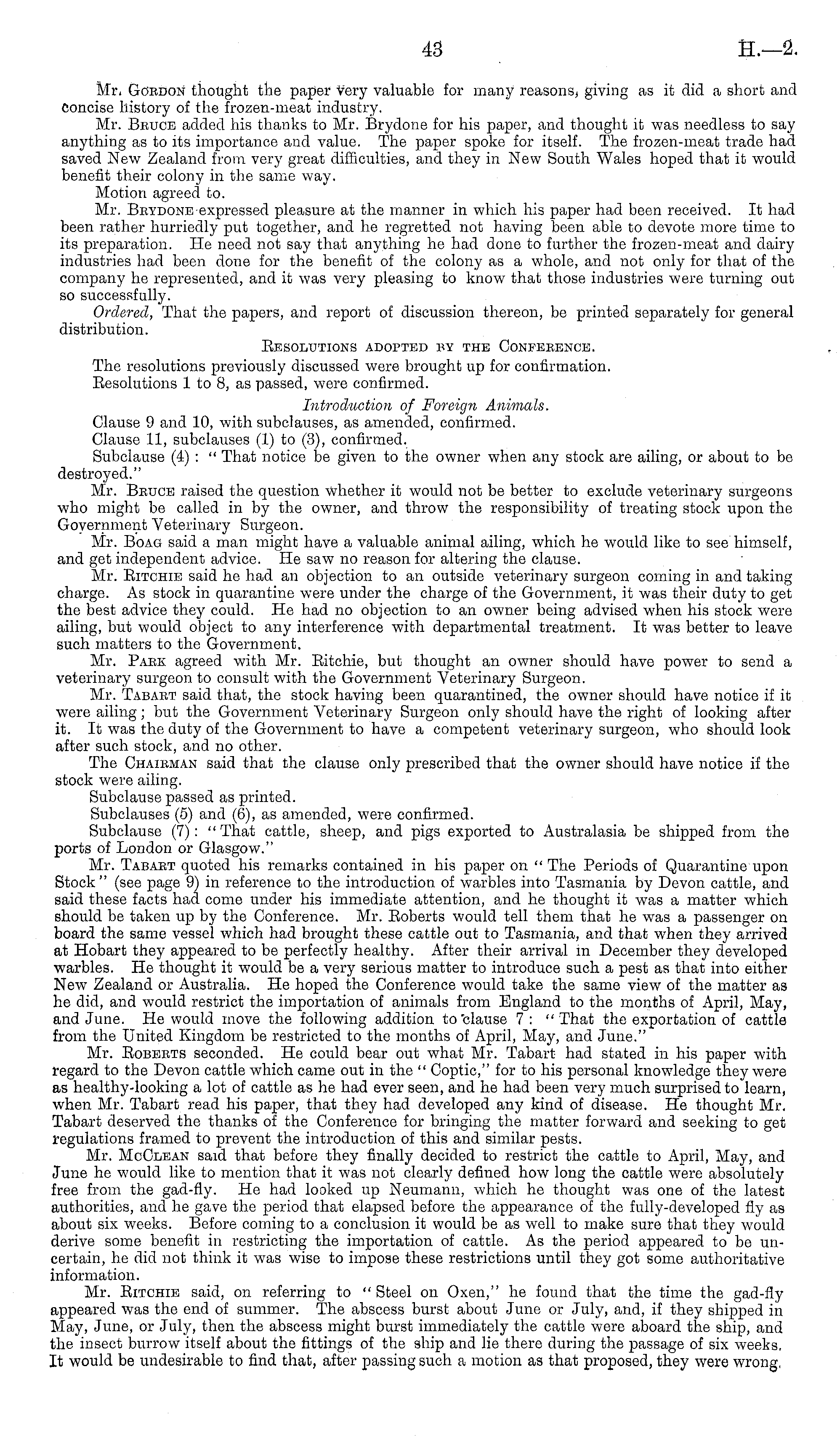 Mr. Goedon thought the paper very valuable for many reasons, giving as it did a short and Concise history of the frozen-meat industry. Mr. Bbuce added his thanks to Mr. Brydone for his paper, and thought it was needless to say anything as to its importance and value. The paper spoke for itself. The frozen-meat trade had saved New Zealand from very great difficulties, and they in New South Wales hoped that it would benefit their colony in the same way. Motion agreed to. Mr. Beydone expressed pleasure at the manner in which his paper had been received. It had been rather hurriedly put together, and he regretted not having been able to devote more time to its preparation. He need not say that anything he had done to further the frozen-meat and dairy industries had been done for the benefit of the colony as a whole, and not only for that of the company he represented, and it was very pleasing to know that those industries were turning out so successfully. Ordered, That the papers, and report of discussion thereon, be printed separately for general distribution. Besolutions adopted by the Confeeence. The resolutions previously discussed were brought up for confirmation. Besolutions 1 to 8, as passed, were confirmed. Introduction of Foreign Animals. Clause 9 and 10, with subclauses, as amended, confirmed. Clause 11, subclauses (1) to (3), confirmed. Subclause (4) : " That notice be given to the owner when any stock are ailing, or about to be destroyed." Mr. Beuce raised the question whether it would not be better to exclude veterinary surgeons who might be called in by the owner, and throw the responsibility of treating stock upon the Government Veterinary Surgeon. Mr. Boag said a man might have a valuable animal ailing, which he would like to see himself, and get independent advice. He saw no reason for altering the clause. Mr. Eitchie said he had an objection to an outside veterinary surgeon coming in and taking charge. As stock in quarantine were under the charge of the Government, it was their duty to get the best advice they could. He had no objection to an owner being advised when his stock were ailing, but would object to any interference with departmental treatment. It was better to leave such matters to the Government. Mr. Pack agreed with Mr. Eitchie, but thought an owner should have power to send a veterinary surgeon to consult with the Government Veterinary Surgeon. Mr. Tabaet said that, the stock having been quarantined, the owner should have notice if it were ailing; but the Government Veterinary Surgeon only should have the right of looking after it. It was the duty of the Government to have a competent veterinary surgeon, who should look after such stock, and no other. The Chaieman said that the clause only prescribed that the owner should have notice if the stock were ailing. Subclause passed as printed. Subclauses (5) and (6), as amended, were confirmed. Subclause (7): " That cattle, sheep, and pigs exported to Australasia be shipped from the ports of London or Glasgow." Mr. Tabaet quoted his remarks contained in his paper on " The Periods of Quarantine upon Stock" (see page 9) in reference to the introduction of warbles into Tasmania by Devon cattle, and said these facts had come under his immediate attention, and he thought it was a matter which should be taken up by the Conference. Mr. Eoberts would tell them that he was a passenger on board the same vessel which had brought these cattle out to Tasmania, and that when they arrived at Hobart they appeared to be perfectly healthy. After their arrival in December they developed warbles. He thought it would be a very serious matter to introduce such a pest as that into either New Zealand or Australia. He hoped the Conference would take the same view of the matter as he did, and would restrict the importation of animals from England to the months of April, May, and June. He would move the following addition to "clause 7: "That the exportation of cattle from the United Kingdom be restricted to the months of April, May, and June." Mr. Eobeets seconded. He could bear out what Mr. Tabart had stated in his paper with regard to the Devon cattle which came out in the " Coptic," for to his personal knowledge they were as healthy-looking a lot of cattle as he had ever seen, and he had been very much surprised to learn, when Mr. Tabart read his paper, that they had developed any kind of disease. He thought Mr. Tabart deserved the thanks of the Conference for bringing the matter forward and seeking to get regulations framed to prevent the introduction of this and similar pests. Mr. McClean said that before they finally decided to restrict the cattle to April, May, and June he would like to mention that it was not clearly defined how long the cattle were absolutely free from the gad-fly. He had looked up Neumann, which he thought was one of the latest authorities, and he gave the period that elapsed before the appearance of the fully-developed fly as about six weeks. Before coming to a conclusion it would be as well to make sure that they would derive some benefit in restricting the importation of cattle. As the period appeared to be uncertain, he did not think it was wise to impose these restrictions until they got some authoritative information. Mr. Eitchie said, on referring to " Steel on Oxen," he found that the time the gad-fly appeared was the end of summer. The abscess burst about June or July, and, if they shipped in May, June, or July, then the abscess might burst immediately the cattle were aboard the ship, and the insect burrow itself about the fittings of the ship and lie there during the passage of six weeks. It would be undesirable to find that, after passing such a motion as that proposed, they were wrong,