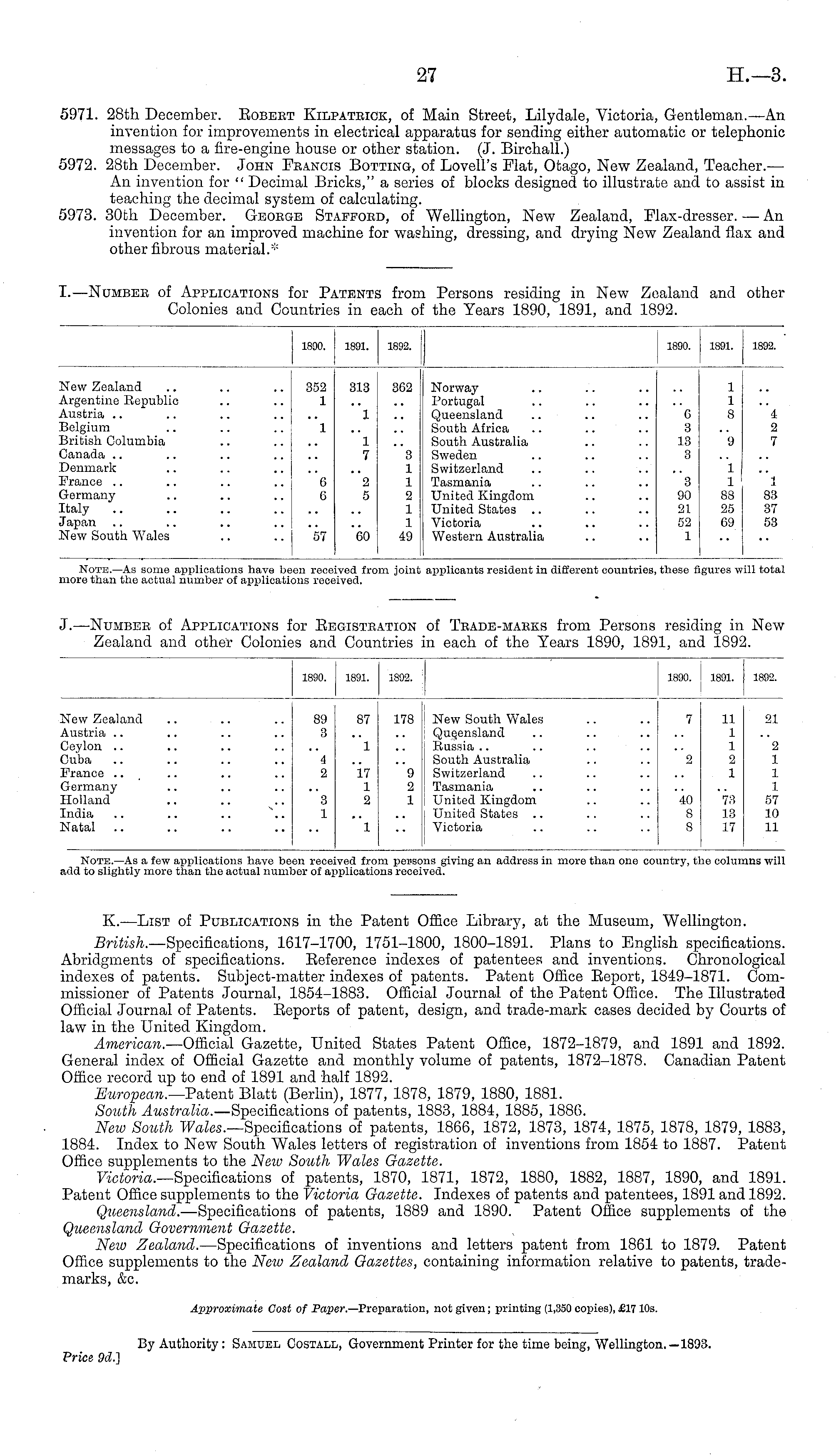X.—List of Publications in the Patent Office Library, at the Museum, Wellington. British.— Specifications, 1617-1700, 1751-1800, 1800-1891. Plans to English specifications. Abridgments of specifications. Reference indexes of patentees and inventions. Chronological indexes of patents. Subject-matter indexes of patents. Patent Office Keport, 1849-1871. Commissioner of Patents Journal, 1854-1883. Official Journal of the Patent Office. The Illustrated Official Journal of Patents. Eeports of patent, design, and trade-mark cases decided by Courts of law in the United Kingdom. American. —Official Gazette, United States Patent Office, 1872-1879, and 1891 and 1892. General index of Official Gazette and monthly volume of patents, 1872-1878. Canadian Patent Office record up to end of 1891 and half 1892. European.—Patent Blatt (Berlin), 1877, 1878, 1879, 1880, 1881. South Australia. —Specifications of patents, 1883, 1884, 1885, 1886. New South Wales.— Specifications of patents, 1866, 1872, 1873, 1874, 1875, 1878, 1879, 1883, 1884. Index to New South Wales letters of registration of inventions from 1854 to 1887. Patent Office supplements to the New South Wales Gazette. Victoria.— Specifications of patents, 1870, 1871, 1872, 1880, 1882, 1887, 1890, and 1891. Patent Office supplements to the Victoria Gazette. Indexes of patents and patentees, 1891 and 1892. Queensland. —Specifications of patents, 1889 and 1890. Patent Office supplements of the Queensland Government Gazette. New Zealand. —Specifications of inventions and letters patent from 1861 to 1879. Patent Office supplements to the New Zealand Gazettes, containing information relative to patents, trademarks, &c.