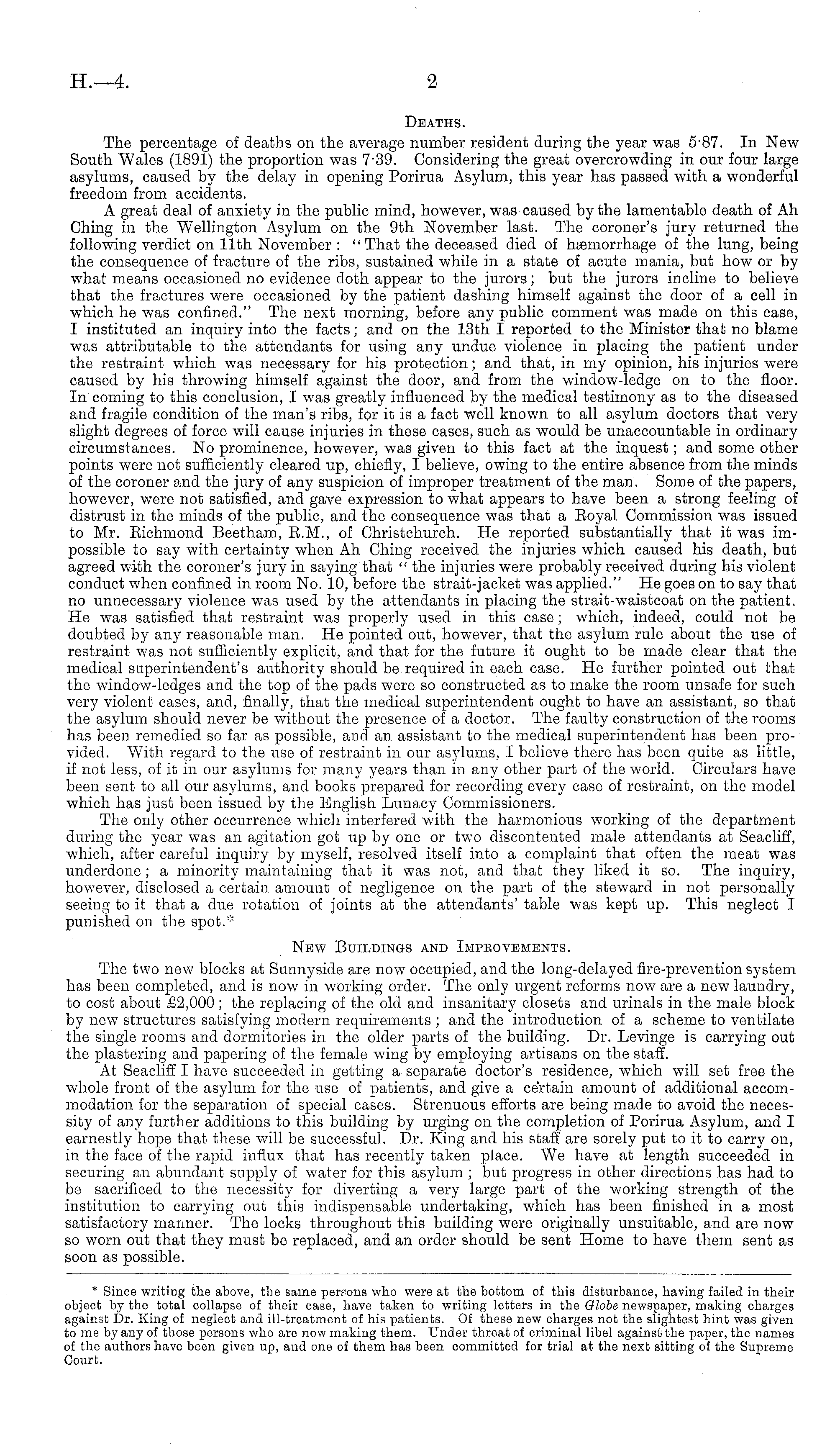 Deaths. The percentage of deaths on the average number resident during the year was 587. In New South Wales (1891) the proportion was 739. Considering the great overcrowding in our four large asylums, caused by the delay in opening Porirua Asylum, this year has passed with a wonderful freedom from accidents. A great deal of anxiety in the public mind, however, was caused by the lamentable death of Ah Ching in the Wellington Asylum on the 9th November last. The coroner's jury returned the following verdict on 11th November : "That the deceased died of haemorrhage of the lung, being the consequence of fracture of the ribs, sustained while in a state of acute mania, but how or by what means occasioned no evidence doth appear to the jurors; but the jurors incline to believe that the fractures were occasioned by the patient dashing himself against the door of a cell in which he was confined." The next morning, before any public comment was made on this case, I instituted an inquiry into the facts; and on the 13th I reported to the Minister that no blame was attributable to the attendants for using any undue violence in placing the patient under the restraint which was necessary for his protection; and that, in my opinion, his injuries were caused by his throwing himself against the door, and from the window-ledge on to the floor. In coming to this conclusion, I was greatly influenced by the medical testimony as to the diseased and fragile condition of the man's ribs, for it is a fact well known to all asylum doctors that very slight degrees of force will cause injuries in these cases, such as would be unaccountable in ordinary circumstances. No prominence, however, was given to this fact at the inquest; and some other points were not sufficiently cleared up, chiefly, I believe, owing to the entire absence from the minds of the coroner a.nd the jury of any suspicion of improper treatment of the man. Some of the papers, however, were not satisfied, and gave expression to what appears to have been a strong feeling of distrust in the minds of the public, and the consequence was that a Eoyal Commission was issued to Mr. Eichmond Beetham, E.M., of Christchurch. He reported substantially that it was impossible to say with certainty when Ah Ching received the injuries which caused his death, but agreed with the coroner's jury in saying that " the injuries were probably received during his violent conduct when confined in room No. 10, before the strait-jacket was applied." He goes on to say that no unnecessary violence was used by the attendants in placing the strait-waistcoat on the patient. He was satisfied that restraint was properly used in this case; which, indeed, could not be doubted by any reasonable man. He pointed out, however, that the asylum rule about the use of restraint was not sufficiently explicit, and that for the future it ought to be made clear that the medical superintendent's authority should be required in each case. He further pointed out that the window-ledges and the top of the pads were so constructed as to make the room unsafe for such very violent cases, and, finally, that the medical superintendent ought to have an assistant, so that the asylum should never be without the presence of a doctor. The faulty construction of the rooms has been remedied so far as possible, and an assistant to the medical superintendent has been provided. With regard to the use of restraint in our asylums, I believe there has been quite as little, if not less, of it in our asylums for many years than in any other part of the world. Circulars have been sent to all our asylums, and books prepared for recording every case of restraint, on the model which has just been issued by the English Lunacy Commissioners. The only other occurrence which interfered with the harmonious working of the department during the year was an agitation got up by one or two discontented male attendants at Seacliff, which, after careful inquiry by myself, resolved itself into a complaint that often the meat was underdone ; a minority maintaining that it was not, and that they liked it so. The inquiry, however, disclosed a certain amount of negligence on the part of the steward in not personally seeing to it that a due rotation of joints at the attendants' table was kept up. This neglect I punished on the spot." New Buildings and Improvements. The two new blocks at Sunnyside are now occupied, and the long-delayed fire-prevention system has been completed, and is now in working order. The only urgent reforms now are a new laundry, to cost about £2,000; the replacing of the old and insanitary closets and urinals in the male block by new structures satisfying modern requirements ; and the introduction of a scheme to ventilate the single rooms and dormitories in the older parts of the building. Dr. Levinge is carrying out the plastering and papering of the female wing by employing artisans on the staff. At Seacliff I have succeeded in getting a separate doctor's residence, which will set free the whole front of the asylum for the use of patients, and give a certain amount of additional accommodation for the separation of special cases. Strenuous efforts are being made to avoid the necessity of any further additions to this building by urging on the completion of Porirua Asylum, and I earnestly hope that these will be successful. Dr. King and his staff are sorely put to it to carry on, in the face of the rapid influx that has recently taken place. We have at length succeeded in securing an abundant supply of water for this asylum ; but progress in other directions has had to be sacrificed to the necessity for diverting a very large part of the working strength of the institution to carrying out tiiis indispensable undertaking, which has been finished in a most satisfactory manner. The locks throughout this building were originally unsuitable, and are now so worn out that they must be replaced, and an order should be sent Home 