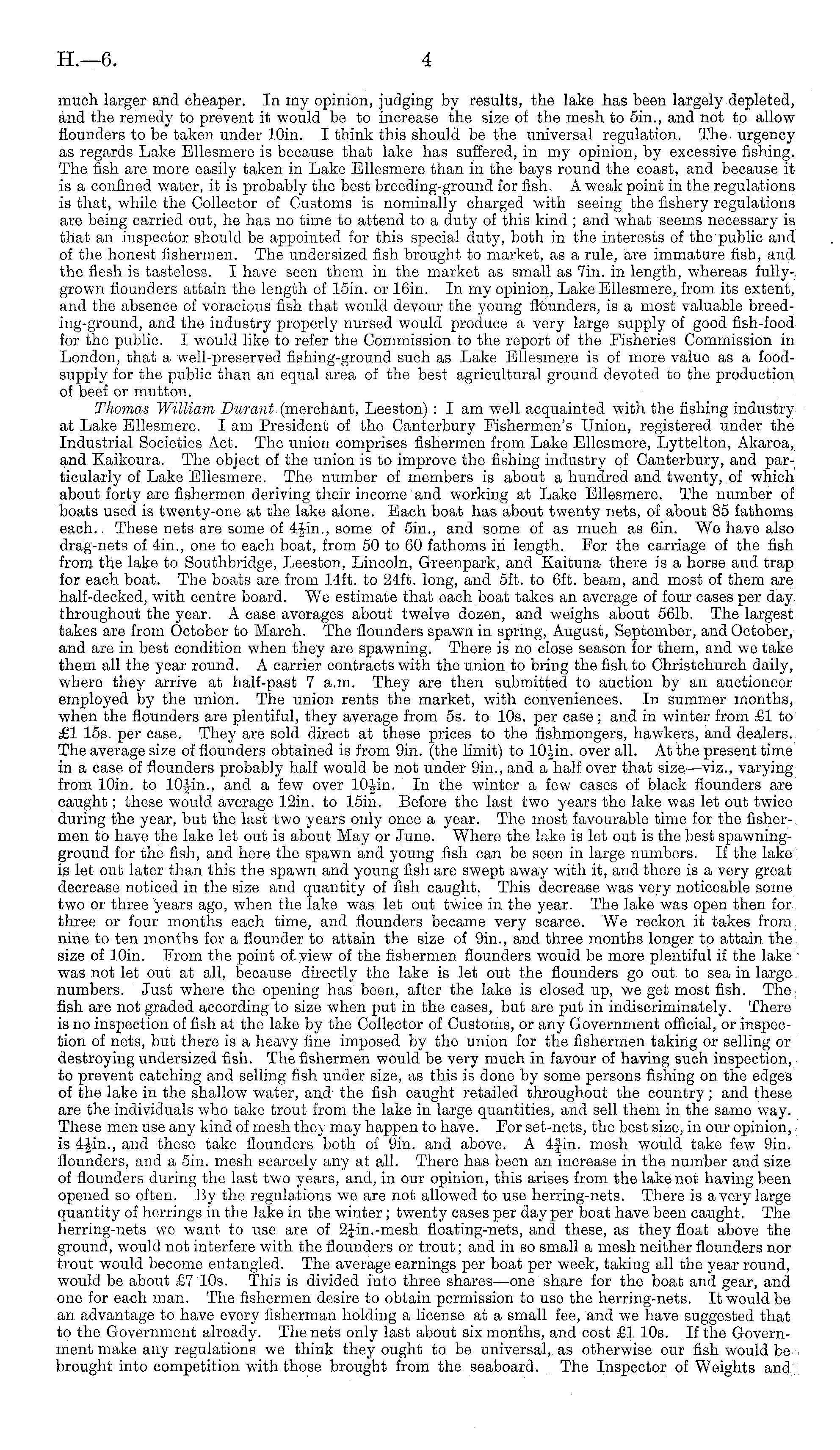 much larger and cheaper. In my opinion, judging by results, the lake has been largely depleted, and the remedy to prevent it would be to increase the size of the mesh to sin., and not to allow flounders to be taken under 10in. I think this should be the universal regulation. The urgency as regards Lake Ellesmere is because that lake has suffered, in my opinion, by excessive fishing. The fish are more easily taken in Lake Ellesmere than in the bays round the coast, and because it is a confined water, it is probably the best breeding-ground for fish. A weak point in the regulations is that, while the Collector of Customs is nominally charged with seeing the fishery regulations are being carried out, he has no time to attend to a duty of this kind ; and what seems necessary is that an inspector should be appointed for this special duty, both in the interests of the public and of the honest fishermen. The undersized fish brought to market, as a rule, are immature fish, and the flesh is tasteless. I have seen them in the market as small as 7in. in length, whereas fullygrown flounders attain the length of 15in. or 16in. In my opinion, Lake Ellesmere, from its extent, and the absence of voracious fish that would devour the young flounders, is a most valuable breed-ing-ground, and the industry properly nursed would produce a very large supply of good fish-food for the public. I would like to refer the Commission to the report of the Fisheries Commission in London, that a well-preserved fishing-ground such as Lake Ellesmere is of more value as a foodsupply for the public than an equal area of the best agricultural ground devoted to the production of beef or mutton. Thomas William Durant (merchant, Leeston) : I am well acquainted with the fishing industry at Lake Ellesmere. lam President of the Canterbury Fishermen's Union, registered under the Industrial Societies Act. The union comprises fishermen from Lake Ellesmere, Lyttelton, Akaroa, and Kaikoura. The object of the union is to improve the fishing industry of Canterbury, and particularly of Lake Ellesmere. The number of members is about a hundred and twenty, of which about forty are fishermen deriving their income and working at Lake Ellesmere. The number of boats used is twenty-one at the lake alone. Each boat has about twenty nets, of about 85 fathoms each.. These nets are some of 4Jin., some of 5m., and some of as much as 6in. We have also drag-nets of 4in., one to each boat, from 50 to 60 fathoms in length. For the carriage of the fish from the lake to Southbridge, Leeston, Lincoln, Greenpark, and Kaituna there is a horse and trap for each boat. The boats are from 14ft. to 24ft. long, and sft. to 6ft. beam, and most of them are half-decked, with centre board. We estimate that each boat takes an average of four cases per day throughout the year. A case averages about twelve dozen, and weighs about 561b. The largest takes are from October to March. The flounders spawn in spring, August, September, and October, and are in best condition when they are spawning. There is no close season for them, and we take them all the year round. A carrier contracts with the union to bring the fish to Christchurch daily, where they arrive at half-past 7 a.m. They are then submitted to auction by an auctioneer employed by the union. The union rents the market, with conveniences. In summer months, when the flounders are plentiful, they average from ss. to 10s. per case ; and in winter from £1 to £1 15s. per case. They are sold direct at these prices to the fishmongers, hawkers, and dealers. The average size of flounders obtained is from 9in. (the limit) to 10f in. over all. At the present time in a case of flounders probably half would be not under 9in., and a half over that size—viz., varying from 10in. to lOJin., and a few over lOfin. In the winter a few cases of black flounders are caught; these would average 12in. to 15in. Before the last two years the lake was let out twice during the year, but the last two years only once a year. The most favourable time for the fishermen to have the lake let out is about May or June. Where the lake is let out is the best spawningground for the fish, and here the spawn and young fish can be seen in large numbers. If the lake is let out later than this the spawn and young fish are swept away with it, and there is a very great decrease noticed in the size and quantity of fish caught. This decrease was very noticeable some two or three years ago, when the lake was let out twice in the year. The lake was open then for three or four months each time, and flounders became very scarce. We reckon it takes from nine to ten months for a flounder to attain the size of 9in., and three months longer to attain the size of 10in. From the point of. view of the fishermen flounders would be more plentiful if the lake was not let out at all, because directly the lake is let out the flounders go out to sea in large numbers. Just where the opening has been, after the lake is closed up, we get most fish. The fish are not graded according to size when put in the cases, but are put in indiscriminately. There is no inspection of fish at the lake by the Collector of Customs, or any Government official, or inspection of nets, but there is a heavy fine imposed by the union for the fishermen taking or selling or destroying undersized fish. The fishermen would be very much in favour of having such inspection, to prevent catching and selling fish under size, as this is done by some persons fishing on the edges of the lake in the shallow water, and , the fish caught retailed throughout the country; and these are the individuals who take trout from the lake in large quantities, and sell them in the same way. These men use any kind of mesh they may happen to have. For set-nets, the best size, in our opinion, is 4Jin., and these take flounders both of 9in. and above. A 4fin. mesh would take few 9in. flounders, and a sin. mesh scarcely any at all. Ther