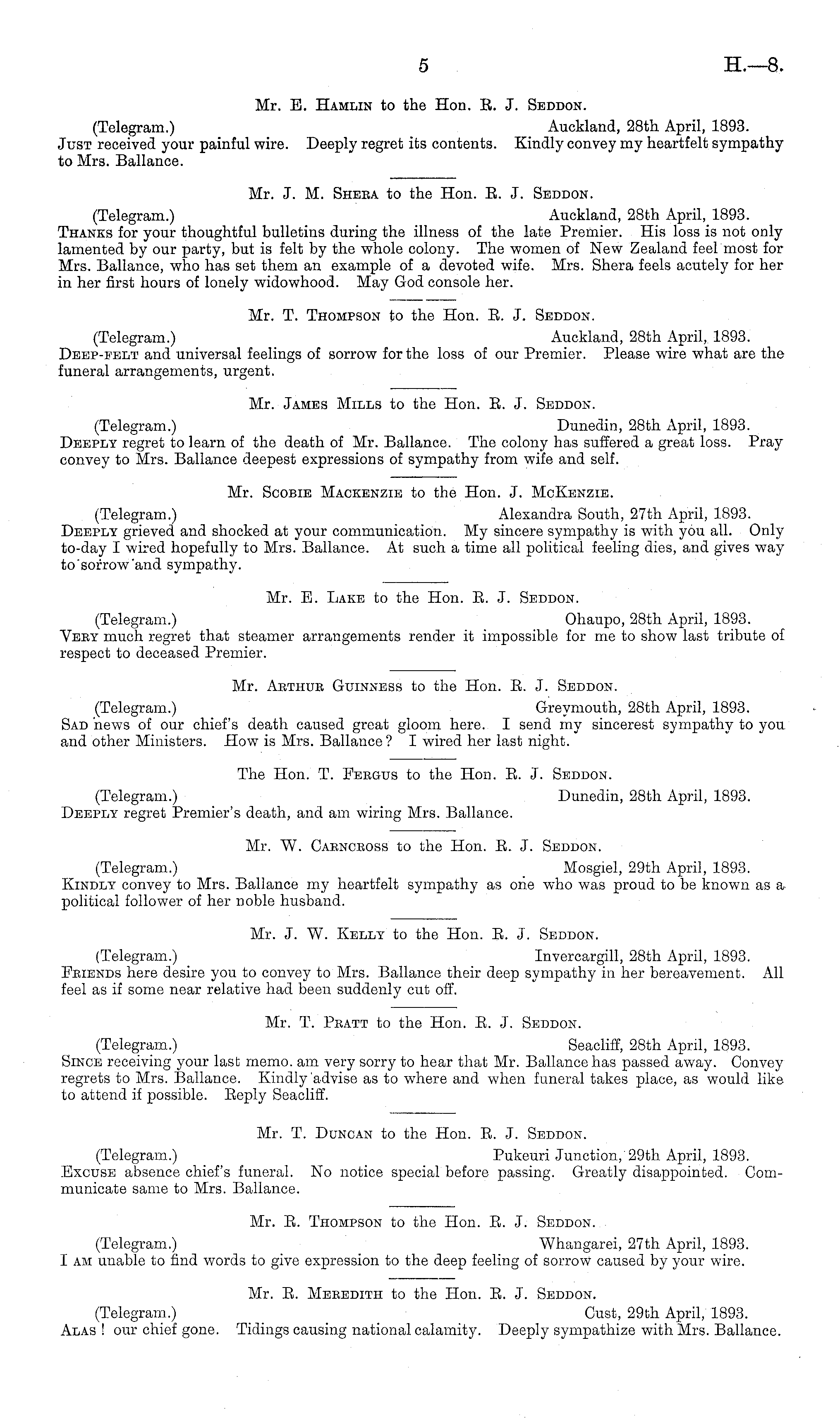 The Hon. T. Fergus to the Hon. R. J. Seddon. (Telegram.) Dunedin, 28th April, 1893. Deeply regret Premier's death, and am wiring Mrs. Ballance.