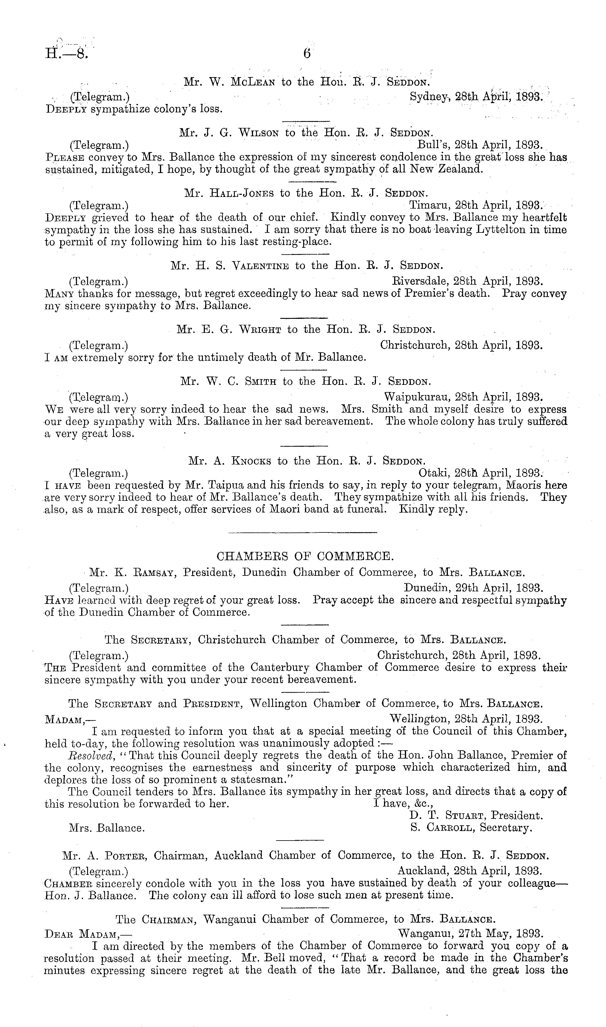 The Secretary and Peesident, Wellington Chamber of Commerce, to Mrs. Ballance. Madam— Wellington, 28th April, 1893. I am requested to inform you that at a special meeting of the Council of this Chamber, held to-day, the following resolution was unanimously adopted : — Resolved, "That this Council deeply regrets the death of the Hon. John Ballance, Premier of the colony, recognises the earnestness and sincerity of purpose which characterized him, and deplores the loss of so prominent a statesman." The Council tenders to Mrs. Ballance its sympathy in her great loss, and directs that a copy of this resolution be forwarded to her. I have, &c, D. T. Stuart, President. Mrs. Ballance. S. Carroll, Secretary.