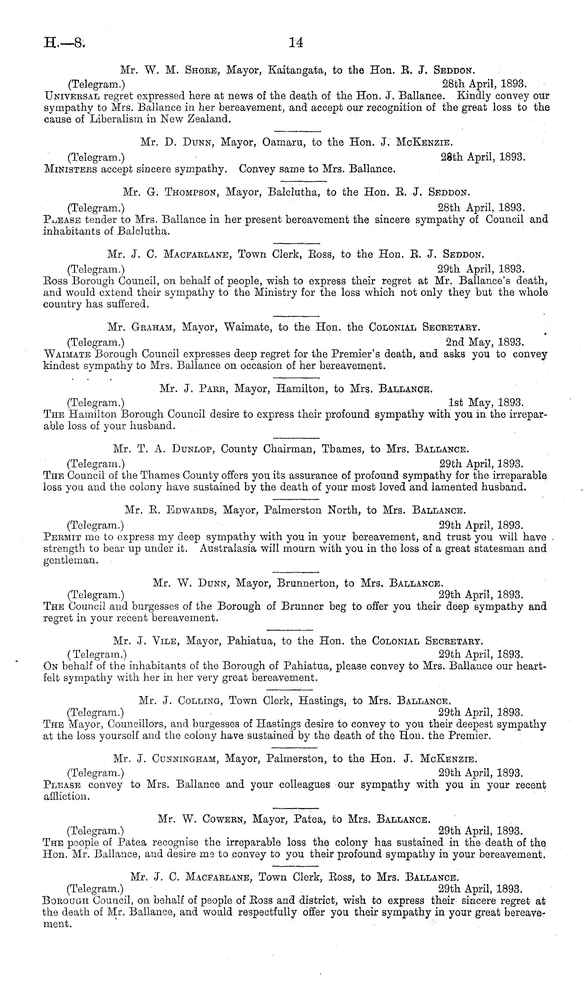 Mr. W. Dunn, Mayor, Brunnerton, to Mrs. Ballance. (Telegram.) 29th April, 1893. The Council and burgesses of the Borough of Brunner beg to offer you their deep sympathy and regret in your recent bereavement.