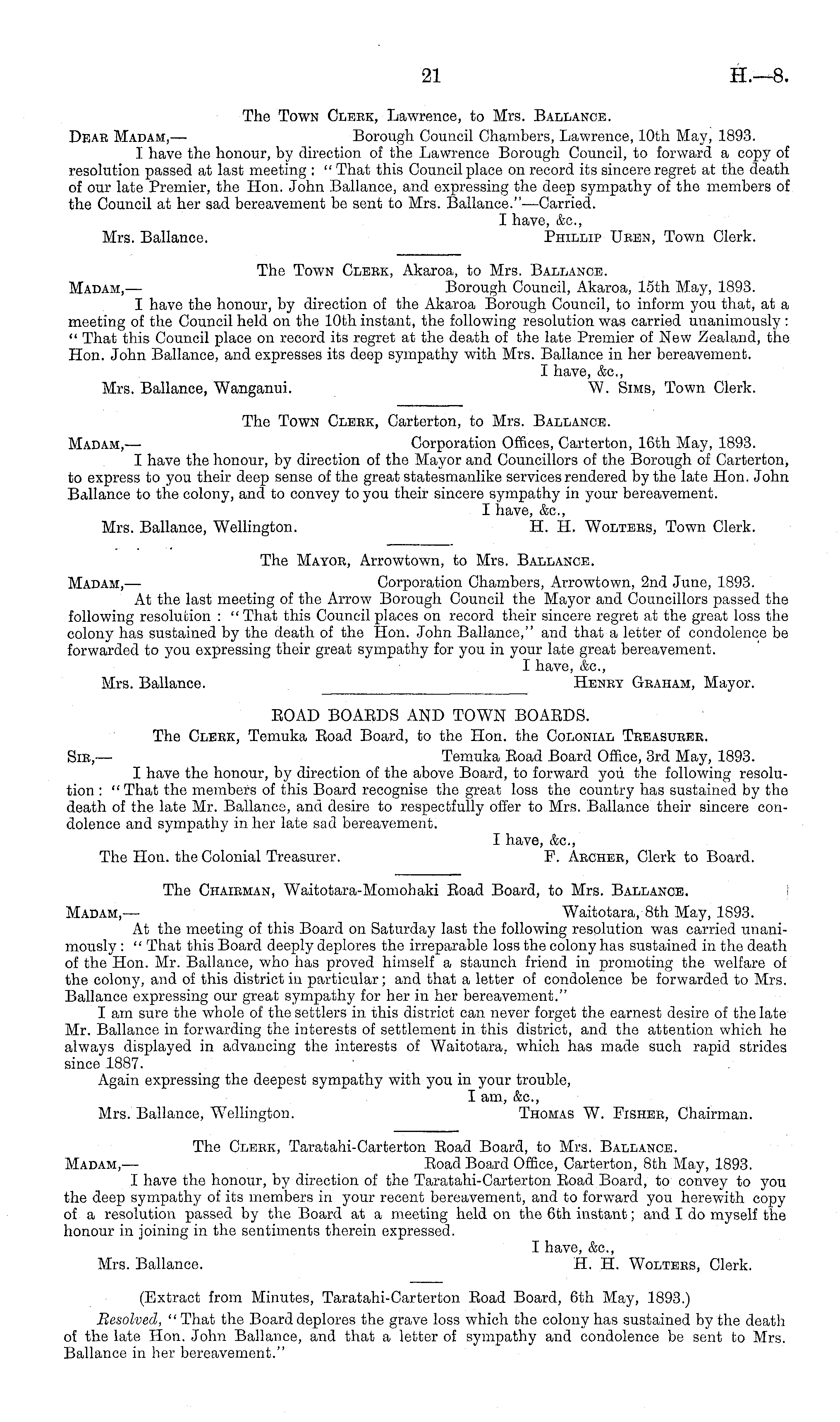 The Town Cleek, Carterton, to Mrs. Ballance. Madam, — Corporation Offices, Carterton, 16th May, 1893. I have the honour, by direction of the Mayor and Councillors of the Borough of Carterton, to express to you their deep sense of the great statesmanlike services rendered by the late Hon. John Ballance to the colony, and to convey to you their sincere sympathy in your bereavement. I have, &c, Mrs. Ballance, Wellington. H. H. Woltees, Town Clerk.