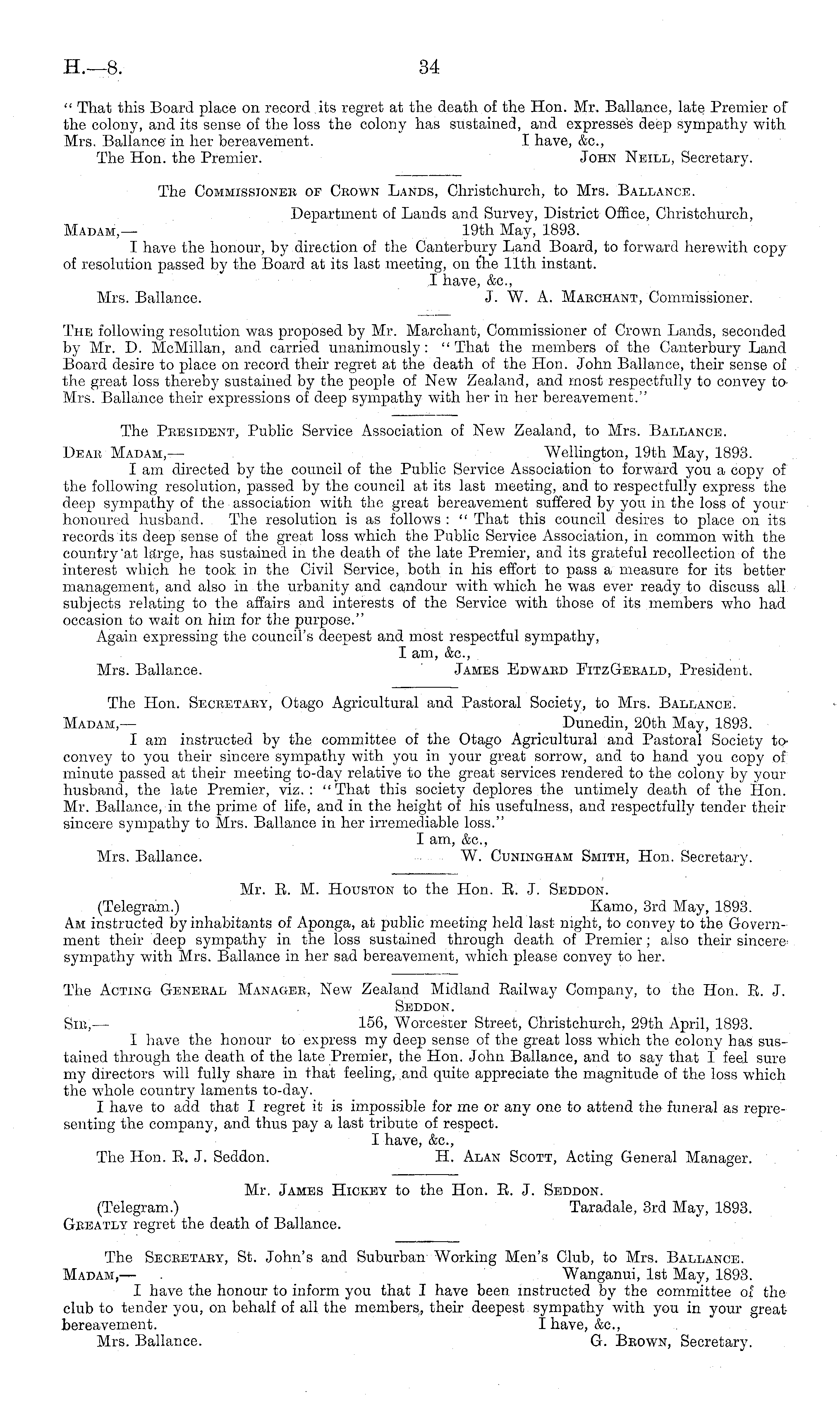 The Acting General Manager, New Zealand Midland Railway Company, to the Hon. R. J. Seddon. Sib, — 156, Worcester Street, Christchurch, 29th April, 1893. I have the honour to express my deep sense of the great loss which the colony has sustained through the death of the late Premier, the Plon. John Ballance, and to say that I feel sure my directors will fully share in that feeling, and quite appreciate the magnitude of the loss which the whole country laments to-day. I have to add that I regret it is impossible for me or any one to attend the funeral as representing the company, and thus pay a last tribute of respect. I have, &c, The Hon. R. J. Seddon. H. Alan Scott, Acting General Manager.