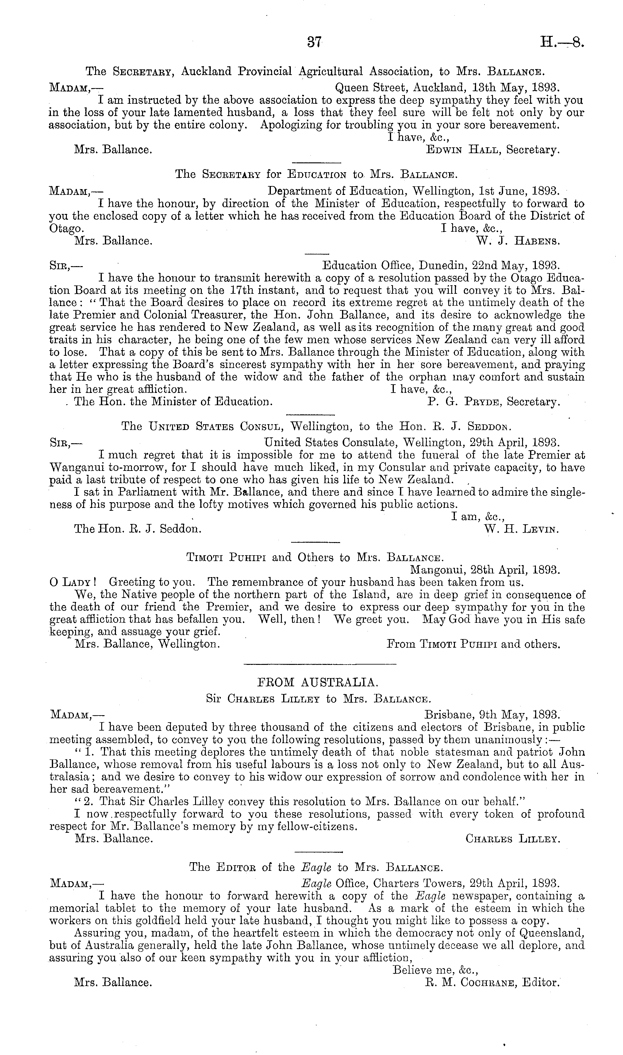 The Seceetaey, Auckland Provincial Agricultural Association, to Mrs. Ballance. Madam, — Queen Street, Auckland, 13th May, 1893. I am instructed by the above association to express the deep sympathy they feel with you in the loss of your late lamented husband, a loss that they feel sure will be felt not only by our association, but by the entire colony. Apologizing for troubling you in your sore bereavement. I have, &c, Mrs. Ballance. Edwin Hall, Secretary.