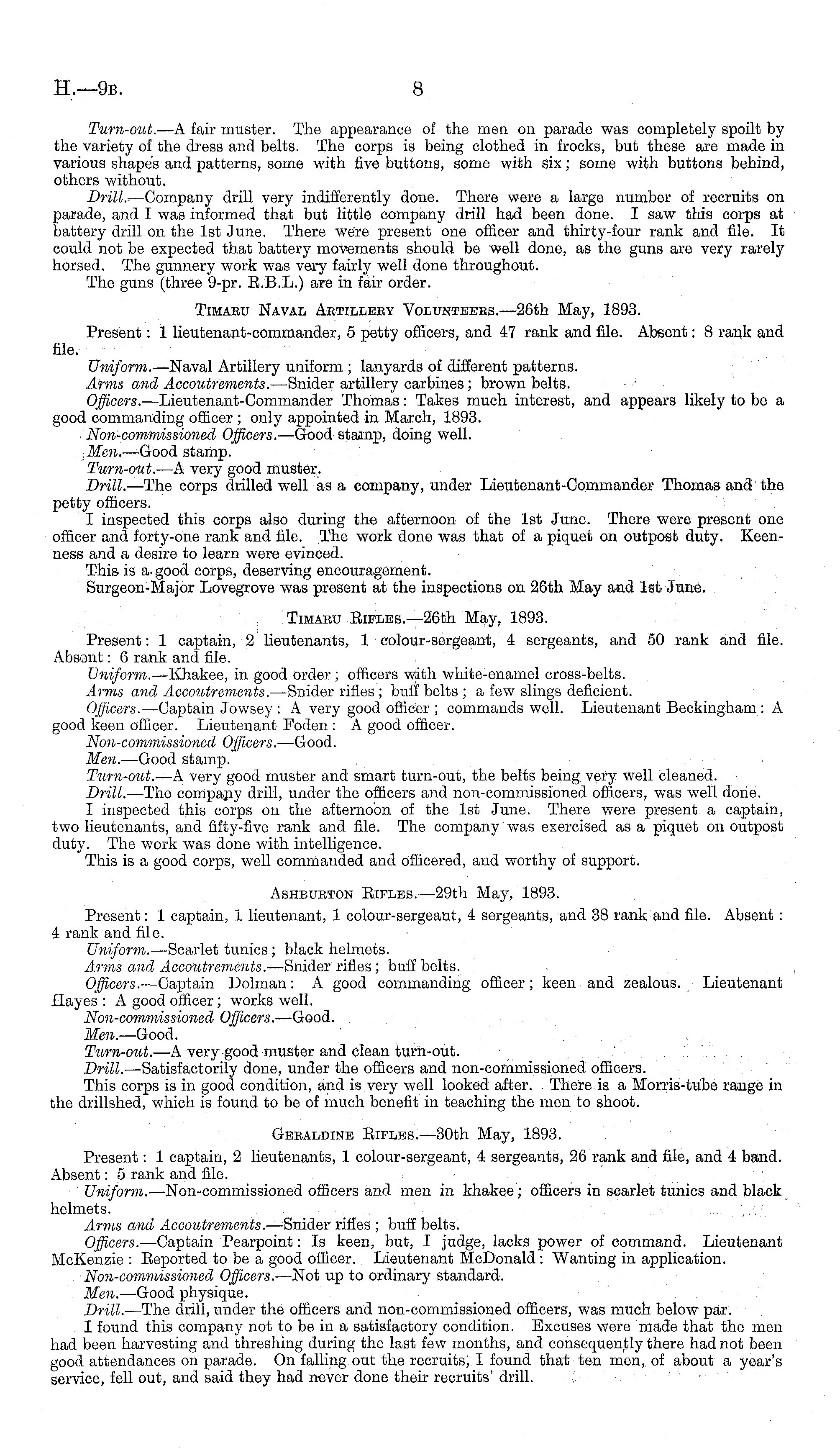 Turn-out. —A fair muster. The appearance of the men on parade was completely spoilt by the variety of the dress and belts. The corps is being clothed in frocks, but these are made in various shapes and patterns, some with five buttons, some with six; some with buttons behind, others without. Drill.-. —Company drill very indifferently done. There were a large number of recruits on parade, and I was informed that but little company drill had been done. I saw this corps at battery drill on the Ist June. There were present one officer and thirty-four rank and file. It could not be expected that battery movements should be well done, as the guns are very rarely horsed. The gunnery work was very fairly well done throughout. The guns (three 9-pr. R.8.L.) are in fair order. Timaru Naval Artillery Volunteers.—26th May, 1893. Present: 1 lieutenant-commander, 5 petty officers, and 47 rank and file. Absent: 8 rank and file. Uniform. —Naval Artillery uniform ; lanyards of different patterns. Arms and Accoutrements. —Snider artillery carbines; brown belts. Officers. —Lieutenant-Commander Thomas: Takes much interest, and appears likely to be a good commanding officer ; only appointed in March, 1893. Non-commissioned Officers. —Good stamp, doing well. Men. —Good stamp. Turn-out. —A very good muster. Drill. —The corps drilled well as a company, under Lieutenant-Commander Thomas and the petty officers. I inspected this corps also during the afternoon of the Ist June. There were present one officer and forty-one rank and file. The work done was that of a piquet on outpost duty. Keenness and a desire to learn were evinced. This is a-good corps, deserving encouragement. Surgeon-Major Lovegrove was present at the inspections on 26th May and Ist June. Timaru Rifles.—26th May, 1893. Present: 1 captain, 2 lieutenants, 1 colour-sergeant, 4 sergeants, and 50 rank and file. Absent: 6 rank and file. Uniform. —Khakee, in good order ; officers with white-enamel cross-belts. Arms and Accoutrements. —Snider rifles; buff belts ; a few slings deficient. Officers. —Captain Jowsey : A very good officer ; commands well. Lieutenant Beckingham : A good keen officer. Lieutenant Foden : A good officer. Non-commissioned Officers. —Good. Men. —Good stamp. Turn-out. —A very good muster and smart turn-out, the belts being very well cleaned. Drill. —The company drill, under the officers and non-commissioned officers, was well done. I inspected this corps on the afternoon of the Ist June. There were present a captain, two lieutenants, and fifty-five rank and file. The company was exercised as a piquet on outpost duty. The work was done with intelligence. This is a good corps, well commanded and officered, and worthy of support. Ashburton Eifles. —29th May, 1893. Present: 1 captain, 1 lieutenant, 1 colour-sergeant, 4 sergeants, and 38 rank and file. Absent : 4 rank and file. Uniform. —Scarlet tunics; black helmets. Arms and Accoutrements. —Snider rifles; buff belts. Officers. —Captain Dolman: A good commanding officer; keen and zealous. Lieutenant Hayes : A good officer; works well. Non-commissioned Officers. —Good. Men.-— Good. Turn-out.- —A very good muster and clean turn-out. Drill. —Satisfactorily done, under the officers and non-commissioned officers. This corps is in good condition, and is very well looked after. There is a Morris-tube range in the drillshed, which is found to be of much benefit in teaching the men to shoot. Geraldine Eifles.—3oth May, 1893. Present: 1 captain, 2 lieutenants, 1 colour-sergeant, 4 sergeants, 26 rank and file, and 4 band. Absent: 5 rank and file. Uniform. —Non-commissioned officers and men in khakee ; officers in scarlet tunics and black helmets. Arms and Accoutrements. —Snider rifles ; buff belts. Officers. —Captain Pearpoint: Is keen, but, I judge, lacks power of command. Lieutenant McKenzie : Eeported to be a good officer. Lieutenant McDonald : Wanting in application. Non-commissioned Officers. —-Not up to ordinary standard. Man. —Good physique. Drill. —The drill, under the officers and non-commissioned officers, was much below par. I found this company not to be in a satisfactory condition. Excuses were made that the men had been harvesting and threshing during the last few months, and consequently there had not been good attendances on parade. On falling out the recruits, I found that ten men,, of about a year's service, fell out, and said they had never done their recruits' drill.
