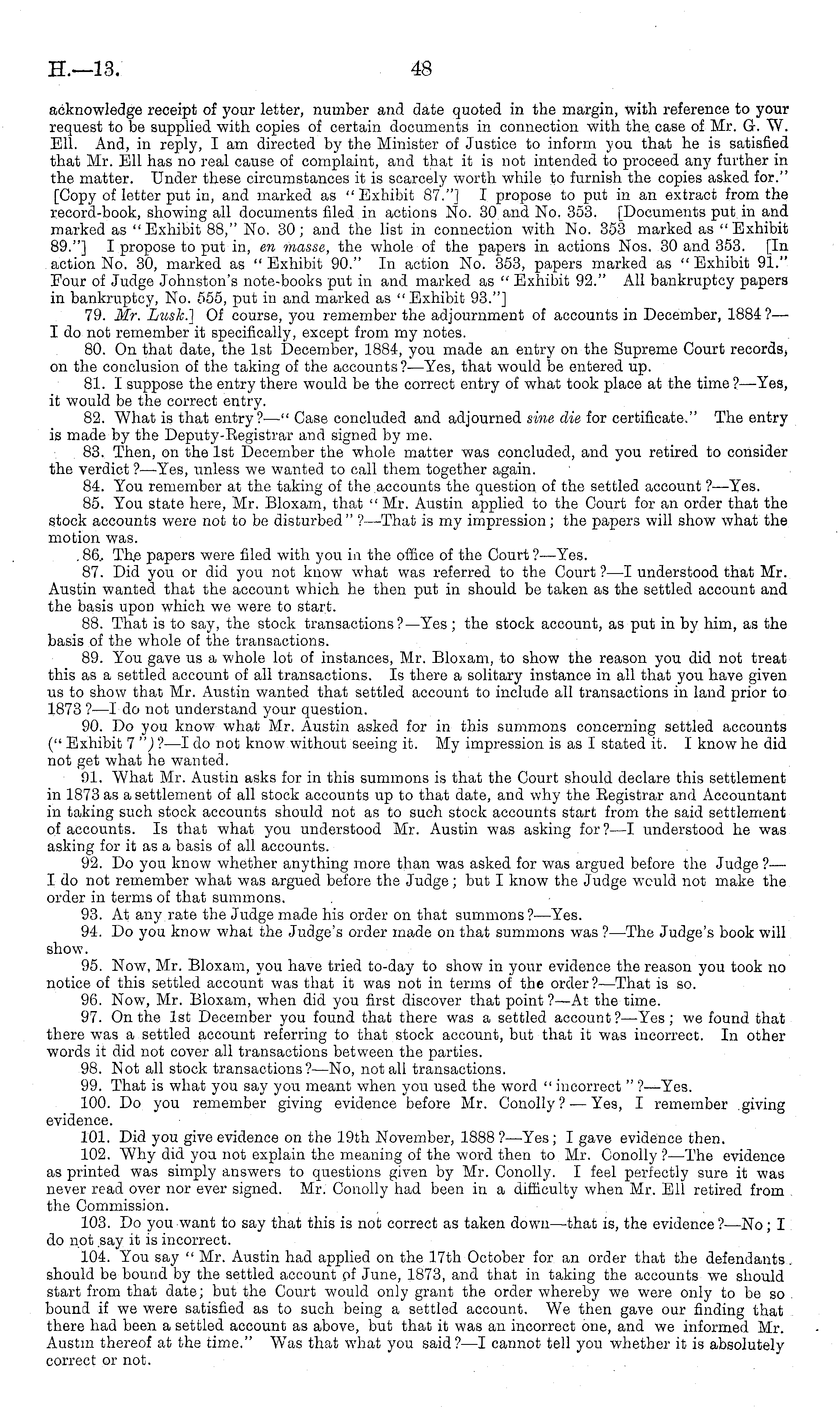 acknowledge receipt of your letter, number and date quoted in the margin, with reference to your request to be supplied with copies of certain documents in connection with the case of Mr. G. W. Ell. And, in reply, lam directed by the Minister of Justice to inform you that he is satisfied that Mr. Ell has no real cause of complaint, and that it is not intended to proceed any further in the matter. Under these circumstances it is scarcely worth while to furnish the copies asked for." [Copy of letter put in, and marked as " Exhibit 87."] I propose to put in an extract from the record-book, showing all documents filed in actions No. 30 and No. 353. [Documents put in and marked as "Exhibit 88," No. 30; and the list in connection with No. 353 marked as "Exhibit 89."] I propose to put in, en masse, the whole of the papers in actions Nos. 30 and 353. [In action No. 30, marked as "Exhibit 90." In action No. 353, papers marked as "Exhibit 91." Four of Judge Johnston's note-books put in and marked as " Exhibit 92." All bankruptcy papers in bankruptcy, No. 555, put in and marked as " Exhibit 93."] 79. Mr. Lusk.] Of course, you remember the adjournment of accounts in December, 1884 ?— I do not remember it specifically, except from my notes. 80. On that date, the Ist December, 1884, you made an entry on the Supreme Court records, on the conclusion of the taking of the accounts? —Yes, that would be entered up. 81. I suppose the entry there would be the correct entry of what took place at the time ? —Yes, it would be the correct entry. 82. What is that entry? —" Case concluded and adjourned sine die for certificate." The entry is made by the Deputy-Eegistrar and signed by me. 83. Then, on the Ist December the whole matter was concluded, and you retired to consider the verdict ?—Yes, unless we wanted to call them together again. 84. You remember at the taking of the accounts the question of the settled account ? —Yes. 85. You state here, Mr. Bloxam, that " Mr. Austin applied to the Court for an order that the stock accounts were not to be disturbed" ?—That is my impression; the papers will show what the motion was. . 86.. Th.c papers were filed with you in the office of the Court ?—Yes. 87. Did you or did you not know what was referred to the Court ?—I understood that Mr. Austin wanted, that the account which he then put in should be taken as the settled account and the basis upon which we were to start. 88. That is to say, the stock transactions?— Yes ; the stock account, as put in by him, as the basis of the whole of the transactions. 89. You gave us a whole lot of instances, Mr. Bloxam, to show the reason you did not treat this as a settled account of all transactions. Is there a solitary instance in all that you have given us to show that Mr. Austin wanted that settled account to include all transactions in land prior to 1873 ?—I do not understand your question. 90. Do you know what Mr. Austin asked for in this summons concerning settled accounts (" Exhibit 7") ?—I do not know without seeing it. My impression is as I stated it. I know he did not get what he wanted. 91. What Mr. Austin asks for in this summons is that the Court should declare this settlement in 1873 as a settlement of all stock accounts up to that date, and why the Eegistrar and Accountant in taking such stock accounts should not as to such stock accounts start from the said settlement of accounts. Is that what you understood Mr. Austin was asking for?—l understood he was asking for it as a basis of all accounts. 92. Do you know whether anything more than was asked for was argued before the Judge ?— Ido not remember what was argued before the Judge; but I know the Judge would not make the order in terms of that summons. 93. At any rate the Judge made his order on that summons ?—Yes. 94. Do you know what the Judge's order made on that summons was ? —The Judge's book will show. 95. Now, Mr. Bloxam, you have tried to-day to show in your evidence the reason you took no notice of this settled account was that it was not in terms of the order?— That is so. 96. Now, Mr. Bloxam, when did you first discover that point ?—At the time. 97. On the Ist December you found that there was a settled account?— Yes; we found that there was a settled account referring to that stock account, but that it was incorrect. In other words it did not cover all transactions between the parties. 98. Not all stock transactions?—No, not all transactions. 99. That is what you say you meant when you used the word " incorrect " ?—Yes. 100. Do you remember giving evidence before Mr. Conolly ? — Yes, I remember giving evidence. 101. Did you give evidence on the 19th November, 1888?— Yes; I gave evidence then. 102. Why did yon not explain the meaning of the word then to Mr. Conolly?—The evidence as printed was simply answers to questions given by Mr. Conolly. I feel perfectly sure it was never read over nor ever signed. Mr. Conolly had been in a difficulty when Mr. Ell retired from the Commission. 103. Do you want to say that this is not correct as taken down—that is, the evidence ?—No; I do npt say it is incorrect. 104. You say " Mr. Austin had applied on the 17th October for an order that the defendants, should be bound by the settled account pf June, 1873, and that in taking the accounts we should start from that date; but the Court would only grant the order whereby we were only to be so bound if we were satisfied as to such being a settled account. We then gave our finding that there had been a settled account as above, but that it was an incorrect one, and we informed Mr. Austin thereof at the time." Was that what you said? —I cannot tell you whether it is absolutely correct or not.