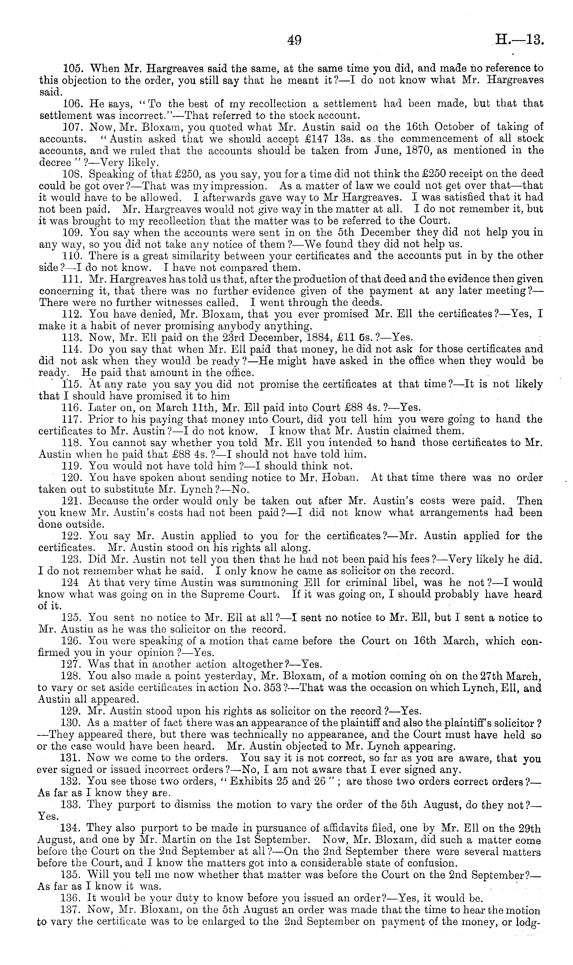 105. When Mr. Hargreaves said the same, at the same time you did, and made no reference to this objection to the order, you still say that he meant it ?—I do not know what Mr. Hargreaves said. 106. He says, " To the best of my recollection a settlement had been made, but that that settlement was incorrect." —That referred to the stock account. 107. Now, Mr. Bloxam, you quoted what Mr. Austin said on the 16th October of taking of accounts. "Austin asked that we should accept £147 13s. as.the commencement of all stock accounts, and we ruled that the accounts should be taken from June, 1870, as mentioned in the decree " ?—Very likely. 108. Speaking of that £250, as you say, you for a time did not think the £250 receipt on the deed could be got over?— That was my impression. As a matter of law we could not get over that—that it would have to be allowed. I afterwards gave way to Mr Hargreaves. I was satisfied that it had not been paid. Mr. Hargreaves would not give way in the matter at all. Ido not remember it, but it was brought to my recollection that the matter was to be referred to the Court. 109. You say when the accounts were sent in on the sth December they did not help you in any way, so you did not take any notice of them ? —We found they did not help us. 110. There is a great similarity between your certificates and the accounts put in by the other side?—l do not know. I have not compared them. 111. Mr. Hargreaves has told us that, after the production of that deed and the evidence then given concerning it, that there was no further evidence given of the payment at any later meeting ? — There were no further witnesses called. I went through the deeds. 112. You have denied, Mr. Bloxam, that you ever promised Mr. Ell the certificates?—-Yes, I make it a habit of never promising anybody anything. 113. Now, Mr. Ell paid on the 23rd December, 1884, £11 Cs. ?—Yes. 114. Do you say that when Mr. Ell paid that money, he did not ask for those certificates and did not ask when they would be ready ? —He might have asked in the office when they would be ready. He paid that amount in the office. 115. At any rate you say you did not promise the certificates at that time?—lt is not likely that I should have promised it to him 116. Later on, on March 11th, Mr. Ell paid into Court £88 4s. ?—Yes. 117. Prior to his paying that money into Court, did you tell him you were going to hand the certificates to Mr. Austin ?—I do not know. I know that Mr. Austin claimed them. 118. You cannot say whether you told Mr. Ell you intended to hand those certificates to Mr. Austin when he paid that £88 4s. ? —I should not have told him. 119. You would not have told him ? —I should think not. 120. You have spoken about sending notice to Mr, Hoban. At that time there was no order taken out to substitute Mr. Lynch ?—No. 121. Because the order would only be taken out after Mr. Austin's costs were paid. Then you knew Mr. Austin's costs had not been paid?—l did not know what arrangements had been done outside. 122. You say Mr. Austin applied to you for the certificates?— Mr. Austin applied for the certificates. Mr. Austin stood on his rights all along. 123. Did Mr. Austin not tell you then that he had not been paid his fees ? —Very likely he did. Ido not remember what he said. I only know he came as solicitor on the record. 124 At that very time Austin was summoning Ell for criminal libel, was he not ?—I would know what was going on in the Supreme Court. If it was going on, I should probably have heard of it. 125. You sent no notice to Mr. Ell at all?—I sent no notice to Mr. Ell, but I sent a notice to Mr. Austin as he was the solicitor on the record. 126. You were speaking of a motion that came before the Court on 16th March, which confirmed you in your opinion ?—Yes. 127. Was that in another action altogether?— Yes. 128. You also made a point yesterday, Mr. Bloxam, of a motion coming on on the 27th March, to vary or set aside certificates inaction No. 353? —That was the occasion on which Lynch, Ell, and Austin all appeared. 129. Mr. Austin stood upon his rights as solicitor on the record ?—Yes. 130. As a matter of fact there was an appearance of the plaintiff and also the plaintiff's solicitor ? —They appeared there, but there was technically no appearance, and the Court must have held so or the case would have been heard. Mr. Austin objected to Mr. Lynch appearing. 131. Now we come to the orders. You say it is not correct, so far as you are aware, that you ever signed or issued incorrect orders ?—-No, I am not aware that I ever signed any. 132. You see those two orders, " Exhibits 25 and 26 " ; are those two orders correct orders?— As far as I know they are. 133. They purport to dismiss the motion to vary the order of the sth August, do they not?—■ Yes. 134. They also purport to be made in pursuance of affidavits filed, one by Mr. Ell on the 29th August, and one by Mr. Martin on the Ist September. Now, Mr. Bloxam, did such a matter come before the Court on the 2nd September at all ?—On the 2nd September there were several matters before the Court, and I know the matters got into a considerable state of confusion. 135. Will you tell me now whether that matter was before the Court on the 2nd September?— As far as I know it was. 136. It would be your duty to know before you issued an order?— Yes, it would be. 137. Now, Mr. Bloxam, on the sth August an order was made that the time to hear the motion to vary the certificate was to be enlarged to the 2nd September on payment of the money, or lodg-