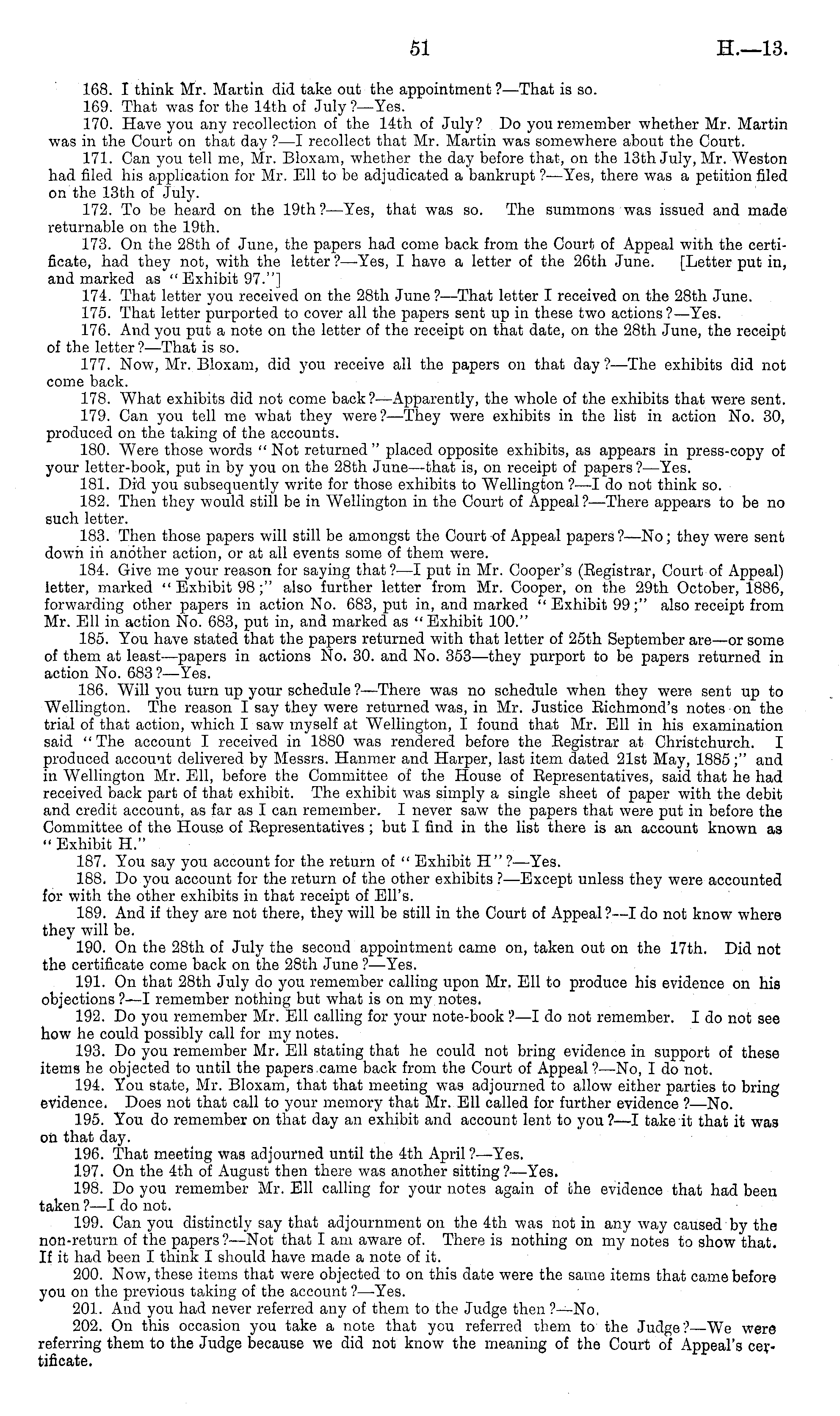 168. Ithink Mr. Martin did take out the appointment?— That is so. 169. That was for the 14th of July ?—Yes. 170. Have you any recollection of the 14th of July? Do you remember whether Mr. Martin was in the Court on that day ?—I recollect that Mr. Martin was somewhere about the Court. 171. Can you tell me, Mr. Bloxam, whether the day before that, on the 13th July, Mr. Weston had filed his application for Mr. Ell to be adjudicated a bankrupt ?—Yes, there was a petition filed on the 13th of July. 172. To be heard on the 19th ?—Yes, that was so. The summons was issued and made returnable on the 19th. 173. On the 28th of June, the papers had come back from the Court of Appeal with the certificate, had they not, with the letter ?—Yes, I have a letter of the 26th June. [Letter put in, and marked as " Exhibit 97."] 174. That letter you received on the 28th June ?—That letter I received on the 28th June. 175. That letter purported to cover all the papers sent up in these two actions?— Yes. 176. And you put a note on the letter of the receipt on that date, on the 28th June, the receipt of the letter?— That is so. 177. Now, Mr. Bloxam, did you receive all the papers on that day ?—The exhibits did not come back. 178. What exhibits did not come back?— Apparently, the whole of the exhibits that were sent. 179. Can you tell me what they were? —They were exhibits in the list in action No. 30, produced on the taking of the accounts. 180. Were those words " Not returned " placed opposite exhibits, as appears in press-copy of your letter-book, put in by you on the 28th June—that is, on receipt of papers ? —Yes. 181. Did you subsequently write for those exhibits to Wellington ?—I do not think so. 182. Then they would still be in Wellington in the Court of Appeal ?—There appears to be no such letter. 183. Then those papers will still be amongst the Court of Appeal papers ?—No; they were sent down in another action, or at all events some of them were. 184. Give me your reason for saying that ?—I put in Mr. Cooper's (Eegistrar, Court of Appeal) letter, marked " Exhibit 98 ;" also further letter from Mr. Cooper, on the 29th October, 1886, forwarding other papers in action No. 683, put in, and marked " Exhibit 99;" also receipt from Mr. Ell in action No. 683, put in, and marked as "Exhibit 100." 185. You have stated that the papers returned with that letter of 25th September are —or some of them at least—papers in actions No. 30. and No. 353—they purport to be papers returned in action No. 683 ?—Yes. 186. Will you turn up your schedule ?—There was no schedule when they were sent up to Wellington. The reason I say they were returned was, in Mr. Justice Eichmond's notes on the trial of that action, which I saw myself at Wellington, I found that Mr. Ell in his examination said " The account I received in 1880 was rendered before the Eegistrar at Christchurch. I produced account delivered by Messrs. Hanmer and Harper, last item dated 21st May, 1885;" and in Wellington Mr. Ell, before the Committee of the House of Eepresentatives, said that he had received back part of that exhibit. The exhibit was simply a single sheet of paper with the debit and credit account, as far as I can remember. I never saw the papers that were put in before the Committee of the House of Eepresentatives ; but I find in the list there is an account known as " Exhibit H." 187. You say you account for the return of " Exhibit H" ?—Yes. 188. Do you account for the return of the other exhibits ?—Except unless they were accounted for with the other exhibits in that receipt of Ell's. 189. And if they are not there, they will be still in the Court of Appeal?—l do not know where they will be. 190. On the 28th of July the second appointment came on, taken out on the 17th. Did not the certificate come back on the 28th June ? —Yes. 191. On that 28th July do you remember calling upon Mr. Ell to produce his evidence on his objections ?—I remember nothing but what is on my notes. 192. Do you remember Mr. Ell calling for your note-book ?—I do not remember. Ido not see how he could possibly call for my notes. 193. Do you remember Mr. Ell stating that he could not bring evidence in support of these items he objected to until the papers came back from the Court of Appeal ?—No, I do not. 194. You state, Mr. Bloxam, that that meeting was adjourned to allow either parties to bring evidence. Does not that call to your memory that Mr. Ell called for further evidence ?—No. 195. You do remember on that day an exhibit and account lent to you?—l take it that it was on that day. 196. That meeting was adjourned until the 4th April?— Yes. 197. On the 4th of August then there was another sitting?— Yes. 198. Do you remember Mr. Ell calling for your notes again of the evidence that had been taken ?—-I do not. 199. Can you distinctly say that adjournment on the 4th was not in any way caused by the non-return of the papers?— Not that lam aware of. There is nothing on my notes to show that. If it had been I think I should have made a note of it. 200. Now, these items that were objected to on this date were the same items that came before you on the previous taking of the account ? —Yes. 201. And you had never referred any of them to the Judge then ?—No, 202. On this occasion you take a note that you referred them to the Judge?—We were referring them to the Judge because we did not know the meaning of the Court of Appeal's certificate.