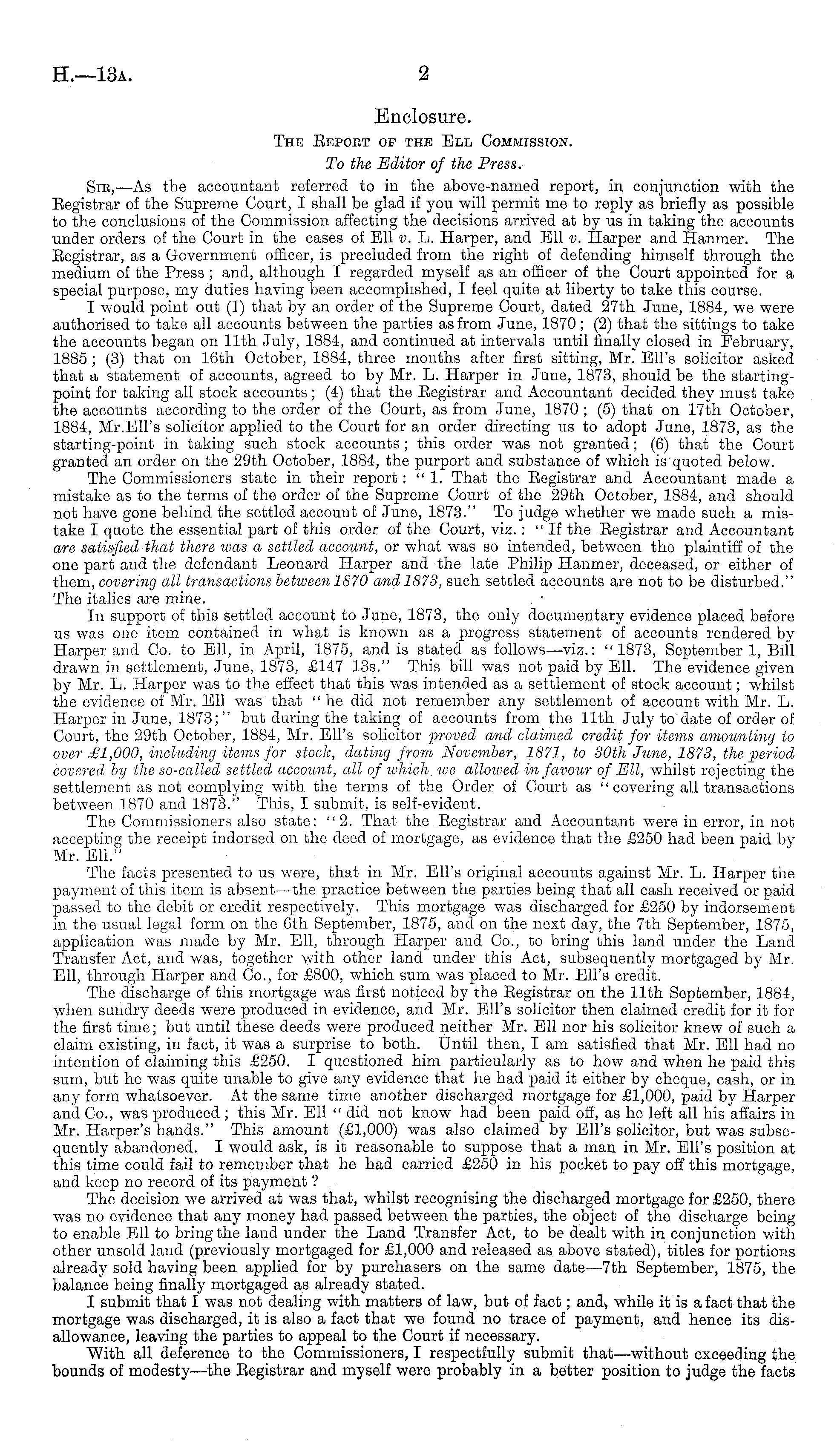 Enclosure. The Eepobt op the Ell Commission. To the Editor of the Press. Sib, —As the accountant referred to in the above-named report, in conjunction with the Eegistrar of the Supreme Court, I shall be glad if you will permit me to reply as briefly as possible to the conclusions of the Commission affecting the decisions arrived at by us in taking the accounts under orders of the Court in the cases of Ell V. L. Harper, and Ell v. Harper and Hanmer. The Eegistrar, as a Government officer, is precluded from the right of defending himself through the medium of the Press ; and, although I regarded myself as an officer of the Court appointed for a special purpose, my duties having been accomplished, I feel quite at liberty to take this course. I would point out (1) that by an order of the Supreme Court, dated 27th June, 1884, we were authorised to take all accounts between the parties as from June, 1870; (2) that the sittings to take the accounts began on 11th July, 1884, and continued at intervals until finally closed in February, 1885 ; (3) that on 16th October, 1884, three months after first sitting, Mr. Ell's solicitor asked that a statement of accounts, agreed to by Mr. L. Harper in June, 1873, should be the startingpoint for taking all stock accounts; (4) that the Eegistrar and Accountant decided they must take the accounts according to the order of the Court, as from June, 1870 ; (5) that on 17th October, 1884, Mr.Ell's solicitor applied to the Court for an order directing us to adopt June, 1873, as the starting-point in taking such stock accounts; this order was not granted; (6) that the Court granted an order on the 29th October, 1884, the purport and substance of which is quoted below. The Commissioners state in their report : " 1. That the Eegistrar and Accountant made a mistake as to the terms of the order of the Supreme Court of the 29th October, 1884, and should not have gone behind the settled account of June, 1873." To judge whether we made such a mistake I quote the essential part of this order of the Court, viz. : "If the Eegistrar and Accountant are satisfied that there ivas a settled account, or what was so intended, between the plaintiff of the one part and the defendant Leonard Harper and the late Philip Hanmer, deceased, or either of them, covering all transactions between 1870 and 1873, such settled accounts are not to be disturbed." The italics are mine. In support of this settled account to June, 1873, the only documentary evidence placed before us was one item contained in what is known as a progress statement of accounts rendered by Harper and Co. to Ell, in April, 1875, and is stated as follows—viz.: "1873, September 1, Bill drawn in settlement, June, 1873, £147 135." This bill was not paid by Ell. The evidence given by Mr. L. Harper was to the effect that this was intended as a settlement of stock account; whilst the evidence of Mr. Ell was that " he did not remember any settlement of account with Mr. L. Harper in June, 1873;" but during the taking of accounts from the 11th July to date of order of Court, the 29th October, 1884, Mr. Ell's solicitor -proved and claimed credit for items amounting to over £1,000, including items for stock, dating from November, 1871, to 30th June, 1873, the period covered by the so-called settled account, all of which, ice allowed in favour of Ell, whilst rejecting the settlement as not complying with the terms of the Order of Court as " covering all transactions between 1870 and 1873." This, I submit, is self-evident. The Commissioners also state: "2. That the Eegistrar and Accountant were in error, in not accepting the receipt indorsed on the deed of mortgage, as evidence that the £250 had been paid by Mr. Ell." The facts presented to us were, that in Mr. Ell's original accounts against Mr. L. Harper the payment of this item is absent—the practice between the parties being that all cash received or paid passed to the debit or credit respectively. This mortgage was discharged for £250 by indorsement in the usual legal form on the 6th September, 1875, and on the next day, the 7th September, 1875, application was made by Mr. Ell, through Harper and Co., to bring this land under the Land Transfer Act, and was, together with other land under this Act, subsequently mortgaged by Mr. Ell, through Harper and Co., for £800, which sum was placed to Mr. Ell's credit. The discharge of this mortgage was first noticed by the Eegistrar on the 11th September, 1884, when sundry deeds were produced in evidence, and Mr. Ell's solicitor then claimed credit for it for the first time; but until these deeds were produced neither Mr. Ell nor his solicitor knew of such a claim existing, in fact, it was a surprise to both. Until then, lam satisfied that Mr. Ell had no intention of claiming this £250. I questioned him particularly as to how and when he paid this sum, but he was quite unable to give any evidence that he had paid it either by cheque, cash, or in any form whatsoever. At the same time another discharged mortgage for £1,000, paid by Harper and Co., was produced ; this Mr. Ell " did not know had been paid off, as he left all his affairs in Mr. Harper's hands." This amount (£1,000) was also claimed by Ell's solicitor, but was subsequently abandoned. I would ask, is it reasonable to suppose that a man in Mr. Ell's position at this time could fail to remember that he had carried £250 in his pocket to pay off this mortgage, and keep no record of its payment ? The decision we arrived at was that, whilst recognising the discharged mortgage for £250, there was no evidence that any money had passed between the parties, the object of the discharge being to enable Ell to bring the land under the Land Transfer Act, to be dealt with in conjunction with other unsold land (previously mortgaged for £1,000 and released as above stated), titles for portions already sold having been applied for by purchasers on the same date—7th September, 1875, 