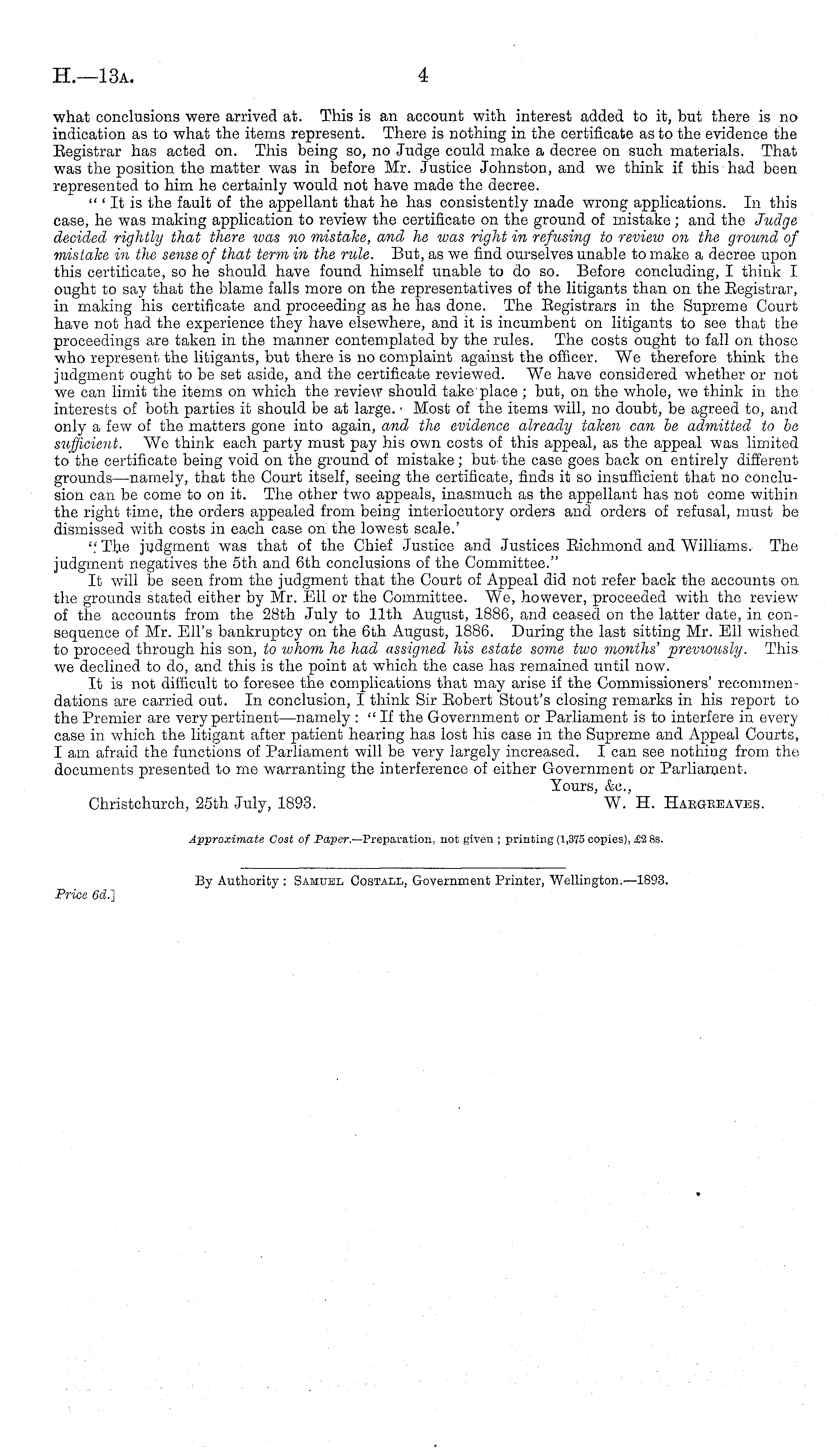 what conclusions were arrived at. This is an account with interest added to it, but there is no indication as to what the items represent. There is nothing in the certificate as to the evidence the Eegistrar has acted on. This being so, no Judge could make a decree on such materials. That was the position the matter was in before Mr. Justice Johnston, and we think if this had been represented to him he certainly would not have made the decree. "'lt is the fault of the appellant that he has consistently made wrong applications. In this case, he was making application to review the certificate on the ground of mistake; and the Judge decided rightly that there was no mistake, and he was right in refusing to review on the ground of mistake in the sense of that term in the rule. But, as we find ourselves unable to make a decree upon this certificate, so he should have found himself unable to do so. Before concluding, I think I ought to say that the blame falls more on the representatives of the litigants than on the Eegistrar, in making his certificate and proceeding as he has done. The Begistrars in the Supreme Court have not had the experience they have elsewhere, and it is incumbent on litigants to see that the proceedings are taken in the manner contemplated by the rules. The costs ought to fall on those who represent the litigants, but there is no complaint against the officer. We therefore think the judgment ought to be set aside, and the certificate reviewed. We have considered whether or not we can limit the items on which the review should take , place ; but, on the whole, we think in the interests of both parties it should be at large. ■ Most of the items will, no doubt, be agreed to, and only a few of the matters gone into again, and the evidence already taken can be admitted to be sufficient. We think each party must pay his own costs of this appeal, as the appeal was limited to the certificate being void on the ground of mistake; but the case goes back on entirely different grounds—namely, that the Court itself, seeing the certificate, finds it so insufficient that no conclusion can be come to on it. The other two appeals, inasmuch as the appellant has not come within the right time, the orders appealed from being interlocutory orders and orders of refusal, must be dismissed with costs in each case on the lowest scale.' '.' The judgment was that of the Chief Justice and Justices Eichmond and Williams. The judgment negatives the sth and 6th conclusions of the Committee." It will be seen from the judgment that the Court of Appeal did not refer back the accounts on. the grounds stated either by Mr. Ell or the Committee. We, however, proceeded with the review of the accounts from the 28th July to 11th August, 1886, and ceased on the latter date, in consequence of Mr. Ell's bankruptcy on the 6th August, 1886. During the last sitting Mr. Ell wished to proceed through his son, to whom he had assigned his estate some two months' previously. This we declined to do, and this is the point at which the case has remained until now. It is not difficult to foresee the complications that may arise if the Commissioners' recommendations are carried out. In conclusion, I think Sir Eobert Stout's closing remarks in his report to the Premier are very pertinent—namely : " If the Government or Parliament is to interfere in every case in which the litigant after patient hearing has lost his case in the Supreme and Appeal Courts, lam afraid the functions of Parliament will be very largely increased. I can see nothing from the documents presented to me warranting the interference of either Government or Parliament. Yours, &c, Christchurch, 25th July, 1893. W. H. Haegbbavbs. Approximate Cost of Paper.— Preparation, not given ; printing (1,375 copies), £2 Bs.