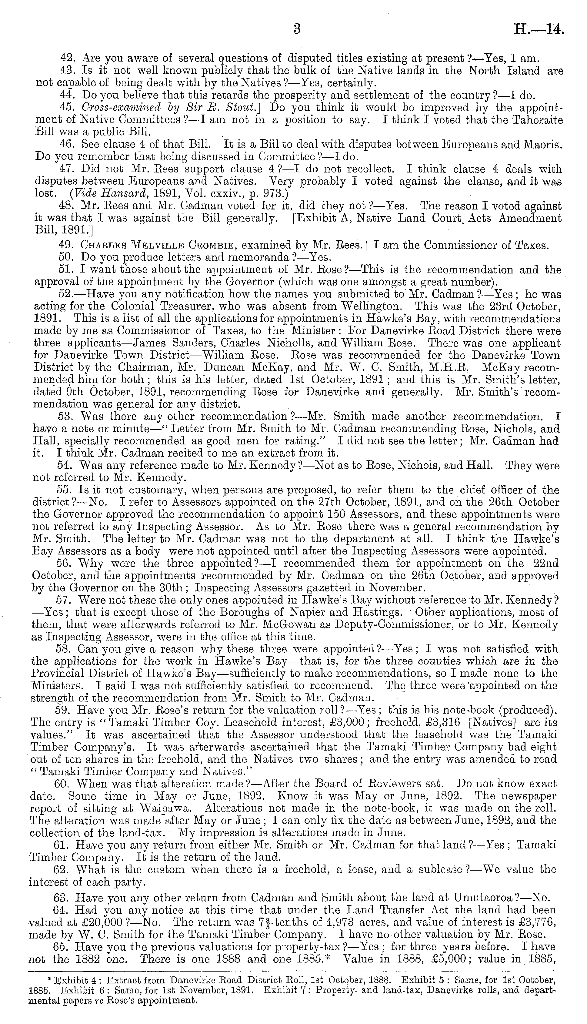 42. Are you aware of several questions of disputed titles existing at present ?—Yes, I am. 43. Is it not well known publicly that the bulk of the Native lands in the North Island are not capable of being dealt with by the Natives ? —Yea, certainly. 44. Do you believe that this retards the prosperity and settlement of the country? —I do. 45. Cross-examined by Sir 11. Stout.] Do you think it would be improved by the appointment of Native Committees ? —I am not in a position to say. I think I voted that the Tahoraite Bill was a public Bill. 46. See clause 4of that Bill. It is a Bill to deal with disputes between Europeans and Maoris. Do you remember that being discussed in Committee?—l do. 47. Did not Mr. Eees support clause 4 ?—I do not recollect. I think clause 4 deals with disputes between Europeans and Natives. Very probably I voted against the clause, and it was lost. (Vide Hansard, 1891, Vol. cxxiv., p. 973.) 48. Mr. Eees and Mr. Cadman voted for it, did they not ?—Yes. The reason I voted against it was that I was against the Bill generally. [Exhibit A, Native Land Court Acts Amendment Bill, 1891.] 49. Chaeles Melville Ceombie, examined by Mr. Eees.] I am the Commissioner of Taxes. 50. Do you produce letters and memoranda ?—Yes. 51. I want those about the appointment of Mr. Eose?—This is the recommendation and the approval of the appointment by the Governor (which was one amongst a great number). 52.—Have you any notification how the names you submitted to Mr. Cadman ?—Yes; he was acting for the Colonial Treasurer, who was absent from Wellington. This was the 23rd October, 1891. This is a list of all the applications for appointments in Hawke's Bay, with recommendations made by me as Commissioner of Taxes, to the Minister : For Danevirke Eoad District there were three applicants—James Sanders, Charles Nicholls, and William Eose. There was one applicant for Danevirke Town District—William Eose. Eose was recommended for the Danevirke Town District by the Chairman, Mr. Duncan McKay, and Mr. W. C. Smith, M.H.E. McKay recommended him for both ; this is his letter, dated Ist October, 1891; and this is Mr. Smith's letter, dated 9th October, 1891, recommending Eose for Danevirke and generally. Mr. Smith's recommendation was general for any district. 53. Was there any other recommendation ?—Mr. Smith made another recommendation. I have a note or minute—" Letter from Mr. Smith to Mr. Cadman recommending Eose, Nichols, and Hall, specially recommended as good men for rating." I did not see the letter; Mr. Cadman had it. I think Mr. Cadman recited to me an extract from it. 54. Was any reference made to Mr. Kennedy ? —Not as to Eose, Nichols, and Hall. They were not referred to Mr. Kennedy. 55. Is it not customary, when persons are proposed, to refer them to the chief officer of the district ?—No. I refer to Assessors appointed on the 27th October, 1891, and on the 26th October the Governor approved the recommendation to appoint 150 Assessors, and these appointments were not referred to any Inspecting Assessor. As to Mr. Eose there was a general recommendation by Mr. Smith. The letter to Mr. Cadman was not to the department at all. I think the Hawke's Eay Assessors as a body were not appointed until after the Inspecting Assessors were appointed. 56. Why were the three appointed?—l recommended them for appointment on the 22nd October, and the appointments recommended by Mr. Cadman on the 26th October, and approved by the Governor on the 30th; Inspecting Assessors gazetted in November. 57. Were not these the only ones appointed in Hawke's Bay without reference to Mr. Kennedy? —Yes; that is except those of the Boroughs of Napier and Hastings. Other applications, most of them, that were afterwards referred to Mr. McGowan as Deputy-Commissioner, or to Mr. Kennedy as Inspecting Assessor, were in the office at this time. 58. Can you give a reason why these three were appointed ?—Yes; I was not satisfied with the applications for the work in Hawke's Bay —that is, for the three counties which are in the Provincial District of Hawke's Bay—sufficiently to make recommendations, so I made none to the Ministers. I said I was not sufficiently satisfied to recommend. The three were'appointed on the strength of the recommendation from Mr. Smith to Mr. Cadman. 59. Have you Mr. Eose's return for the valuation roll?— Yes ; this is his note-book (produced). The entry is "Tamaki Timber Coy. Leasehold interest, £3,000; freehold, £3,316 [Natives] are its values." It was ascertained that the Assessor understood that the leasehold was the Tamaki Timber Company's. It was afterwards ascertained that the Tamaki Timber Company had eight out of ten shares in the freehold, and the Natives two shares ; and the entry was amended to read " Tamaki Timber Company and Natives." 60. When was that alteration made?— After the Board of Eeviewers sat. Do not know exact date. Some time in May or June, 1892. Know it was May or June, 1892. The newspaper report of sitting at Waipawa. Alterations not made in the note-book, it was made on the roll. The alteration was made after May or June; I can only fix the date as between June, 1892, and the collection of the land-tax. My impression is alterations made in June. 61. Have you any return from either Mr. Smith or Mr. Cadman for that land ?—Yes ; Tamaki Timber Company. It is the return of the land. 62. What is the custom when there is a freehold, a lease, and a sublease ? —We value the interest of each party. 63. Have you any other return from Cadman and Smith about the land at Umutaoroa? —No. 64. Had you any notice at this time that under the Land Transfer Act the land had been valued at £20,000 ?—No. The return was 7|-tenths of 4,973 acres, and value of interest is £3,776, made by W. C. Smith for the Tamaki Timber Company. I have no other valuation by Mr. Eose. 65. Have you the previous valuations for property-tax ? —Yes ; for three ye