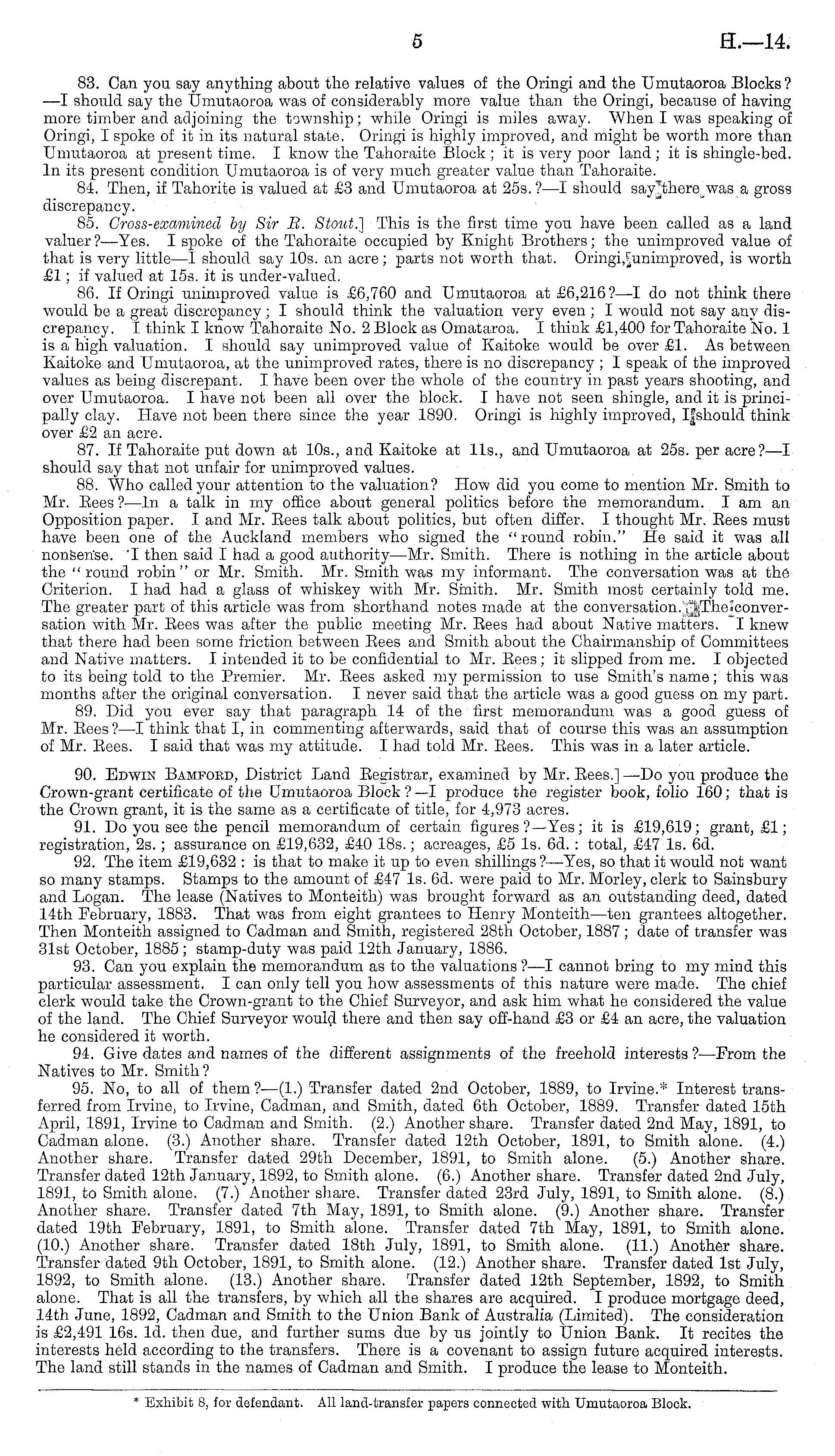83. Can you say anything about the relative values of the Oringi and the Umutaoroa Blocks ? —I should say the Umutaoroa was of considerably more value than the Oringi, because of having more timber and adjoining the township; while Oringi is miles away. When I was speaking of Oringi, I spoke of it in its natural state. Oringi is highly improved, and might be worth more than Umutaoroa at present time. I know the Tahoraite Block ;it is very poor land ; it is shingle-bed. In its present condition Umutaoroa is of very much greater value than Tahoraite. 84. Then, if Tahorite is valued at £3 and Umutaoroa at 255. ? —I should say'there was a gross discrepancy. 85. Cross-examined by Sir B. Stout.] This is the first time you have been called as a land valuer ?—Yes. I spoke of the Tahoraite occupied by Knight Brothers; the unimproved value of that is very little—l should say 10s. an acre; parts not worth that. is worth £1; if valued at 15s. it is under-valued. 86. If Oringi unimproved value is £6,760 and Umutaoroa at £6,216? —I do not think there would be a great discrepancy; I should think the valuation very even ; I would not say any discrepancy. I think I know Tahoraite No. 2 Block as Omataroa. I think £1,400 for Tahoraite No. 1 is a high valuation. I should say unimproved value of Kaitoke would be over £1. As between Kaitoke and Umutaoroa, at the unimproved rates, there is no discrepancy ; I speak of the improved values as being discrepant. I have been over the whole of the country in past years shooting, and over Umutaoroa. I have not been all over the block. I have not seen shingle, and it is principally clay. Have not been there since the year 1890. Oringi is highly improved, I|should think over £2 an acre. 87. If Tahoraite put down at 10s., and Kaitoke at 11s., and Umutaoroa at 255. per acre?—l should say that not unfair for unimproved values. 88. Who called your attention to the valuation? How did you come to mention Mr. Smith to Mr. Bees ?—ln a talk in my office about general politics before the memorandum. I am an Opposition paper. I and Mr. Eees talk about politics, but often differ. I thought Mr. Eees must have been one of the Auckland members who signed the "round robin." He said it was all nonserise. 'I then said I had a good authority—Mr. Smith. There is nothing in the article about the "round robin" or Mr. Smith. Mr. Smith was my informant. The conversation was at the Criterion. I had had a glass of whiskey with Mr. Smith. Mr. Smith most certainly told me. The greater part of this article was from shorthand notes made at the conversation.'ijThejiconversation with Mr. Eees was after the public meeting Mr. Eees had about Native matters. I knew that there had been some friction between Eees and Smith about the Chairmanship of Committees and Native matters. I intended it to be confidential to Mr. Eees; it slipped from me. I objected to its being told to the Premier. Mr. Eees asked my permission to use Smith's name; this was months after the original conversation. I never said that the article was a good guess on my part. 89. Did you ever say that paragraph 14 of the first memorandum was a good guess of Mr. Eees ?—I think that I, in commenting afterwards, said that of course this was an assumption of Mr. Eees. I said that was my attitude. I had told Mr. Eees. This was in a later article. 90. Edwin Bamfobd, District Land Eesistrar, examined by Mr. Eees.] —Do you produce the Crown-grant certificate of the Umutaoroa Block ?—I produce the register book, folio 160; that is the Crown grant, it is the same as a certificate of title, for 4,973 acres. 91. Do you see the pencil memorandum of certain figures?— Yes; it is £19,619; grant, £1; registration, 25.; assurance on £19,632, £40 18s.; acreages, £5 Is. 6d. : total, £47 Is. 6d. 92. The item £19,632 : is that to make it up to even shillings ?—Yes, so that it would not want so many stamps. Stamps to the amount of £47 Is. 6d. were paid to Mr. Morley, clerk to Sainsbury and Logan. The lease (Natives to Monteith) was brought forward as an outstanding deed, dated 14th February, 1883. That was from eight grantees to Henry Monteith—ten grantees altogether. Then Monteith assigned to Cadman and Smith, registered 28th October, 1887 ; date of transfer was 31st October, 1885; stamp-duty was paid 12th January, 1886. 93. Can you explain the memorandum as to the valuations ?—I cannot bring to my mind this particular assessment. I can only tell you how assessments of this nature were made. The chief clerk would take the Crown-grant to the Chief Surveyor, and ask him what he considered the value of the land. The Chief Surveyor would there and then say off-hand £3 or £4 an acre, the valuation he considered it worth. 94. Give dates and names of the different assignments of the freehold interests ? —From the Natives to Mr. Smith ? 95. No, to all of them ? —(1.) Transfer dated 2nd October, 1889, to Irvine.* Interest transferred from Irvine, to Irvine, Cadman, and Smith, dated 6th October, 1889. Transfer dated 15th April, 1891, Irvine to Cadman and Smith. (2.) Another share. Transfer dated 2nd May, 1891, to Cadman alone. (3.) Another share. Transfer dated 12th October, 1891, to Smith alone. (4.) Another share. Transfer dated 29th December, 1891, to Smith alone. (5.) Another share. Transfer dated 12th January, 1892, to Smith alone. (6.) Another share. Transfer dated 2nd July, 1891, to Smith alone. (7.) Another share. Transfer dated 23rd July, 1891, to Smith alone. (8.) Another share. Transfer dated 7th May, 1891, to Smith alone. (9.) Another share. Transfer dated 19th February, 1891, to Smith alone. Transfer dated 7th May, 1891, to Smith alone. (10.) Another share. Transfer dated 18th July, 1891, to Smith alone. (11.) Another share. Transfer dated 9th October, 1891, to Smith alone. (12.) Another share. Transfer dated Ist July, 1892, to Smith alone. (13.) Another share. Transfer dated 12th September, 1892, to Smith a