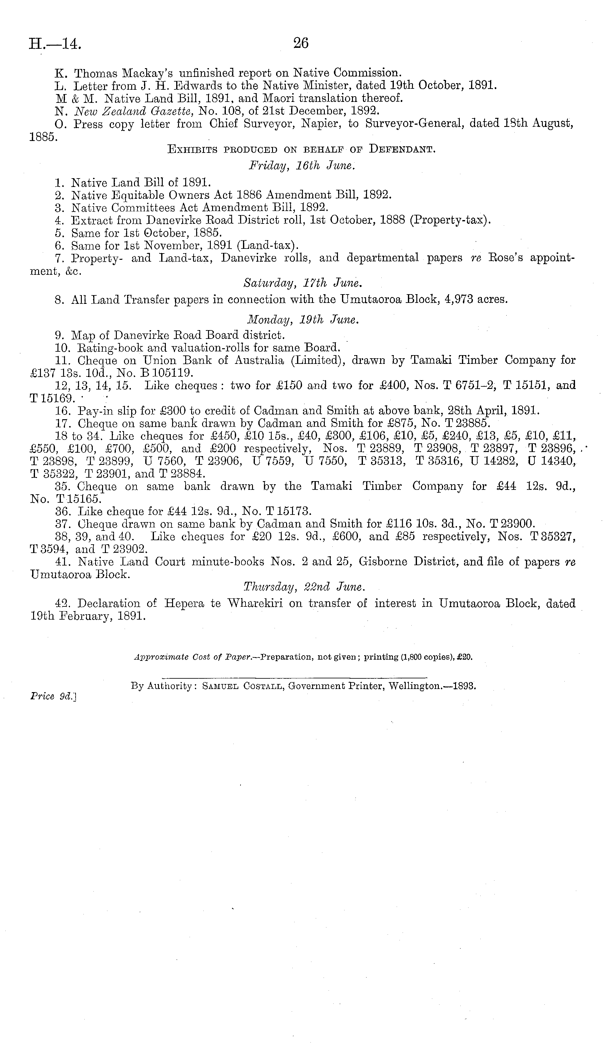 K. Thomas Mackay's unfinished report on Native Commission. L. Letter from J. H. Edwards to the Native Minister, dated 19th October, 1891. M & M. Native Land Bill, 1891, and Maori translation thereof. N. New Zealand Gazette, No. 108, of 21st December, 1892. 0. Press copy letter from Chief Surveyor, Napier, to Surveyor-General, dated 18th August, 1885. Exhibits produced on behalf of Defendant. Friday, 16th June. 1. Native Land Bill of 1891. 2. Native Equitable Owners Act 1886 Amendment Bill, 1892. 3. Native Committees Act Amendment Bill, 1892. 4. Extract from Danevirke Eoad District roll, Ist October, 1888 (Property-tax). 5. Same for Ist October, 1885. 6. Same for Ist November, 1891 (Land-tax). 7. Property- and Land-tax, Danevirke rolls, and departmental papers re Eose's appointment, &c. Saturday, 17th June. 8. All Land Transfer papers in connection with the Umutaoroa Block, 4,973 acres. Monday, 19th June. 9. Map of Danevirke Eoad Board district. 10. Eating-book and valuation-rolls for same Board. 11. Cheque on Union Bank of Australia (Limited), drawn by Tamaki Timber Company for £137 13s. 10d., No. B 105119. 12. 13, 14, 15. Like cheques : two for £150 and two for £400, Nos. T 6751-2, T 15151, and T1516-9. ■ 16. Pay-in slip for £300 to credit of Cadman and Smith at above bank, 28th April, 1891. 17. Cheque on same bank drawn by Cadman and Smith for £875, No. T 23885. 18 to 34. Like cheques for £450, £10 155., £40, £300, £106, £10, £5, £240, £13, £5, £10, £11, £550, £100, £700, £500, and £200 respectively, Nos. T 23889, T 23908, T 23897, T 23896, T 23898, T 23899, U 7560, T 23906, U 7559, U 7550, T 35313, T 35316, U 14282, U 14340, T 35322, T 23901, and T 23884. 35. Cheque on same bank drawn by the Tamaki Timber Company for £44 12s. 9d., No. T15165. 36. Like cheque for £44 12s. 9d., No. T15173. 37. Cheque drawn on same bank by Cadman and Smith for £116 10s. 3d., No. T 23900. 38. 39, and 40. Like cheques for £20 12s. 9d., £600, and £85 respectively, Nos. T 35327, T3594, and T 23902. 41. Native Land Court minute-books Nos. 2 and 25, Gisborne District, and file of papers re Umutaoroa Block. Thursday , 22nd June. 42. Declaration of Hepera te Wharekiri on transfer of interest in Umutaoroa Block, dated 19th February, 1891.