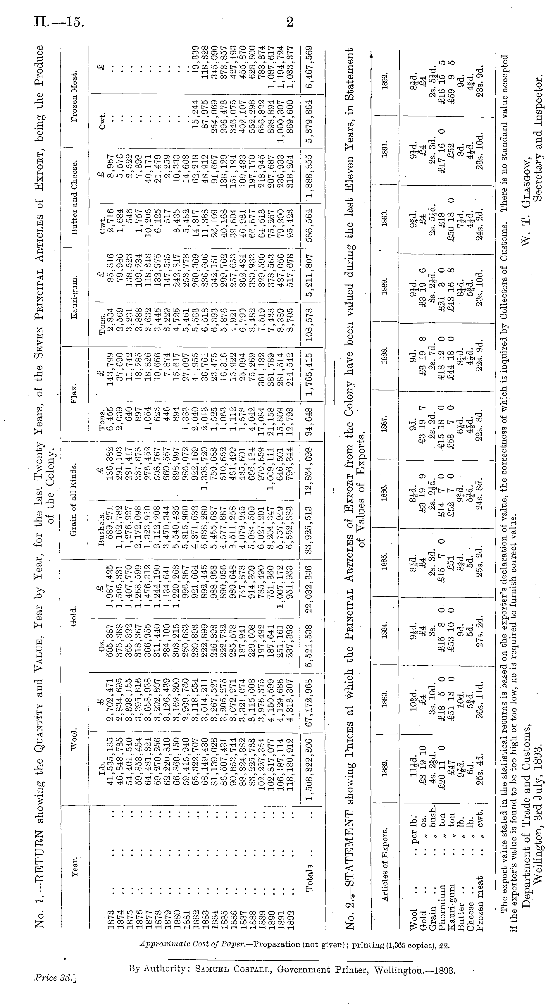 The export value stated in the statistical returns is based on the exporter's declaration of value, the correctness of which is inquired by Collectors of Customs. There is no standard value accepted if the exporter's value is found to be too high or too low, he is required to furnish correct value. Department of Trade and Customs, W. T. Glasgow, Wellington, 3rd July, 1893. Secretary and Inspector.