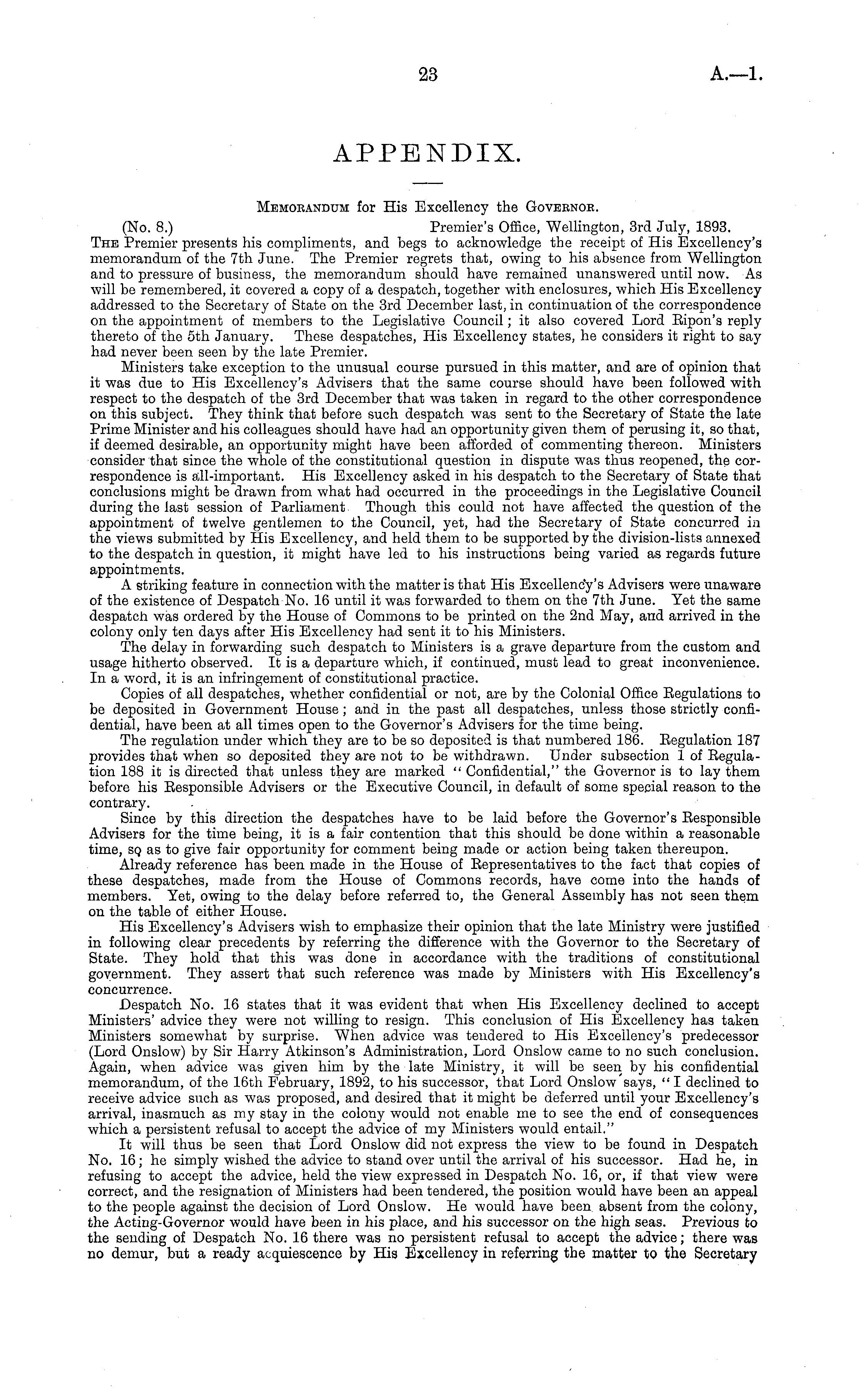 Memorandum for His Excellency the Governor. (No. 8.) Premier's Office, Wellington, 3rd July, 1893. The Premier presents his compliments, and begs to acknowledge the receipt of His Excellency's memorandum of the 7th June. The Premier regrets that, owing to his absence from Wellington and to pressure of business, the memorandum should have remained unanswered until now. As will be remembered, it covered a copy of a despatch, together with enclosures, which His Excellency addressed to the Secretary of State on the 3rd December last, in continuation of the correspondence on the appointment of members to the Legislative Council; it also covered Lord Bipon's reply thereto of the sth January. These despatches, His Excellency states, he considers it right to say had never been seen by the late Premier. Ministers take exception to the unusual course pursued in this matter, and are of opinion that it was due to His Excellency's Advisers that the same course should have been followed with respect to the despatch of the 3rd December that was taken in regard to the other correspondence on this subject. They think that before such despatch was sent to the Secretary of State the late Prime Minister and his colleagues should have had an opportunity given them of perusing it, so that, if deemed desirable, an opportunity might have been afforded of commenting thereon. Ministers consider that since the whole of the constitutional question in dispute was thus reopened, the correspondence is all-important. His Excellency asked in his despatch to the Secretary of State that conclusions might be drawn from what had occurred in the proceedings in the Legislative Council during the last session of Parliament Though this could not have affected the question of the appointment of twelve gentlemen to the Council, yet, had the Secretary of State concurred in the views submitted by His Excellency, and held them to be supported by the division-lists annexed to the despatch in question, it might have led to his instructions being varied as regards future appointments. A striking feature in connection with the matter is that His Excellency's Advisers were unaware of the existence of Despatch No. 16 until it was forwarded to them on the 7th June. Yet the same despatch was ordered by the House of Commons to be printed on the 2nd May, and arrived in the colony only ten days after His Excellency had sent it to his Ministers. The delay in forwarding such despatch to Ministers is a grave departure from the custom and usage hitherto observed. It is a departure which, if continued, must lead to great inconvenience. In a word, it is an infringement of constitutional practice. Copies of all despatches, whether confidential or not, are by the Colonial Office Eegulations to be deposited in Government House ; and in the past all despatches, unless those strictly confidential, have been at all times open to the Governor's Advisers for the time being. The regulation under which they are to be so deposited is that numbered 186. Begulation 187 provides that when so deposited they are not to be withdrawn. Under subsection lof Begulation 188 it is directed that unless they are marked " Confidential," the Governor is to lay them before his Besponsible Advisers or the Executive Council, in default of some special reason to the contrary. Since by this direction the despatches have to be laid before the Governor's Besponsible Advisers for the time being, it is a fair contention that this should be done within a reasonable time, so as to give fair opportunity for comment being made or action being taken thereupon. Already reference has been made in the House of Bepresentatives to the fact that copies of these despatches, made from the House of Commons records, have come into the hands of members. Yet, owing to the delay before referred to, the General Assembly has not seen them on the table of either House. His Excellency's Advisers wish to emphasize their opinion that the late Ministry were justified in following clear precedents by referring the difference with the Governor to the Secretary of State. They hold that this was done in accordance with the traditions of constitutional government. They assert that such reference was made by Ministers with His Excellency's concurrence. Despatch No. 16 states that it was evident that when His Excellency declined to accept Ministers' advice they were not willing to resign. This conclusion of His Excellency has taken Ministers somewhat by surprise. When advice was tendered to His Excellency's predecessor (Lord Onslow) by Sir Harry Atkinson's Administration, Lord Onslow came to no such conclusion. Again, when advice was given him by the late Ministry, it will be seen by his confidential memorandum, of the 16th February, 1892, to his successor, that Lord Onslow says, " I declined to receive advice such as was proposed, and desired that it might be deferred until your Excellency's arrival, inasmuch as my stay in the colony would not enable me to see the end of consequences which a persistent refusal to accept the advice of my Ministers would entail." It will thus be seen that Lord Onslow did not express the view to be found in Despatch No. 16; he simply wished the advice to stand over until the arrival of his successor. Had he, in refusing to accept the advice, held the view expressed in Despatch No. 16, or, if that view were correct, and the resignation of Ministers had been tendered, the position would have been an appeal to the people against the decision of Lord Onslow. He would have been absent from the colony, the Acting-Governor would have been in his place, and his successor on the high seas. Previous to the sending of Despatch No. 16 there was no persistent refusal to accept the advice; there was no demur, but a ready acquiescence by His Excellency in referring the matter to the Secretary