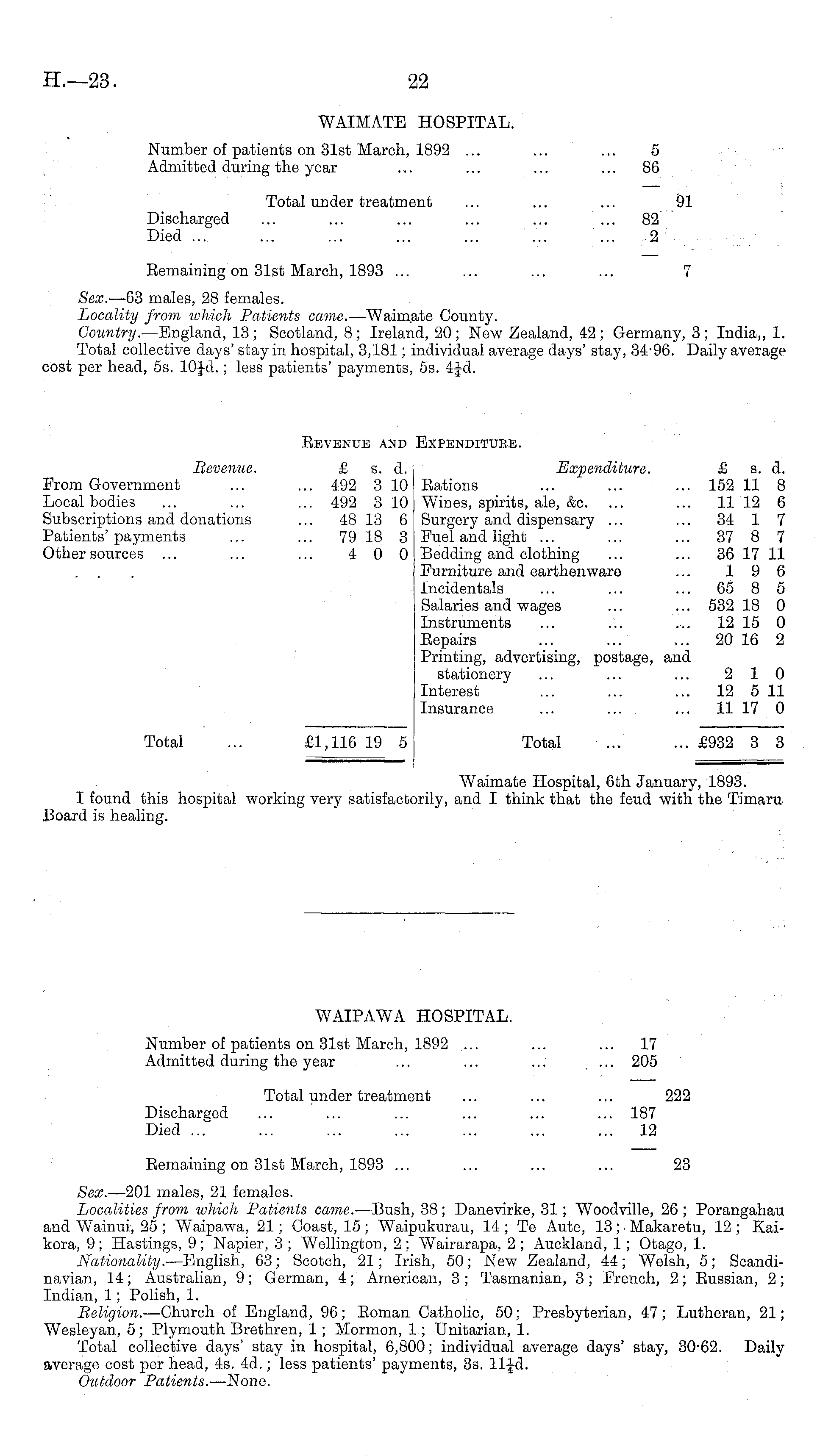 WAIMATE HOSPITAL. Number of patients on 31st March, 1892 ... ... ... 5 Admitted during the year ... ... ... ... 86 Total under treatment ... ... ... 91 Discharged ... ... ... ... ... ... 82 Died ... ... ... ... ... ... ... 2 Bemaining on 31st March, 1893 ... ... ... ... 7 Sex. —63 males, 28 females. Locality from which Patients came. —Waimate County. Country. —England, 13; Scotland, 8; Ireland, 20; New Zealand, 42; Germany, 3; India,, 1. Total collective days' stay in hospital, 3,181; individual average days' stay, 34-96. Daily average cost per head, ss. IOJd.; less patients' payments, ss. 4Jd. Bevenue and Expendituee. Bevenue. £ s. d. Expenditure. £ s. d. From Government ... ... 492 3 10 Bations ... ... ... 152 11 8 Local bodies ... ... ... 492 310 Wines, spirits, ale, &c. ... ... 11 12 6 Subscriptions and donations ... 48 13 6 Surgery and dispensary ... ... 34 1 7 Patients'payments ... ... 79 18 3 Fuel and light ... ... ... 37 8 7 Other sources ... ... ... 400 Bedding and clothing ... ... 36 17 11 Furniture and earthenware ... 196 Incidentals ... ... ... 65 8 5 Salaries and wages ... ... 532 18 0 Instruments ... ... ... 12 15 0 Bepairs ... ... ... 20 16 2 Printing, advertising, postage, and stationery ... ... ... 210 Interest ... ... ... 12 5 11 Insurance ... ... ... 11 17 0 Total ... £1,116 19 5 Total ... ... £932 3 3 Waimate Hospital, 6th January, 1893. I found this hospital working very satisfactorily, and I think that the feud with the Timaru Board is healing.