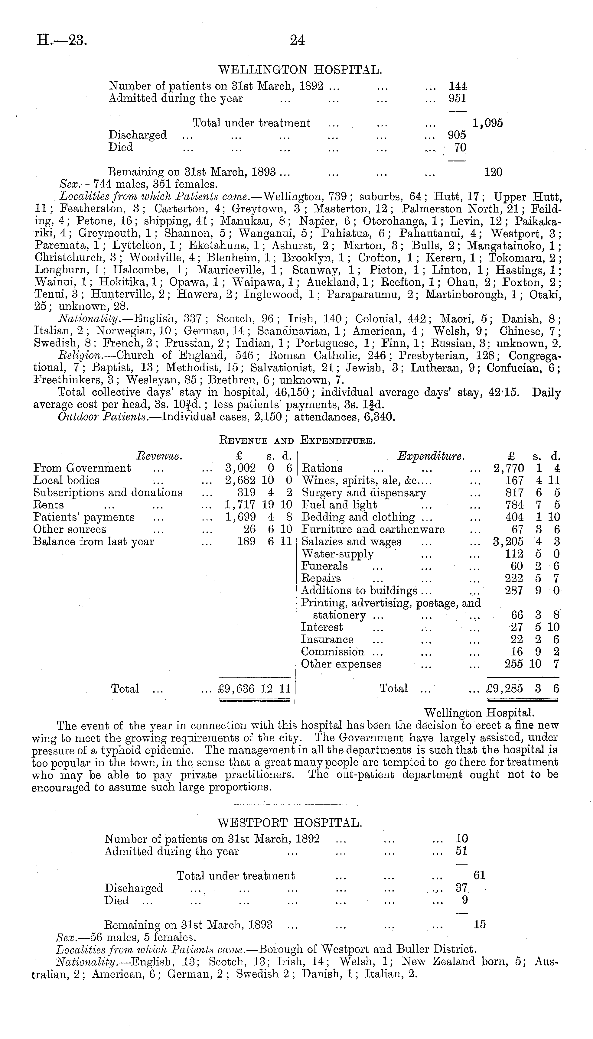 WELLINGTON HOSPITAL. Number of patients on 31st March, 1892 ... ... ... 144 Admitted during the year ... ... ... ... 951 Total under treatment ... ... ... 1,095 Discharged ... ... ... ... ... ... 905 Died ... ... ... ... ... 70 Bemaining on 31st March, 1893 ... ... ... ... 120 Sex. —744 males, 351 females. Localities from which Patients came. —Wellington, 739 ; suburbs, 64; Hutt, 17 ; Upper Hutt, 11; Featherston, 3; Carterton, 4; Greytown, 3; Masterton, 12; Palmerston North, 21; Feilding, 4; Petone, 16; shipping, 41; Manukau, 8; Napier, 6; Otorohanga, 1; Levin, 12; Paikakariki, 4; Greymouth, 1; Shannon, 5 ; Wanganui, 5; Pahiatua, 6 ; Pahautanui, 4; Westport, 3 ; Paremata, 1; Lyttelton, 1; Eketahuna, 1; Ashurst, 2 ; Marton, 3 ; Bulls, 2 ; Mangatainoko, 1; Christchurch, 3 ; Woodville, 4; Blenheim, 1; Brooklyn, 1; Crofton, 1; Kereru, 1; Tokomaru, 2 ; Longburn, 1; Halcombe, 1; Mauriceville, 1; Stanway, 1; Picton, 1; Linton, 1; Hastings, 1; Wainui, 1; Hokitika, 1; Opawa, 1; Waipawa, 1; Auckland, 1; Eeefton, 1; Ohau, 2; Foxton, 2; Tenui, 3 ; Hunterville, 2 ; Hawera, 2 ; Inglewood, 1; Paraparaumu, 2 ; Martinborough, 1; Otaki, 25; unknown, 28. Nationality.— English, 337 ; Scotch, 96 ; Irish, 140 ; Colonial, 442 ; Maori, 5 ; Danish, 8 ; Italian, 2 ; Norwegian, 10 ; German, 14 ; Scandinavian, 1; American, 4 ; Welsh, 9; Chinese, 7 ; Swedish, 8; French, 2; Prussian, 2; Indian, 1; Portuguese, 1; Finn, 1; Bussian, 3; unknown, 2. Beligion. —Church of England, 546 ; Boman Catholic, 246; Presbyterian, 128; Congregational, 7 ; Baptist, 13; Methodist, 15; Salvationist, 21; Jewish, 3; Lutheran, 9; Confucian, 6; Freethinkers, 3; Wesleyan, 85; Brethren, 6; unknown-, 7. Total collective days' stay in hospital, 46,150; individual average days' stay, 42-15. Daily average cost per head, 3s. 10-fd.; less patients' payments, 3s. lfd. Outdoor Patients. —Individual cases, 2,150 ; attendances, 6,340. Bevenue and Expendituee. Bevenue. £ s. d. [ Expenditure. £ s. d. From Government ... ... 3,002 0 6 ! Bations ... ... ... 2,770 1 4 Local bodies ... ... 2,682 10 0 Wines, spirits, ale, &c... ... 167 4 11 Subscriptions and donations ... 319 4 2 Surgery and dispensary ... 817 6 5 Bents ... ... ... 1,717 19 10 Fuel and light ... ... 784 7 5 Patients' payments ... ... 1,699 4 8 Bedding and clothing ... ... 404 110 Other sources ... ... 26 6 10 Furniture and earthenware ... 67 3 6 Balance from last year ... 189 611 j Salaries and wages ... ... 3,205 4 3 Water-supply ... ... 112 5 0 Funerals ... ... ... 60 2 6 Bepairs ... ... ... 222 5 7 Additions to buildings... ... 287 9 0 Printing, advertising, postage, and stationery ... ... ... 66 3 8 Interest ... ... ... 27 5 10 Insurance ... ... ... 22 2 6 i Commission ... ... ... 16 9 2 ■ Other expenses ... ... 255 10 7 Total ... ... £9,636 12 111 Total ... ... £9,285 3 6 Wellington Hospital. The event of the year in connection with this hospital has been the decision to erect a fine new wing to meet the growing requirements of the city. The Government have largely assisted, under pressure of a typhoid epidemic. The management in all the departments is such that the hospital is too popular in the town, in the sense that a great many people are tempted to go there for treatment who may be able to pay private practitioners. The out-patient department ought not to be encouraged to assume such large proportions.