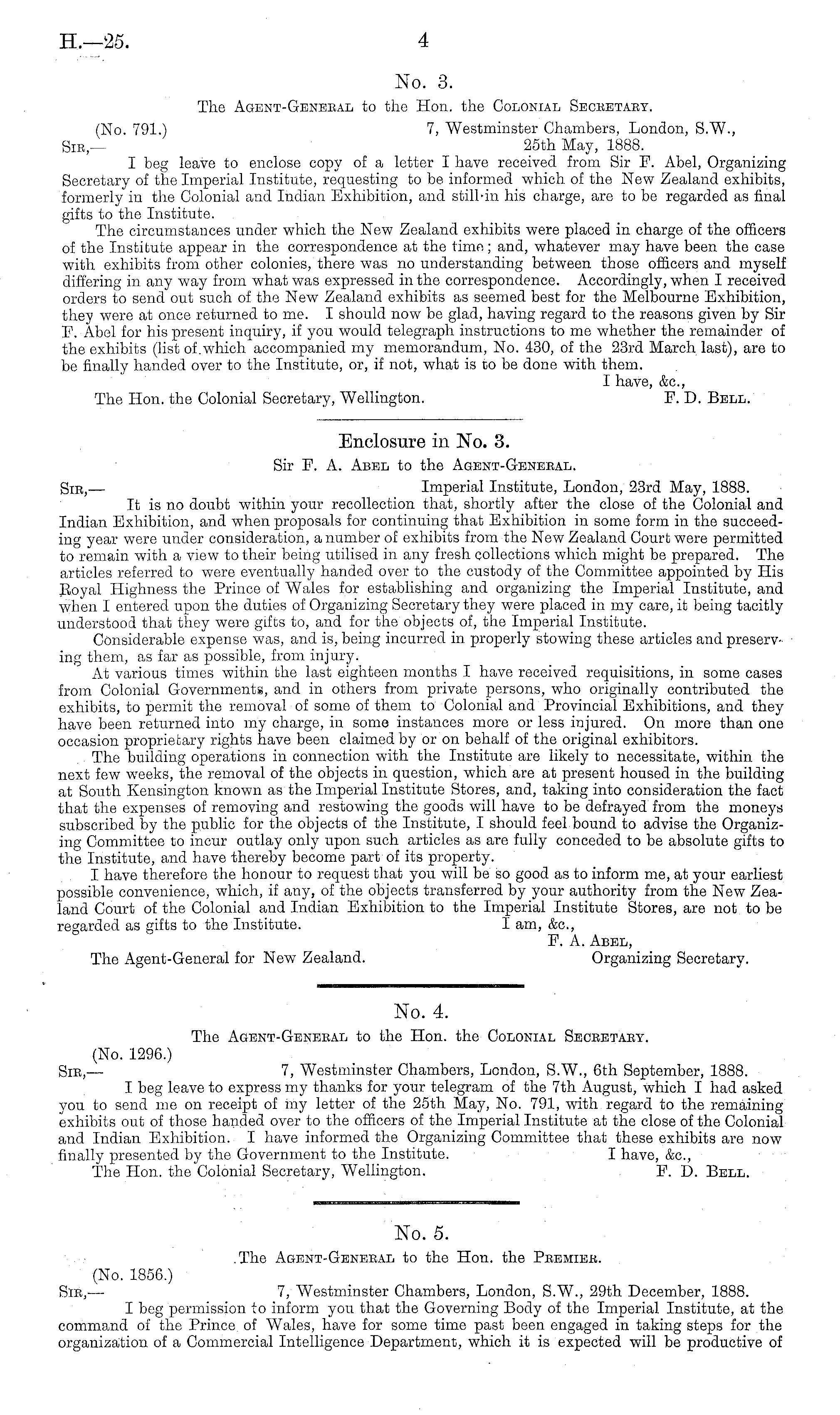 Enclosure in No. 3. Sir F. A. Abel to the Agent-Geneeal. Sic, — Imperial Institute, London, 23rd May, 1888. It is no doubt within your recollection that, shortly after the close of the Colonial and Indian Exhibition, and when proposals for continuing that Exhibition in some form in the succeeding year were under consideration, a number of exhibits from the New Zealand Court were permitted to remain with a view to their being utilised in any fresh collections which might be prepared. The articles referred to were eventually handed over to the custody of the Committee appointed by His Eoyal Highness the Prince of Wales for establishing and organizing the Imperial Institute, and when I entered upon the duties of Organizing Secretary they were placed in my care, it being tacitly understood that they were gifts to, and for the objects of, the Imperial Institute. Considerable expense was, and is, being incurred in properly stowing these articles and preserving them, as far as possible, from injury. At various times within the last eighteen months I have received requisitions, in some cases from Colonial Governments, and in others from private persons, who originally contributed the exhibits, to permit the removal of some of them to Colonial and Provincial Exhibitions, and they have been returned into my charge, in some instances more or less injured. On more than one occasion proprietary rights have been claimed by or on behalf of the original exhibitors. The building operations in connection with the Institute are likely to necessitate, within the next few weeks, the removal of the objects in question, which are at present housed in the building at South Kensington known as the Imperial Institute Stores, and, taking into consideration the fact that the expenses of removing and restowing the goods will have to be defrayed from the moneys subscribed by the public for the objects of the Institute, I should feel bound to advise the Organizing Committee to incur outlay only upon such articles as are fully conceded to be absolute gifts to the Institute, and have thereby become part of its property. I have therefore the honour to request that you will be so good as to inform me, at your earliest possible convenience, which, if any, of the objects transferred by your authority from the New Zealand Court of the Colonial and Indian Exhibition to the Imperial Institute Stores, are not to be regarded as gifts to the Institute. I am, &c, F. A. Abel, The Agent-General for New Zealand. Organizing Secretary.