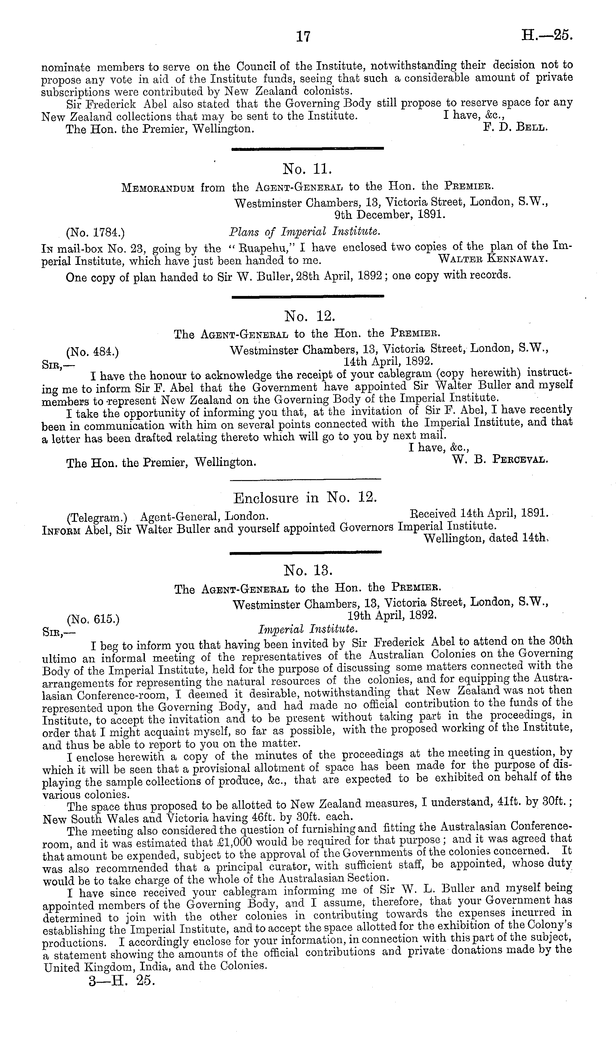 No. 12. The Agent-Geneeal to the Hon. the Peemiee. (No 484 ) Westminster Chambers, 13, Victoria Street, London, S.W., SlE ,_ " 14th April, 1892. I have the honour to acknowledge the receipt of your cablegram (copy herewith) instructing me to inform Sir F. Abel that the Government have appointed Sir Walter Buller and myself members to -represent New Zealand on the Governing Body of the Imperial Institute. I take the opportunity of informing you that, at the invitation of Sir F. Abel, I have recently been in communication with him on several points connected with the Imperial Institute, and that a letter has been drafted relating thereto which will go to you by next mail. I have, &c, The Hon. the Premier, Wellington. W. B. Peeceval.